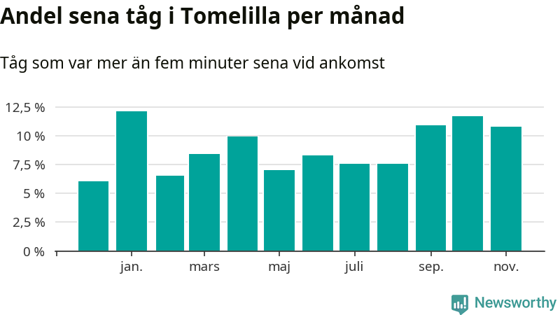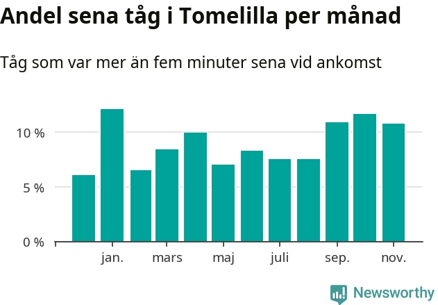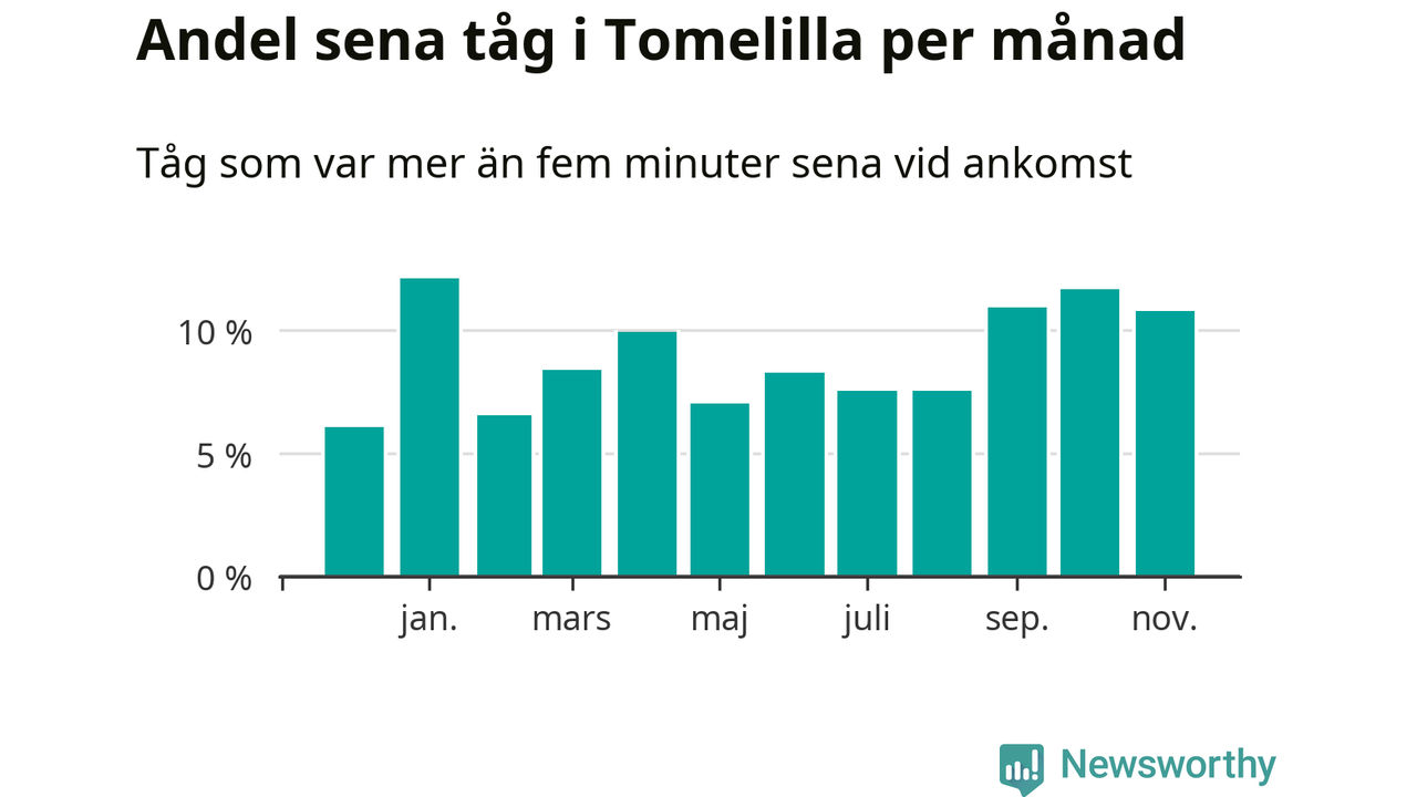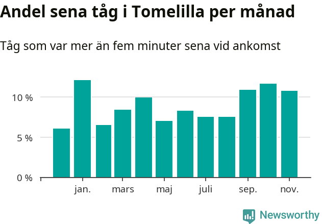 Den svenska järnvägsbranschen och Trafikverket har ett gemensamt mål om att 95 procent av tågen ska komma fram med högst fem minuters försening till sin slutstation. Tågtrafiken i Tomelilla låg på rätt sida om den gränsen sju av 52 veckor det senaste året, även om det officiella punktlighetsmåttet (ankomst till slutstation) inte är rakt av jämförbart med det som används i den här artikeln (där vi tittar på alla tåg som passerar en station).