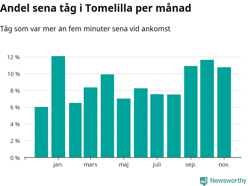 Den mest förseningsdrabbade månaden var januari, med i snitt tolv procent sena tåg enligt det måttet.