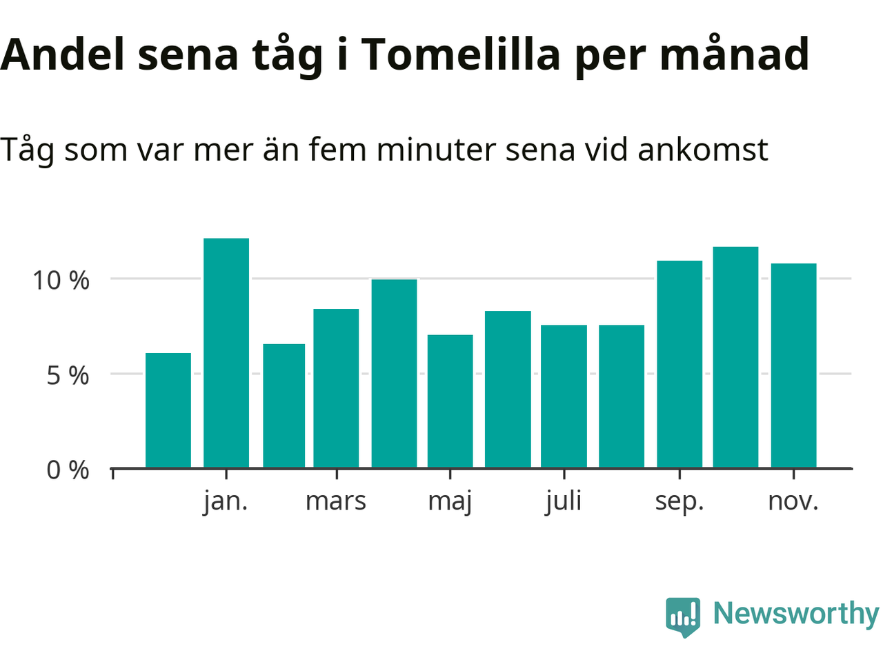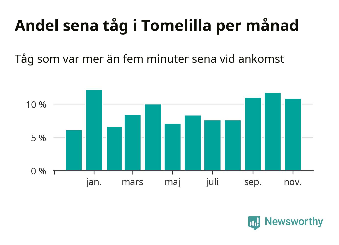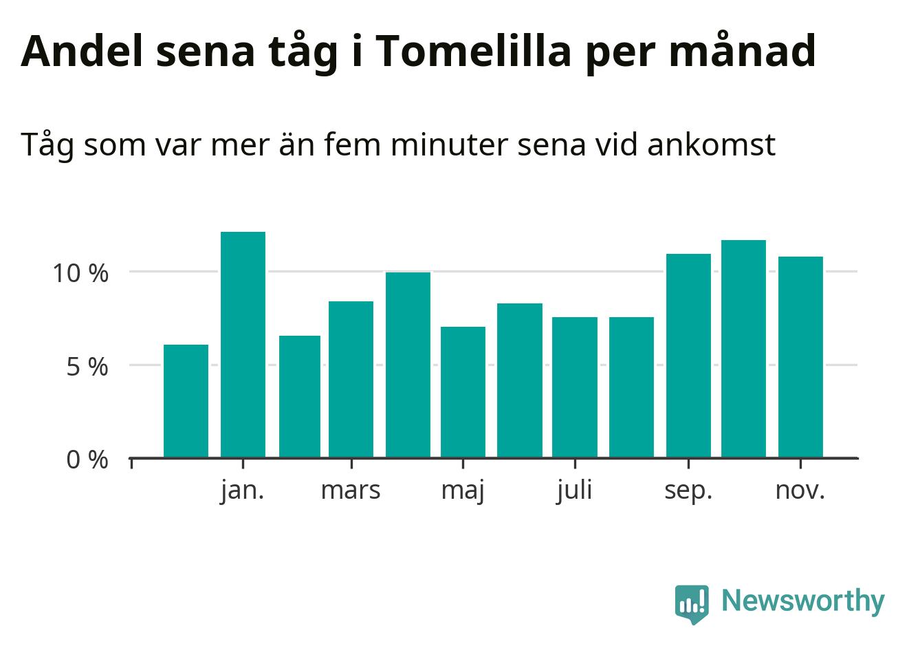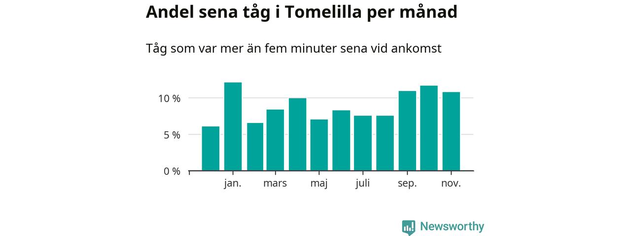 Under det senaste året har nio procent av tågen varit sena när de passerat Lunnarp, Smedstorp eller Tomelilla i Tomelilla kommun. Ett tåg räknas här som sent om det varit mer än fem minuter efter tidtabellen.1