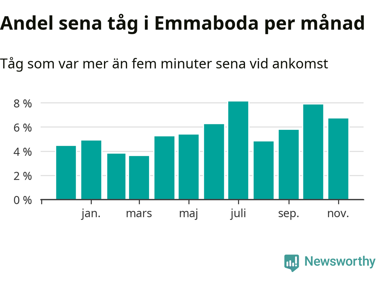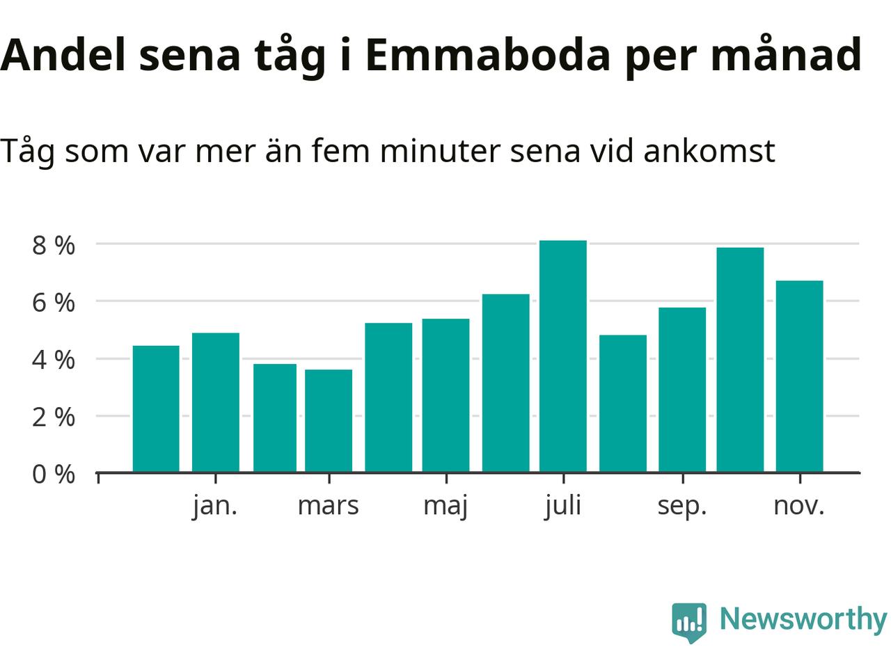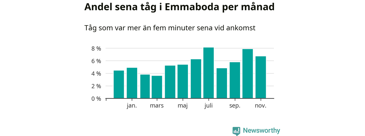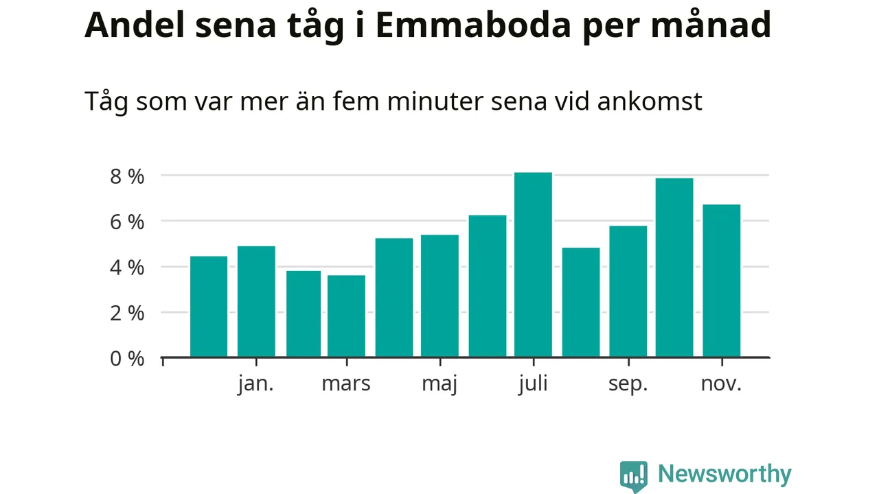 Under det senaste året har sex procent av tågen varit sena när de passerat Emmaboda eller Vissefjärda i Emmaboda kommun. Ett tåg räknas här som sent om det varit mer än fem minuter efter tidtabellen.1