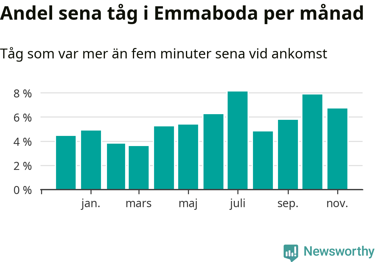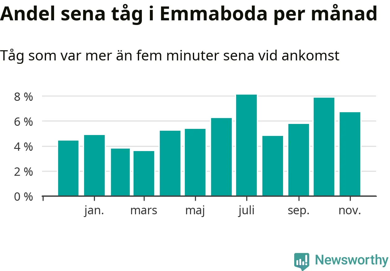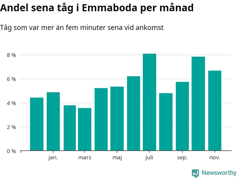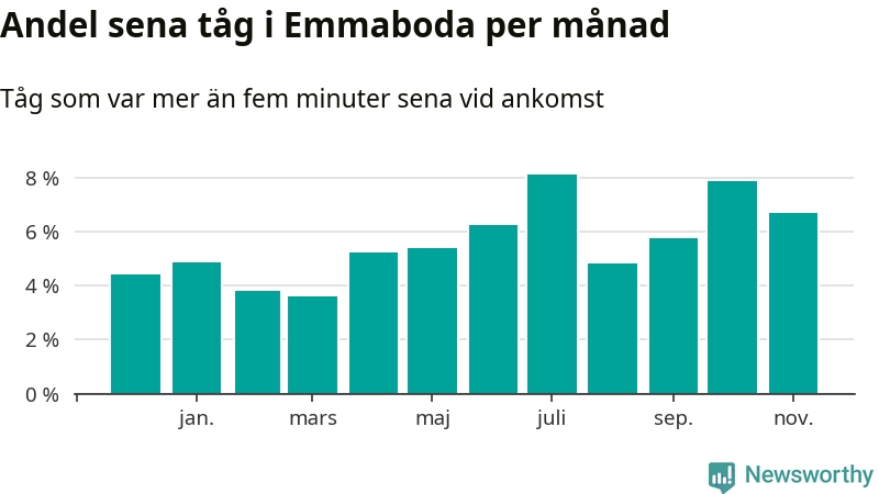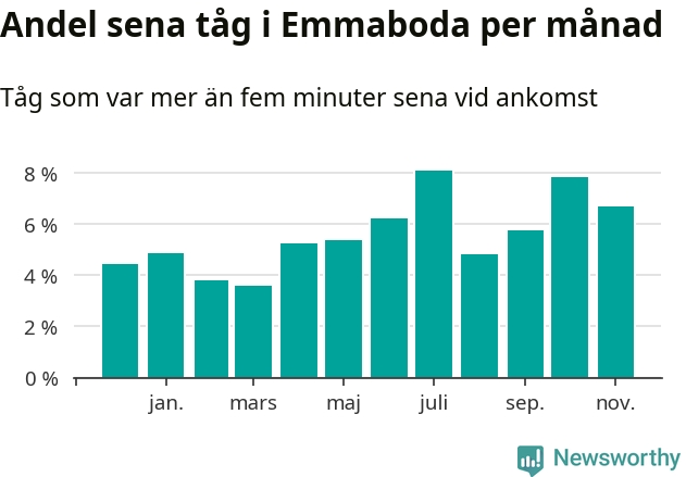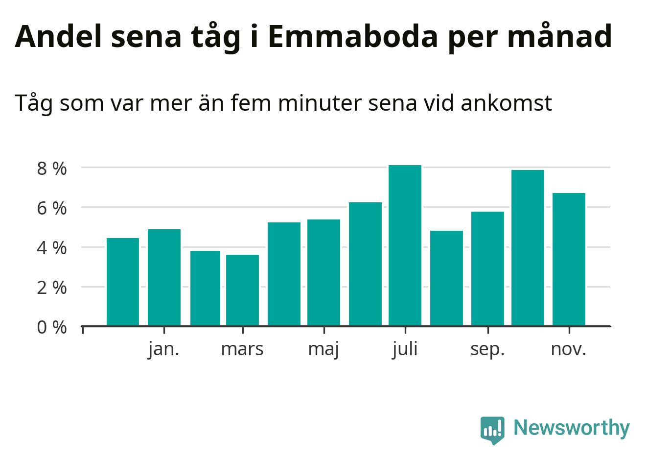 Under det senaste året har sex procent av tågen varit sena när de passerat Emmaboda eller Vissefjärda i Emmaboda kommun. Ett tåg räknas här som sent om det varit mer än fem minuter efter tidtabellen.1