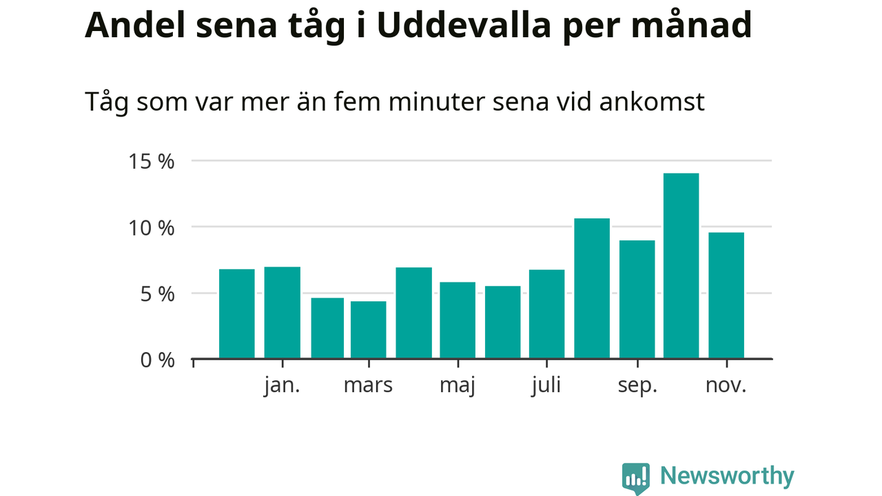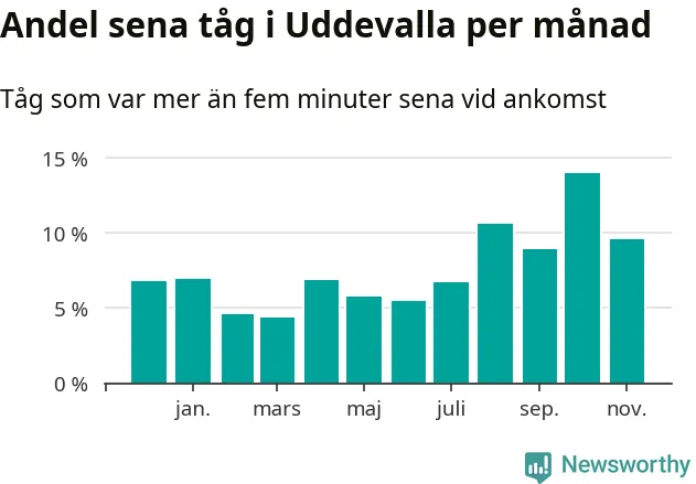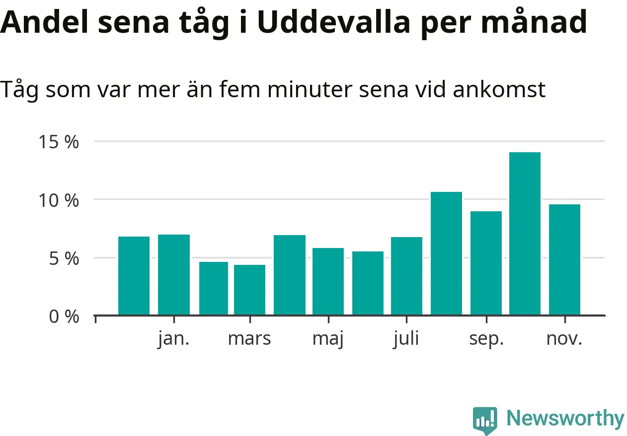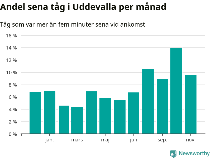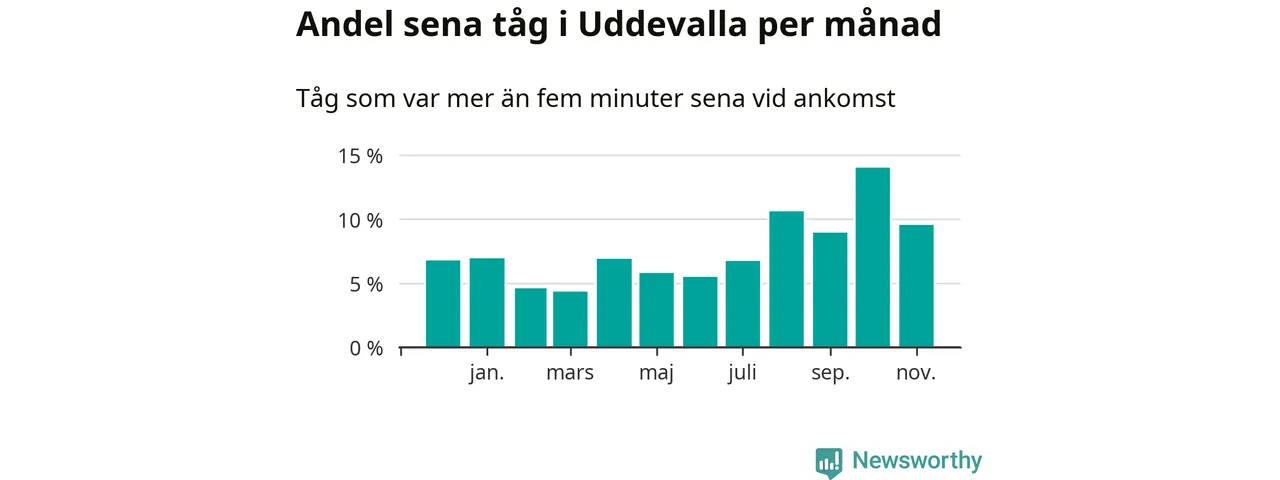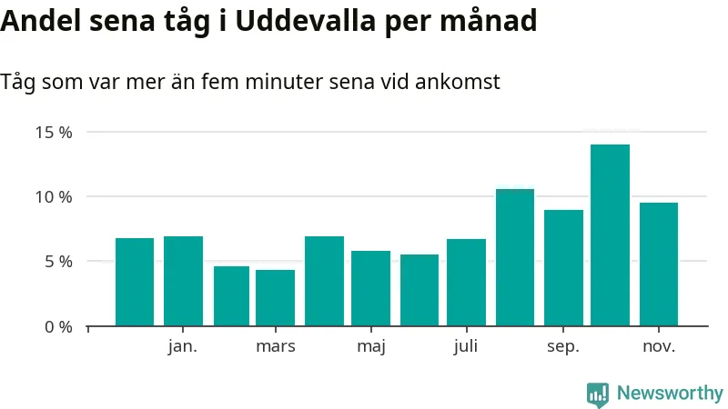 Den mest förseningsdrabbade månaden var oktober, med i snitt 14 procent sena tåg enligt det måttet. Det senaste halvåret har andelen sena tåg varit högre än genomsnittet för halvåret innan dess.