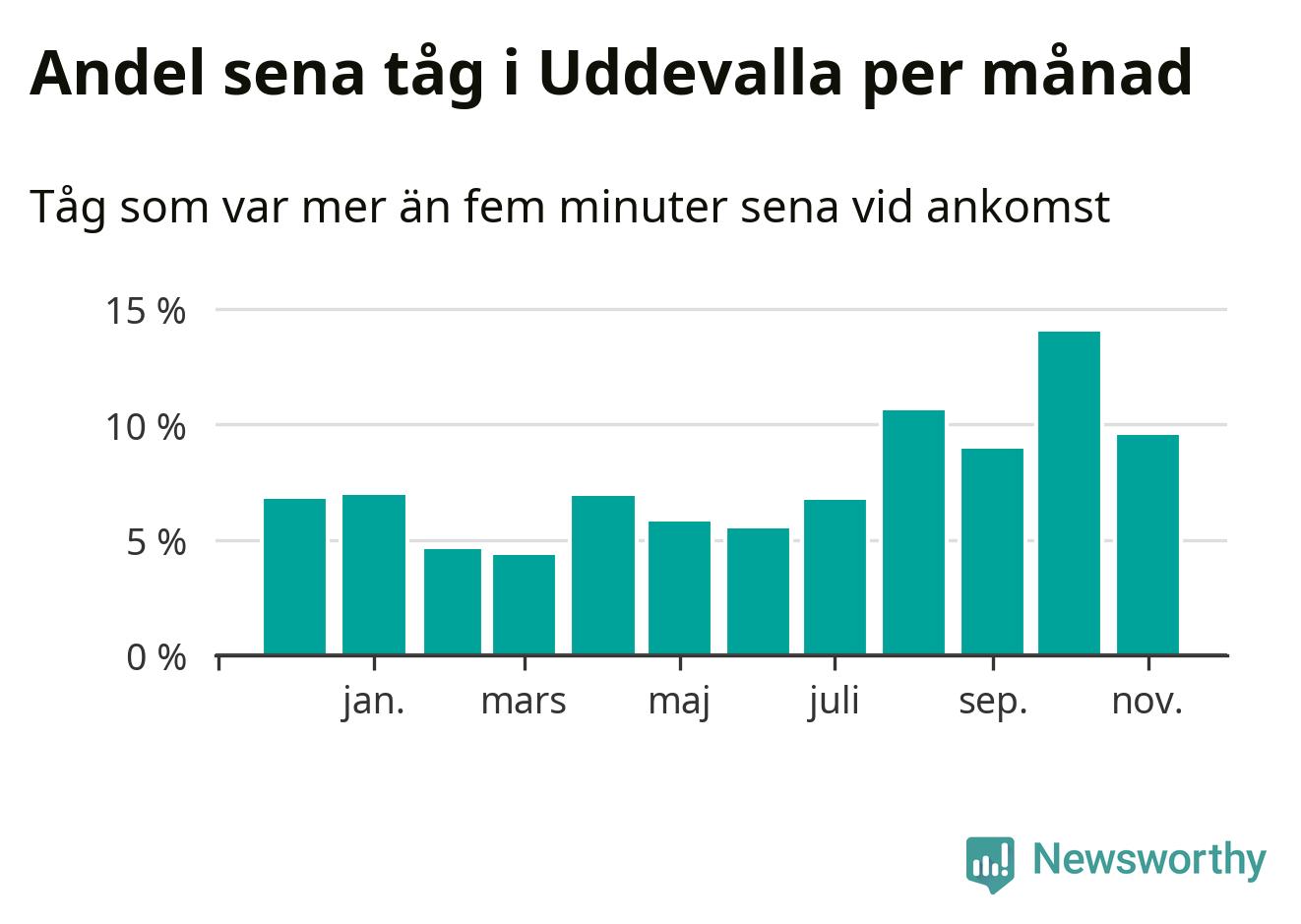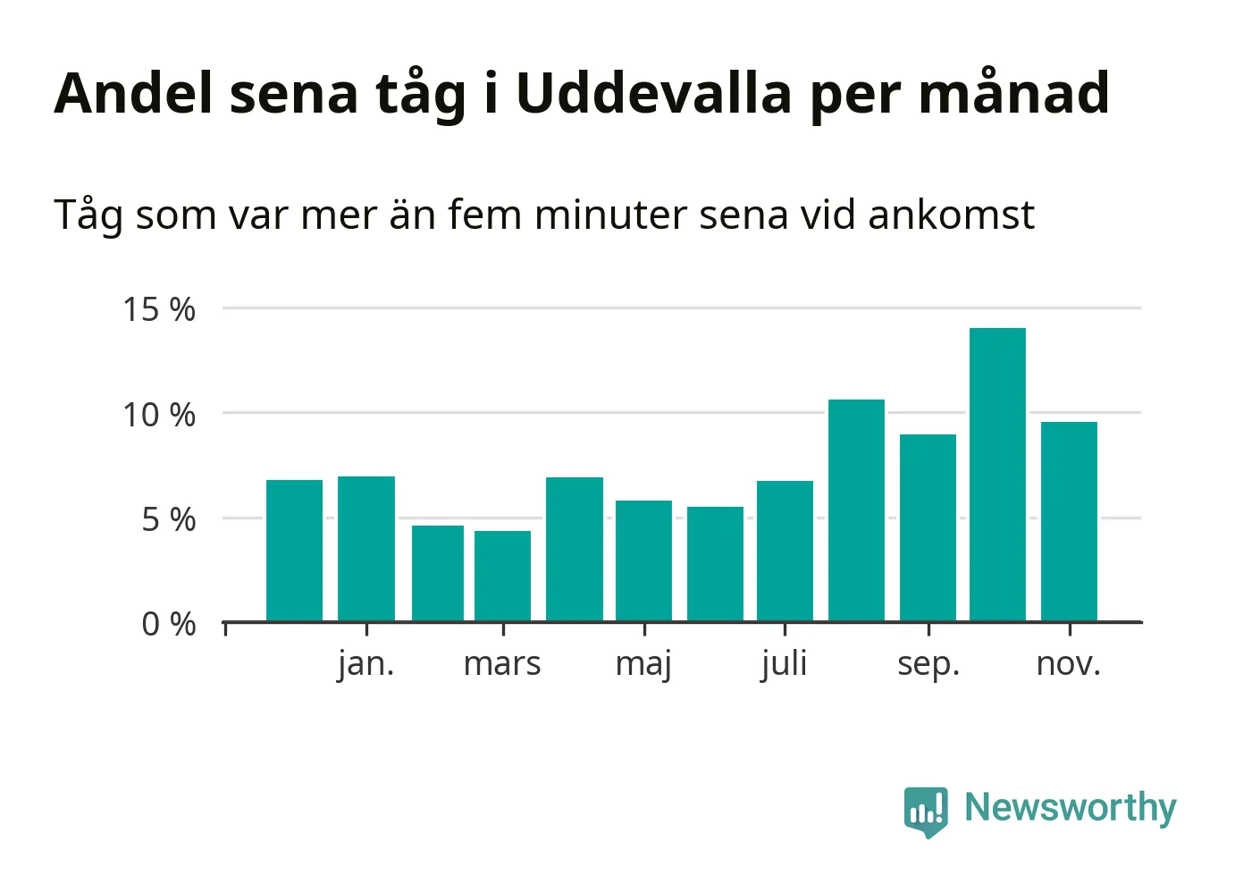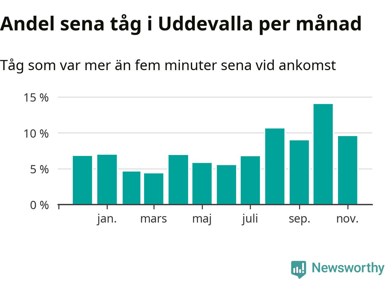 Under det senaste året har sju procent av tågen varit sena när de passerat Ljungskile, Uddevalla C eller Uddevalla Ö i Uddevalla kommun. Ett tåg räknas här som sent om det varit mer än fem minuter efter tidtabellen.1