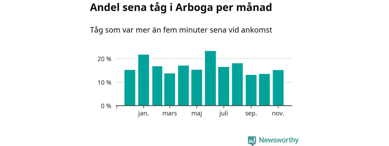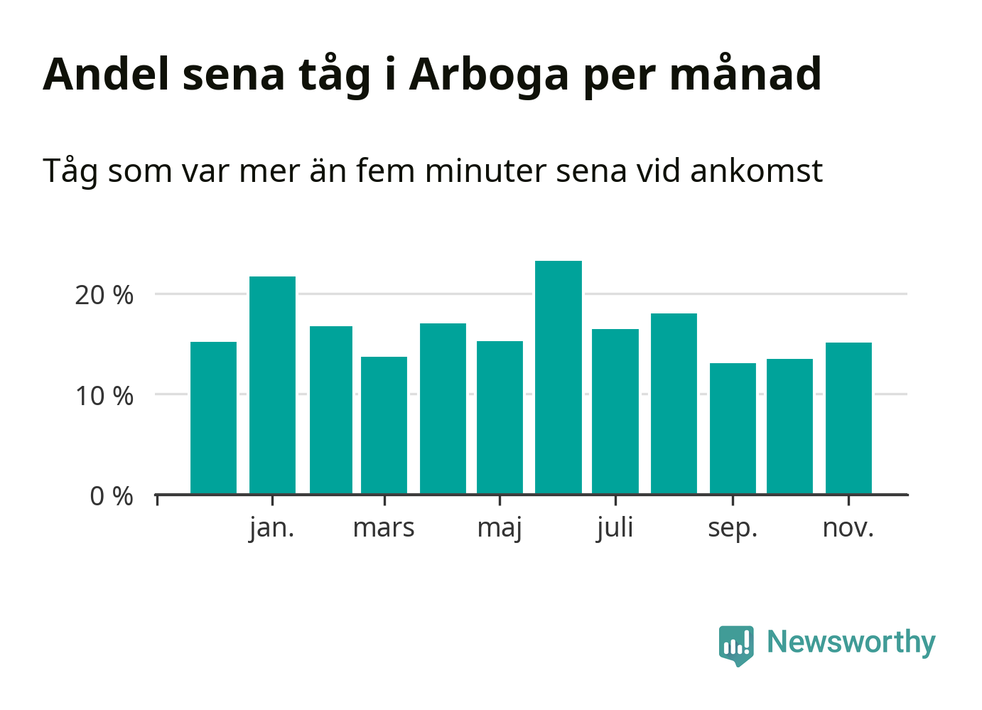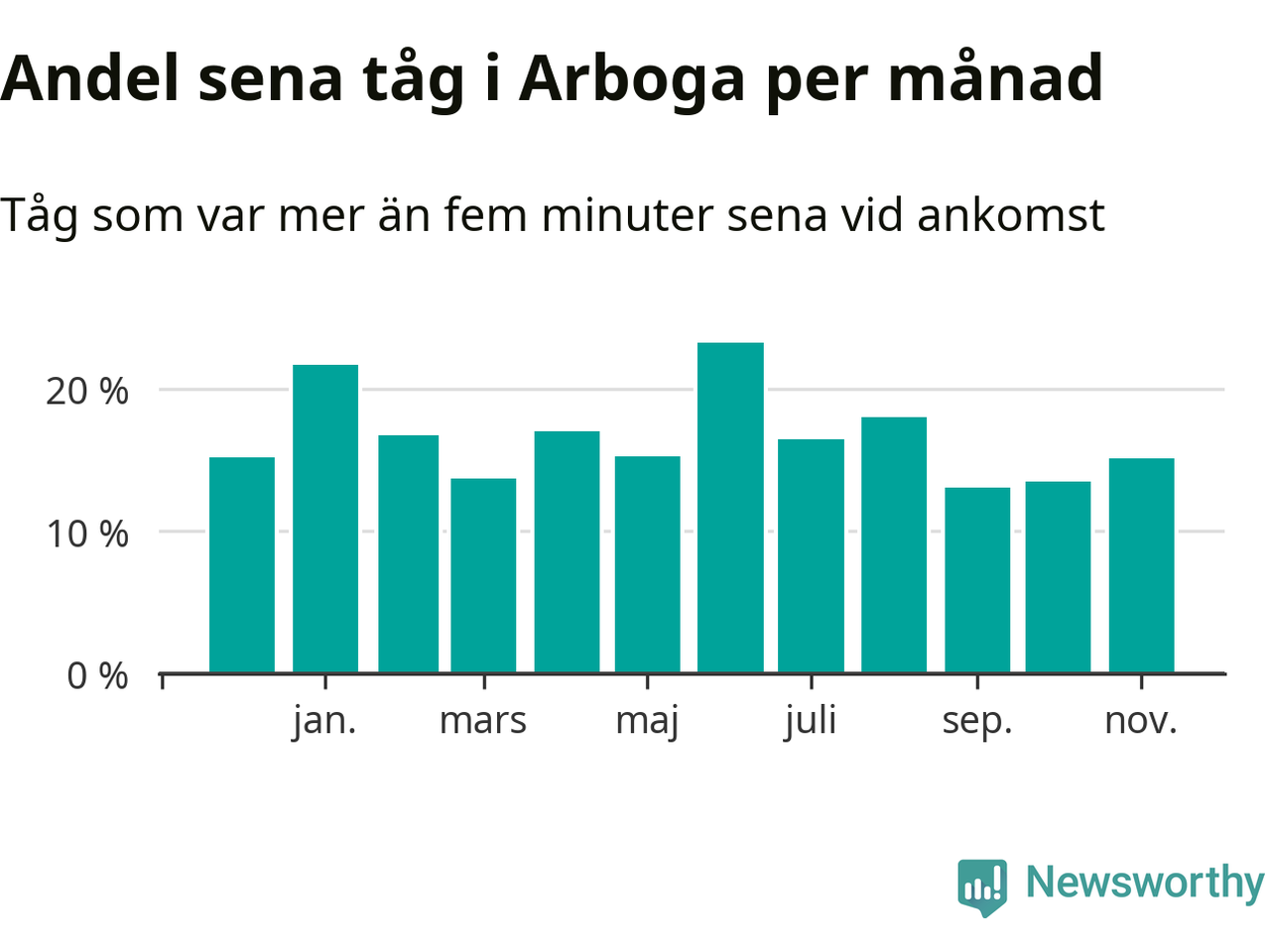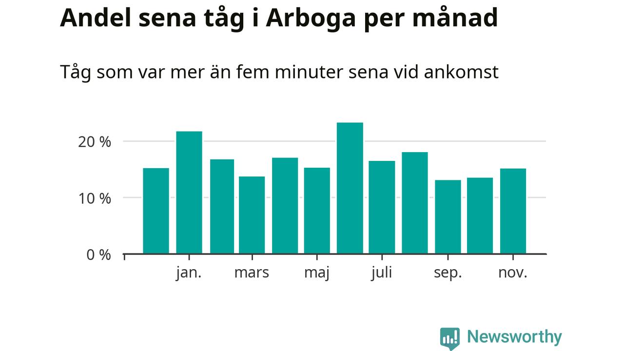 Den svenska järnvägsbranschen och Trafikverket har ett gemensamt mål om att 95 procent av tågen ska komma fram med högst fem minuters försening till sin slutstation. Dit är det långt i de flesta delar av landet. Vid Arboga station var förseningarna färre än 5 procent under endast en vecka av 52 det senaste året. Det ska noteras att siffrorna i den här artikeln skiljer sig från det officiella punktlighetsmåttet, som bara beaktar ankomster till slutstationer, och där insamlingen sker på ett annat sätt än i den här artikeln.