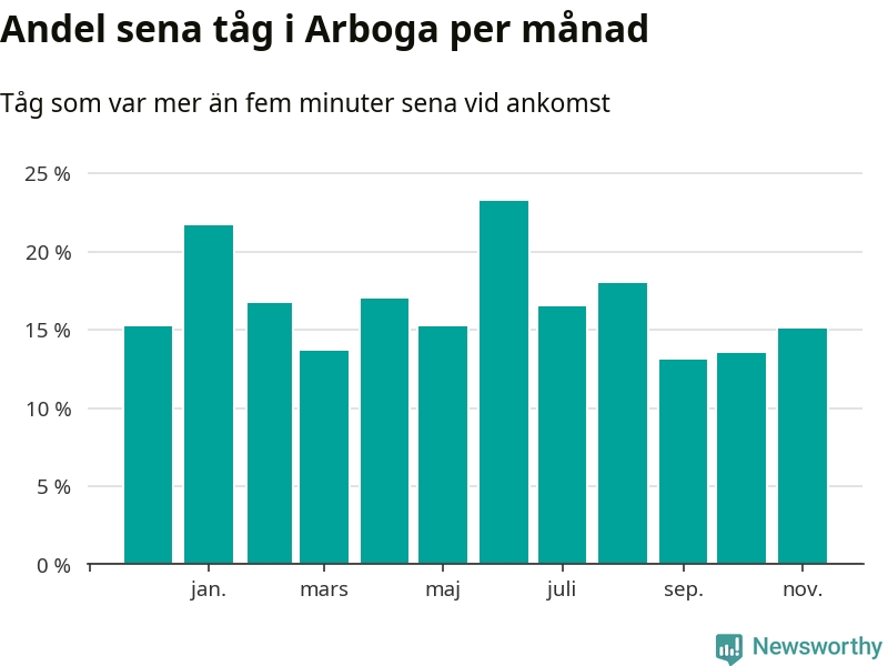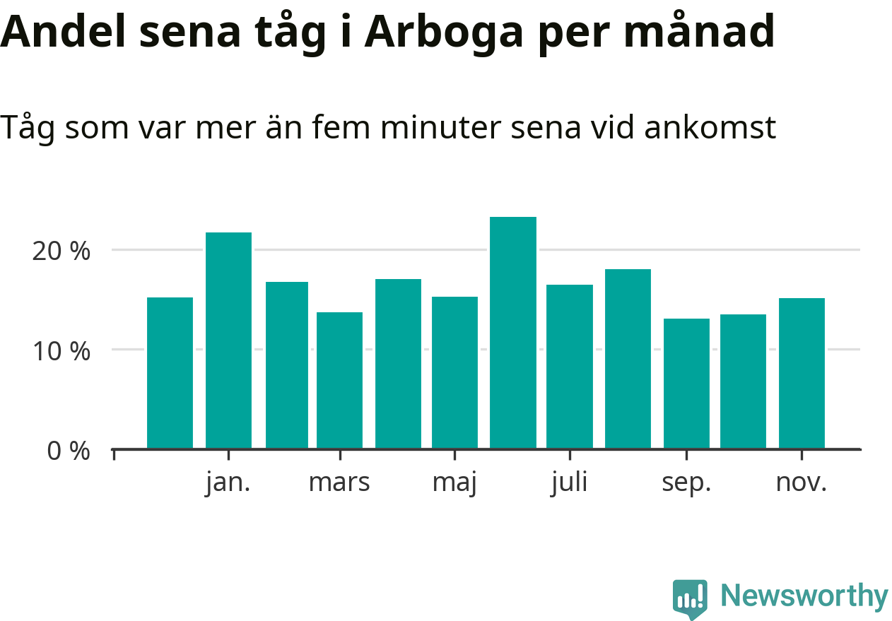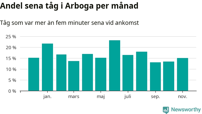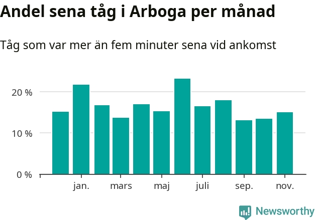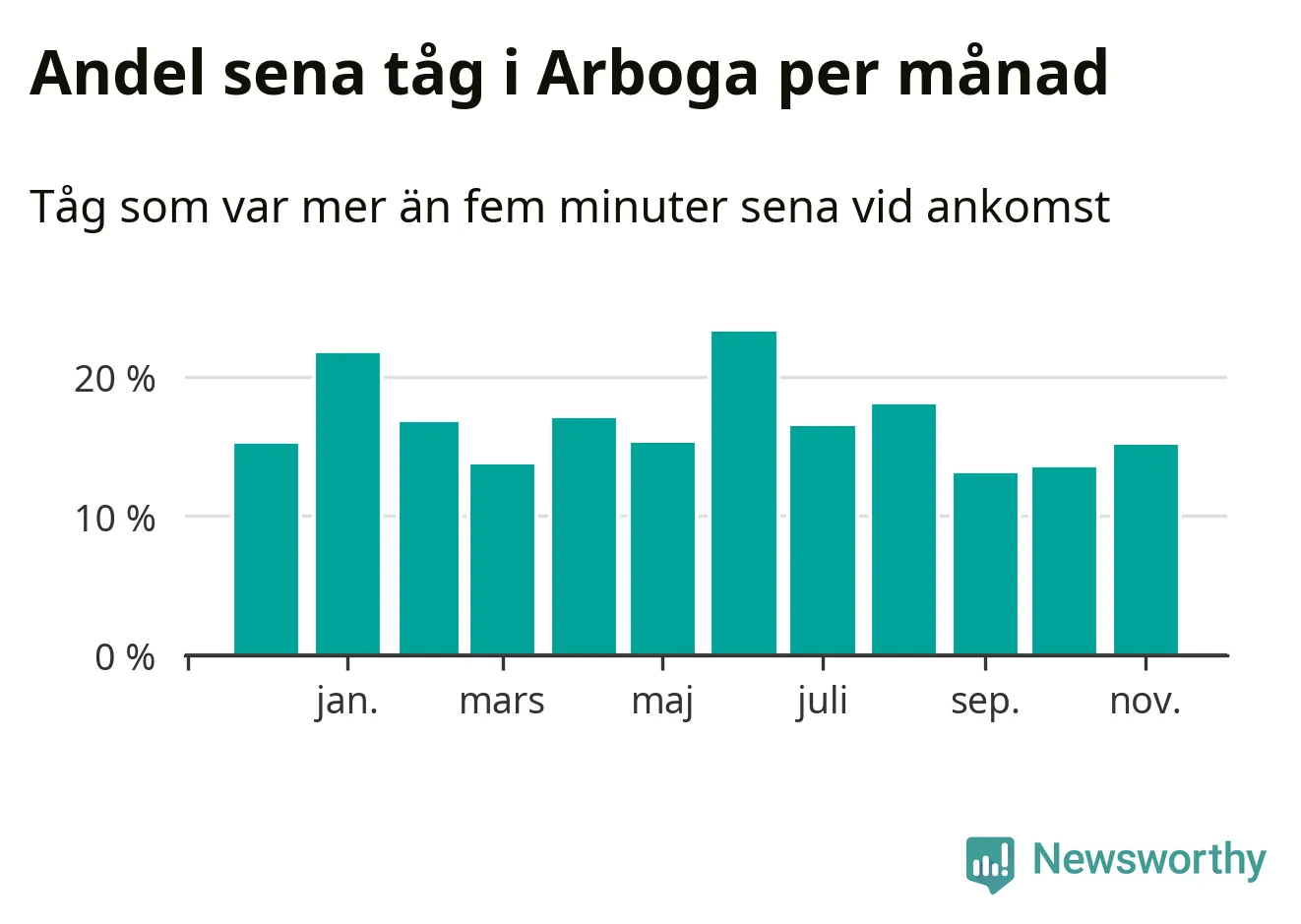 Den svenska järnvägsbranschen och Trafikverket har ett gemensamt mål om att 95 procent av tågen ska komma fram med högst fem minuters försening till sin slutstation. Dit är det långt i de flesta delar av landet. Vid Arboga station var förseningarna färre än 5 procent under endast en vecka av 52 det senaste året. Det ska noteras att siffrorna i den här artikeln skiljer sig från det officiella punktlighetsmåttet, som bara beaktar ankomster till slutstationer, och där insamlingen sker på ett annat sätt än i den här artikeln.
