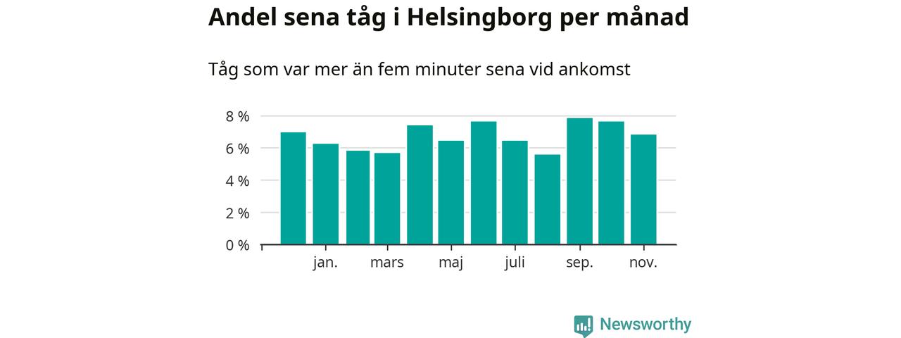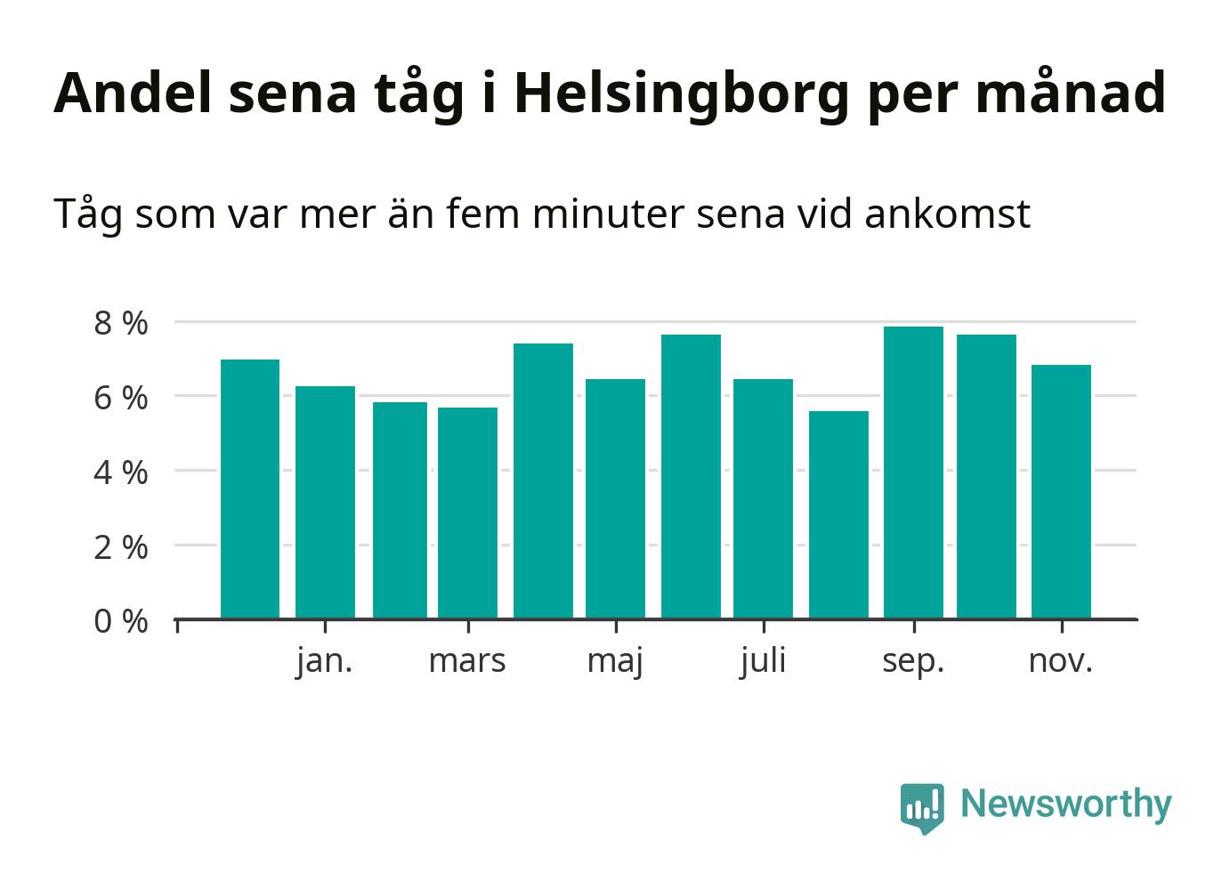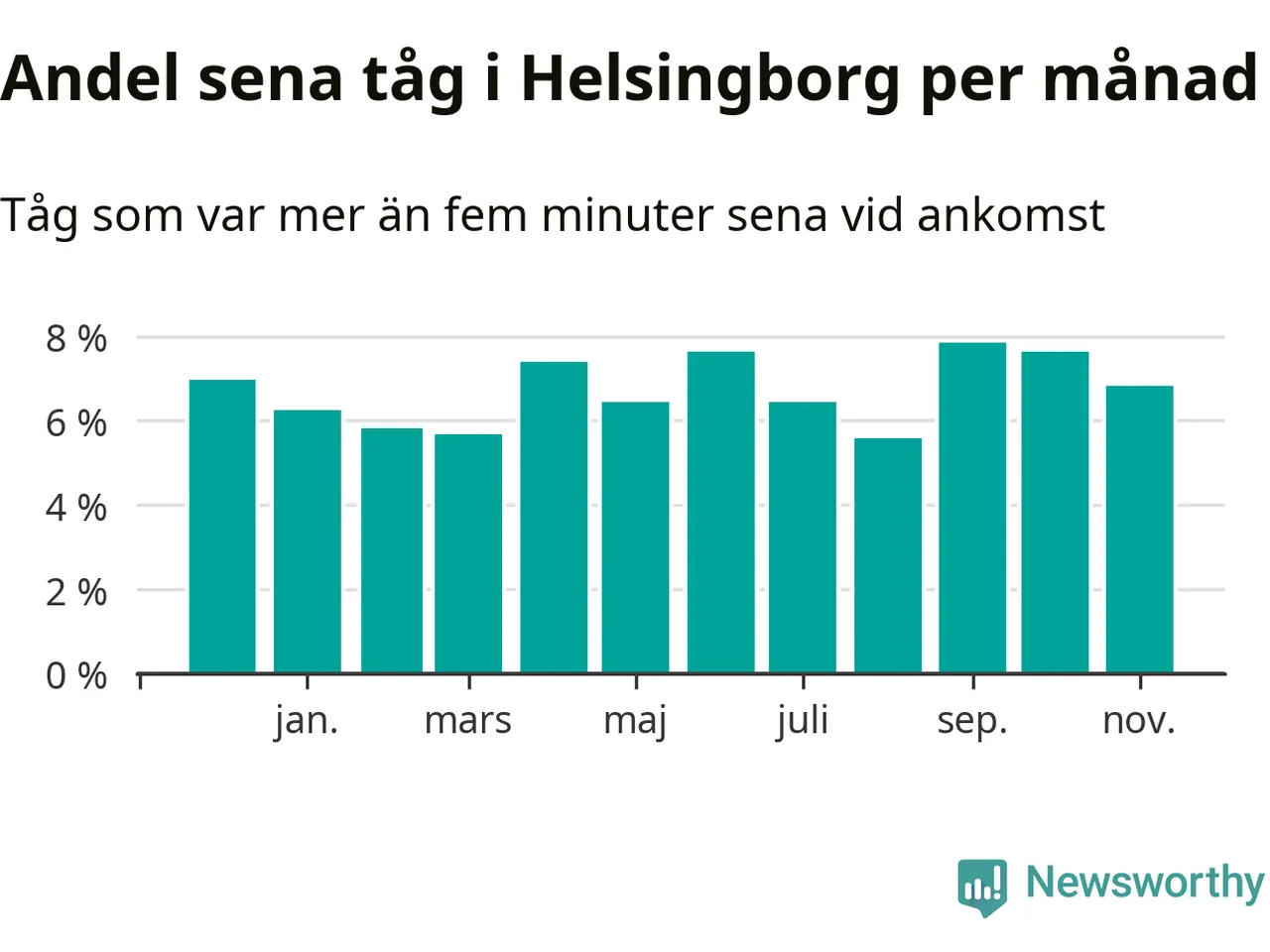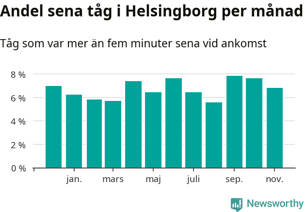 Den mest förseningsdrabbade månaden var september, med i snitt åtta procent sena tåg enligt det måttet. Det senaste halvåret har andelen sena tåg varit högre än genomsnittet för halvåret innan dess.