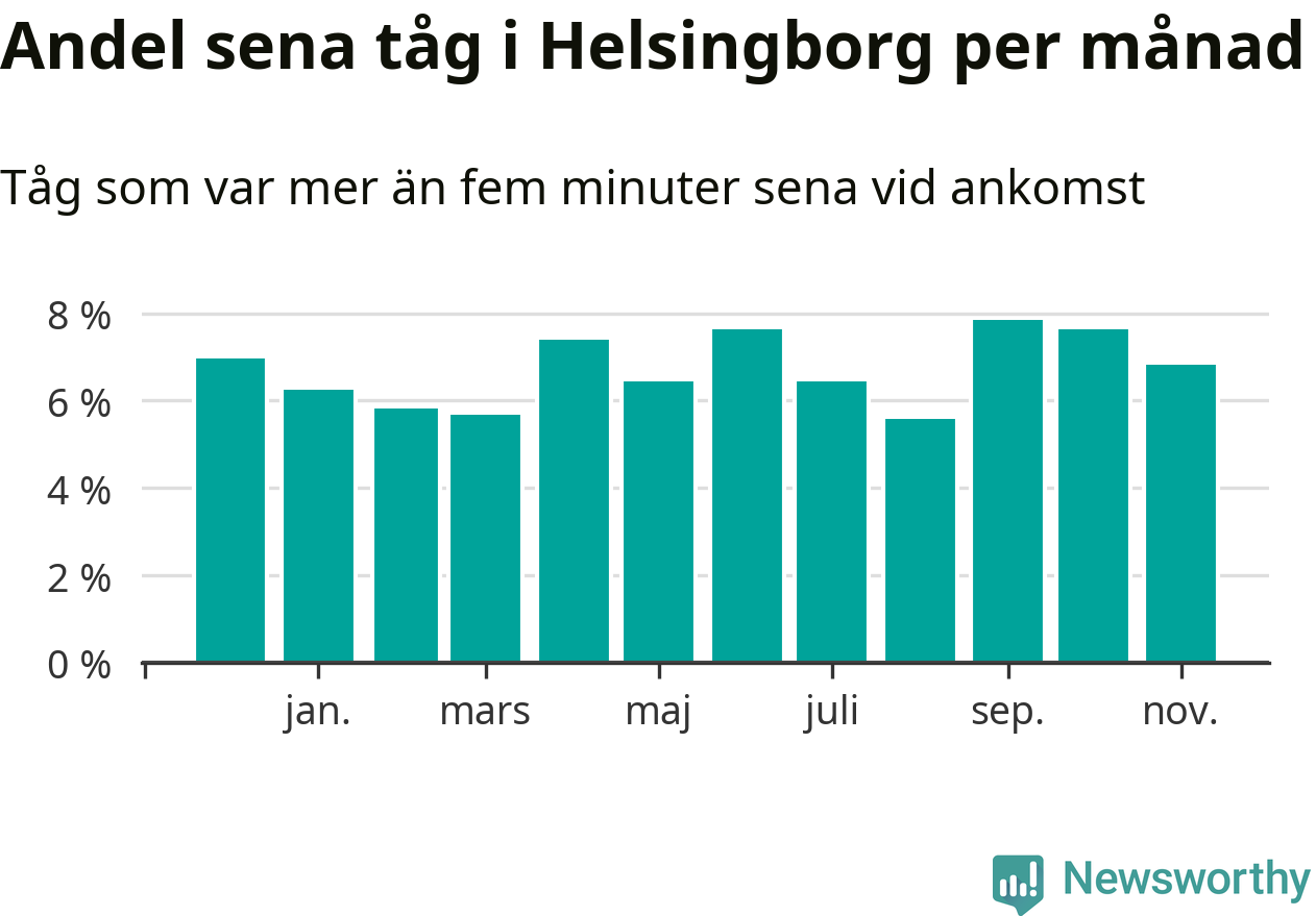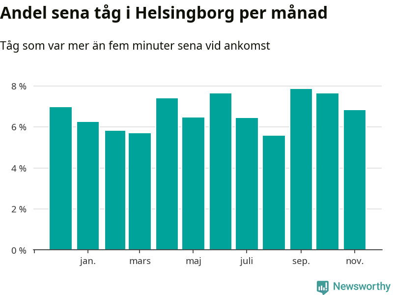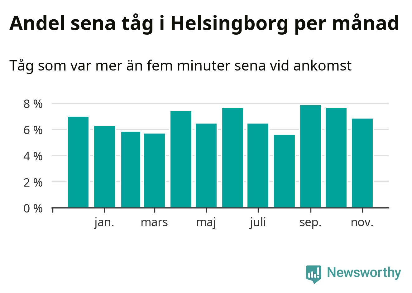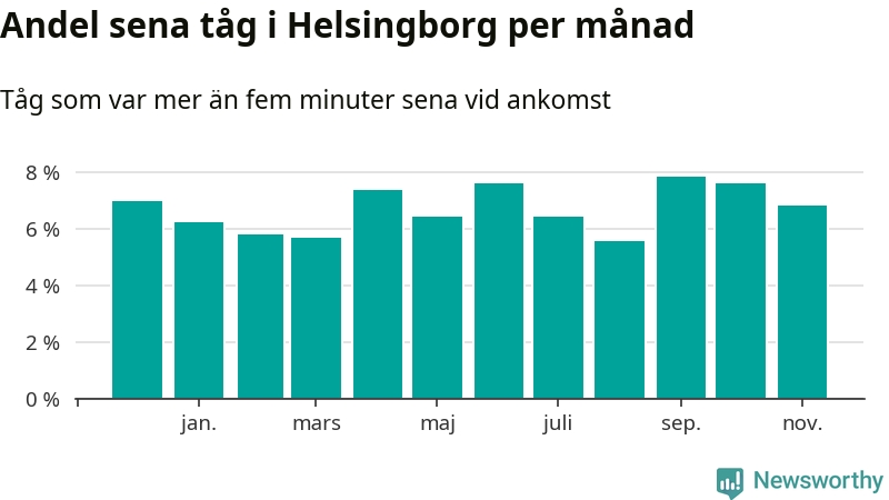 Den mest förseningsdrabbade månaden var september, med i snitt åtta procent sena tåg enligt det måttet. Det senaste halvåret har andelen sena tåg varit högre än genomsnittet för halvåret innan dess.