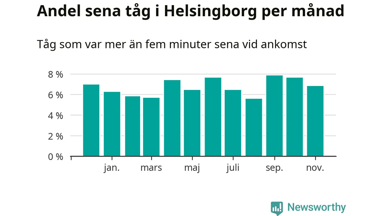 Det senaste halvåret har andelen sena tåg vid stationerna i Helsingborgs kommun varit högre än halvåret innan dess. Newsworthy och Sveriges Natur har studerat tågens punktlighet det senaste året, på jakt efter järnvägens flaskhalsar.