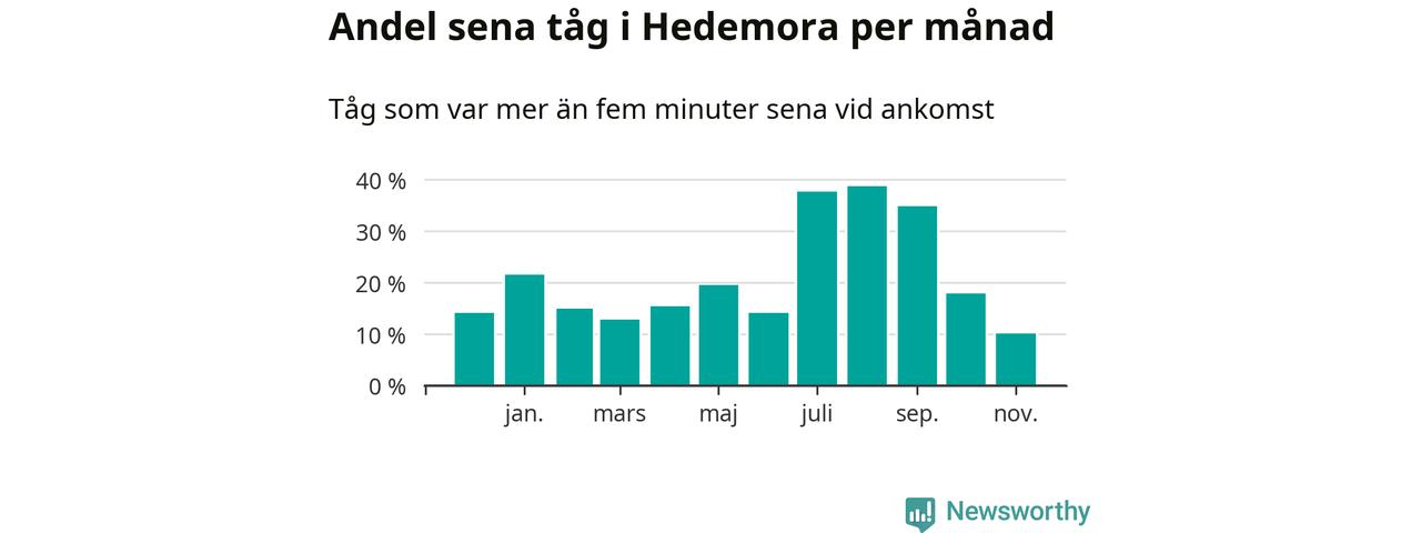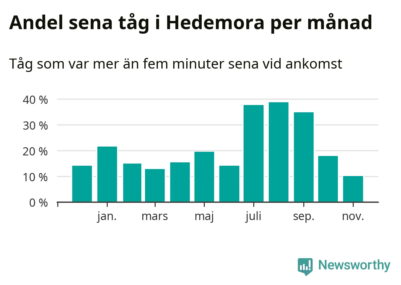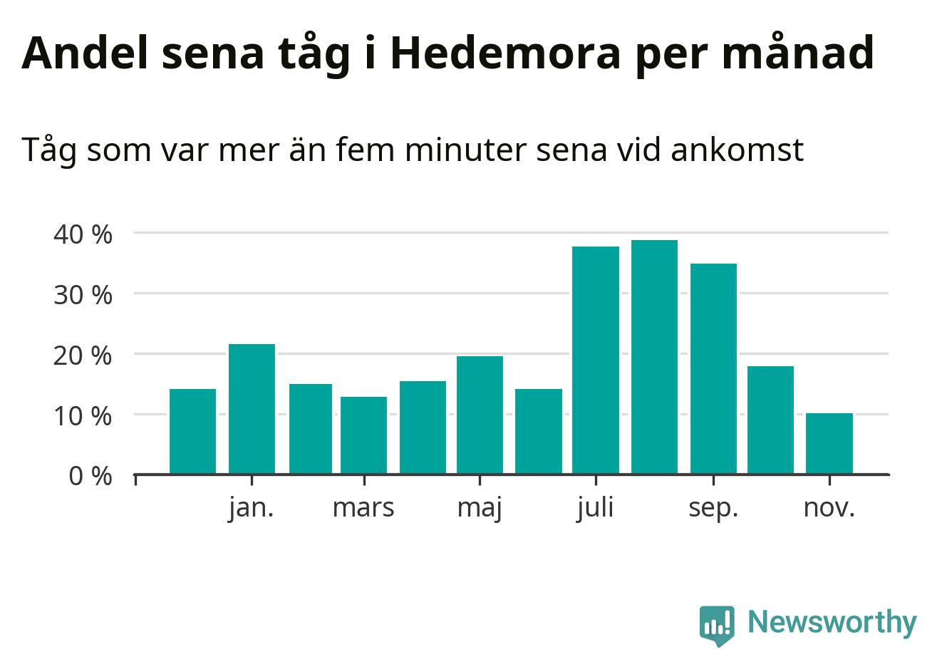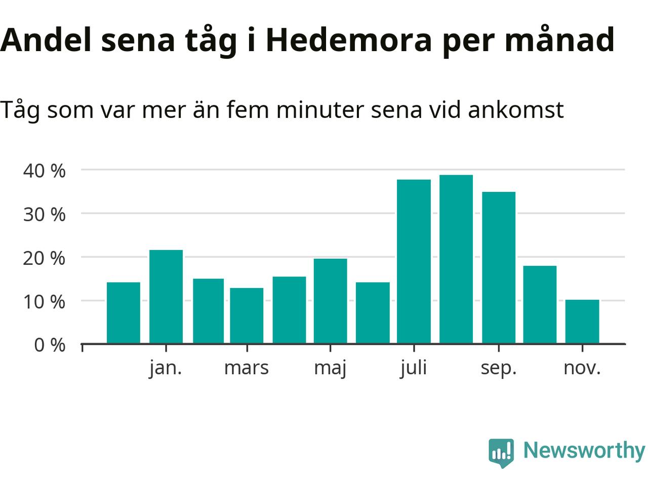 Den svenska järnvägsbranschen och Trafikverket har ett gemensamt mål om att 95 procent av tågen ska komma fram med högst fem minuters försening till sin slutstation. Dit är det långt i de flesta delar av landet. Vid Hedemora station var förseningarna färre än 5 procent under endast en vecka av 52 det senaste året. Det ska noteras att siffrorna i den här artikeln skiljer sig från det officiella punktlighetsmåttet, som bara beaktar ankomster till slutstationer, och där insamlingen sker på ett annat sätt än i den här artikeln.