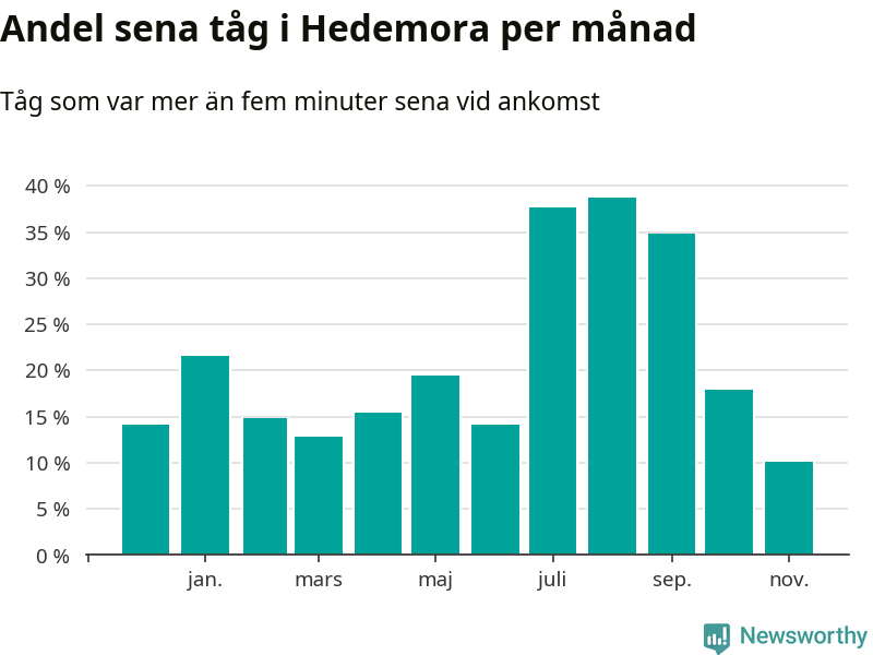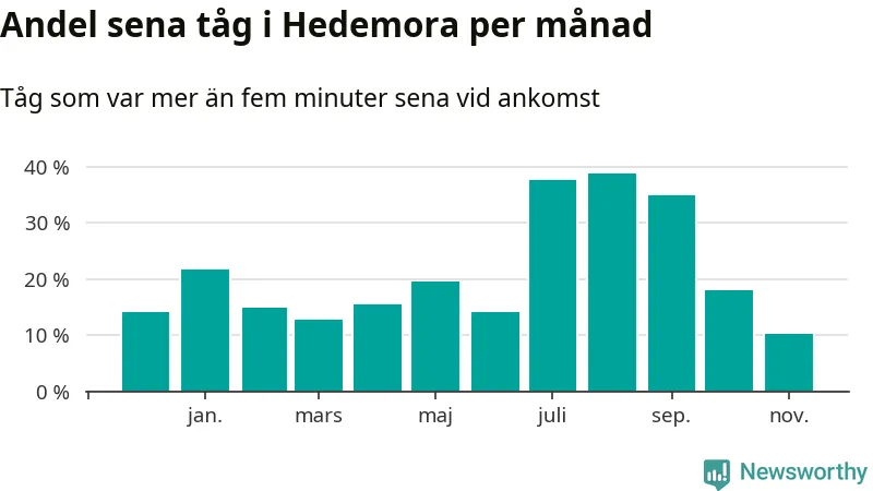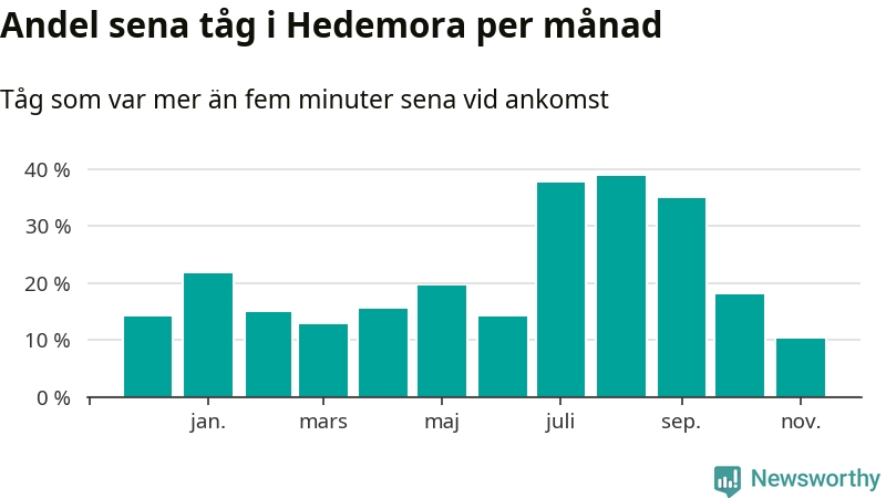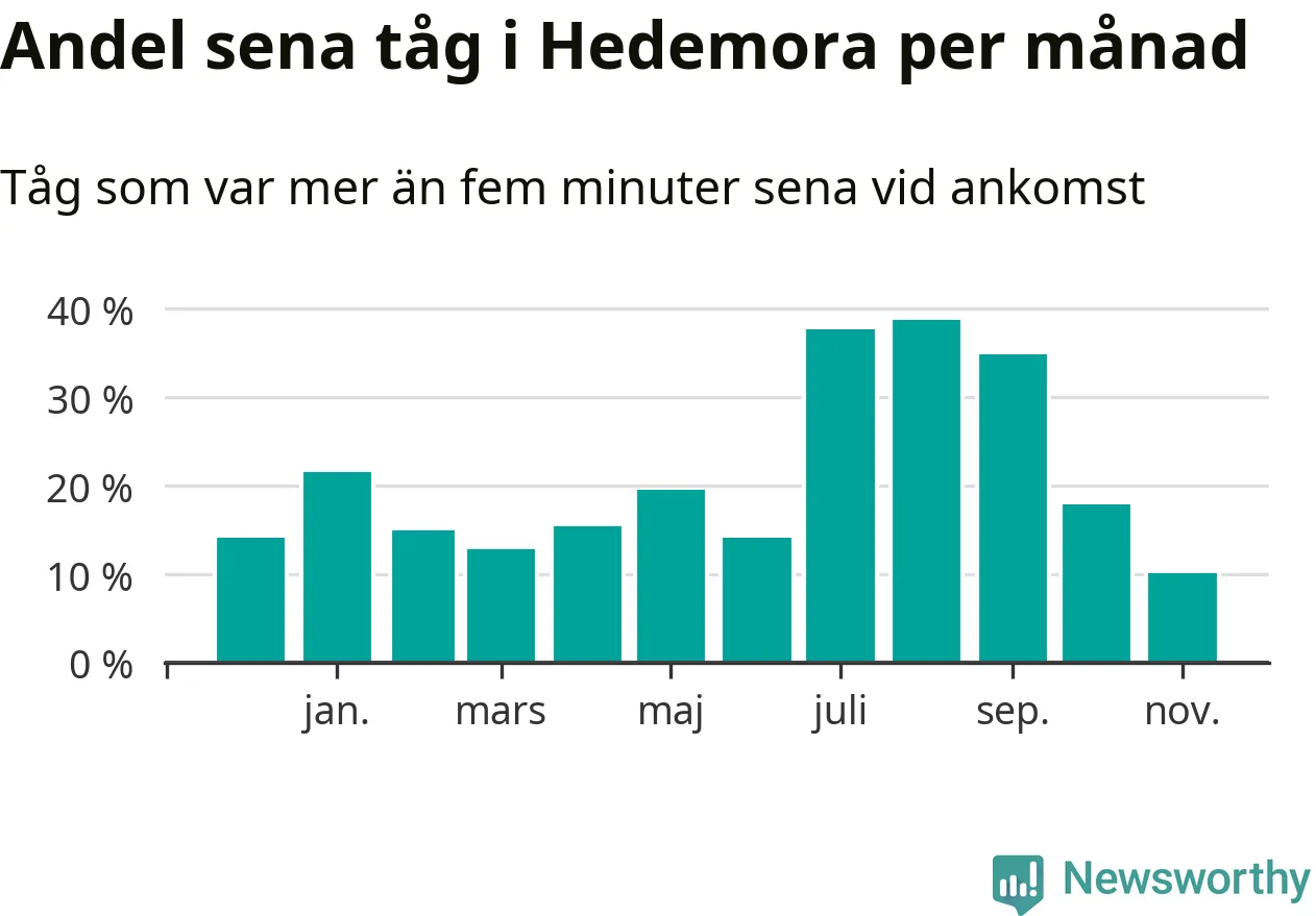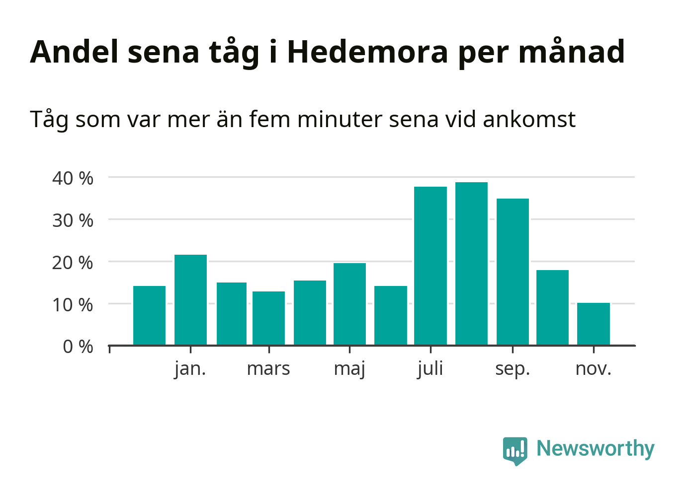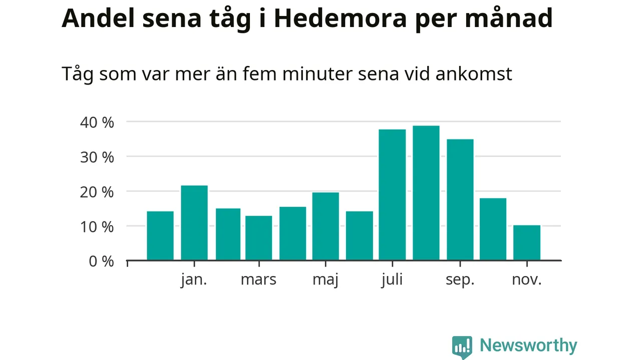 Den svenska järnvägsbranschen och Trafikverket har ett gemensamt mål om att 95 procent av tågen ska komma fram med högst fem minuters försening till sin slutstation. Dit är det långt i de flesta delar av landet. Vid Hedemora station var förseningarna färre än 5 procent under endast en vecka av 52 det senaste året. Det ska noteras att siffrorna i den här artikeln skiljer sig från det officiella punktlighetsmåttet, som bara beaktar ankomster till slutstationer, och där insamlingen sker på ett annat sätt än i den här artikeln.