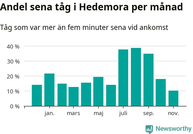 Den mest förseningsdrabbade månaden var augusti, med i snitt 39 procent sena tåg enligt det måttet. Men de senaste tre månaderna har andelen sena tåg varit på nedåtgående sedan augustitoppen. Sommartrafiken på Dalabanan påverkades stort av banarbeten i Borlänge under juli och augusti. Statistiken för de månaderna bygger på färre tåg, eftersom passagerartrafiken var ersatt av buss stora delar av den perioden.