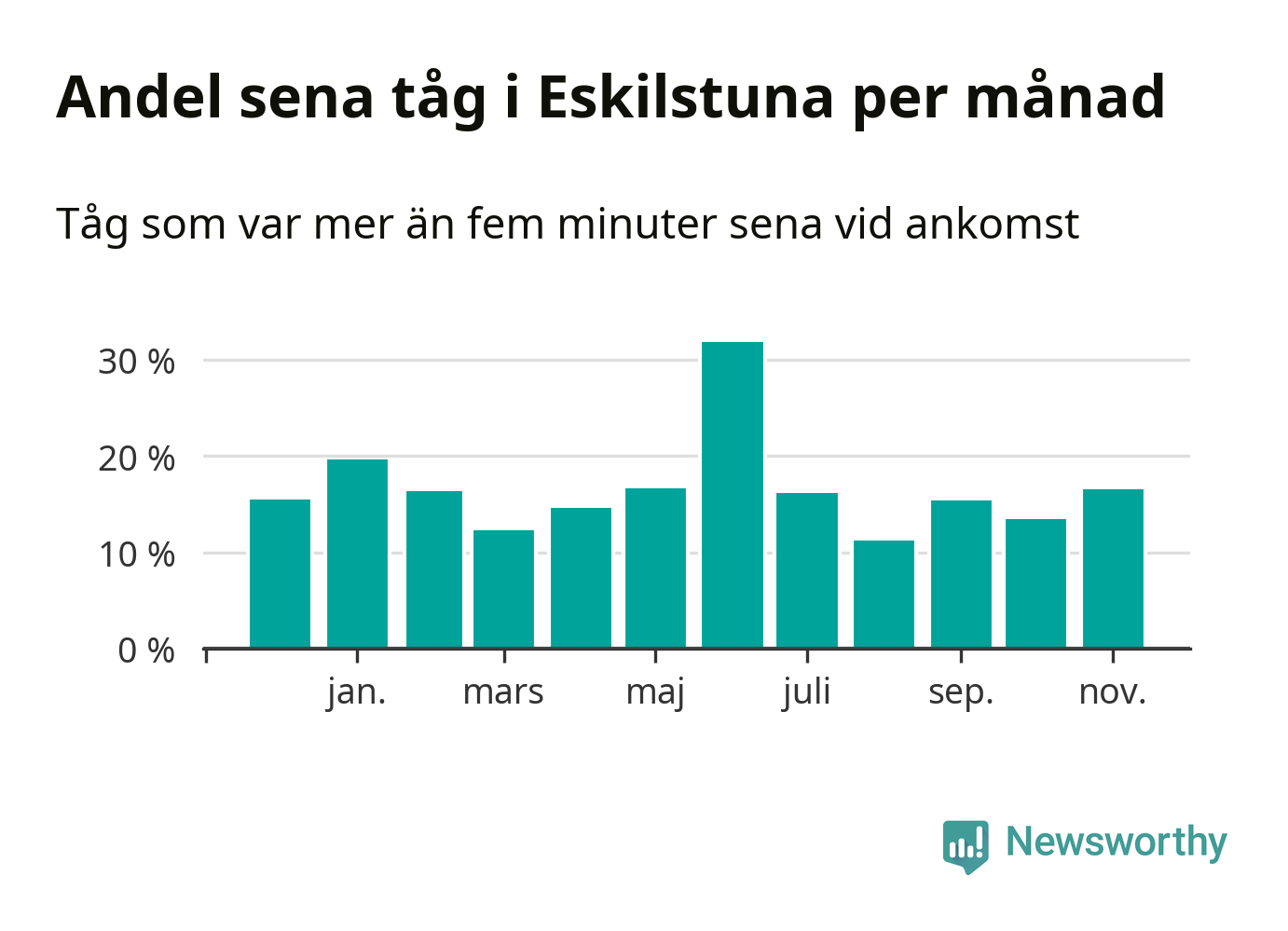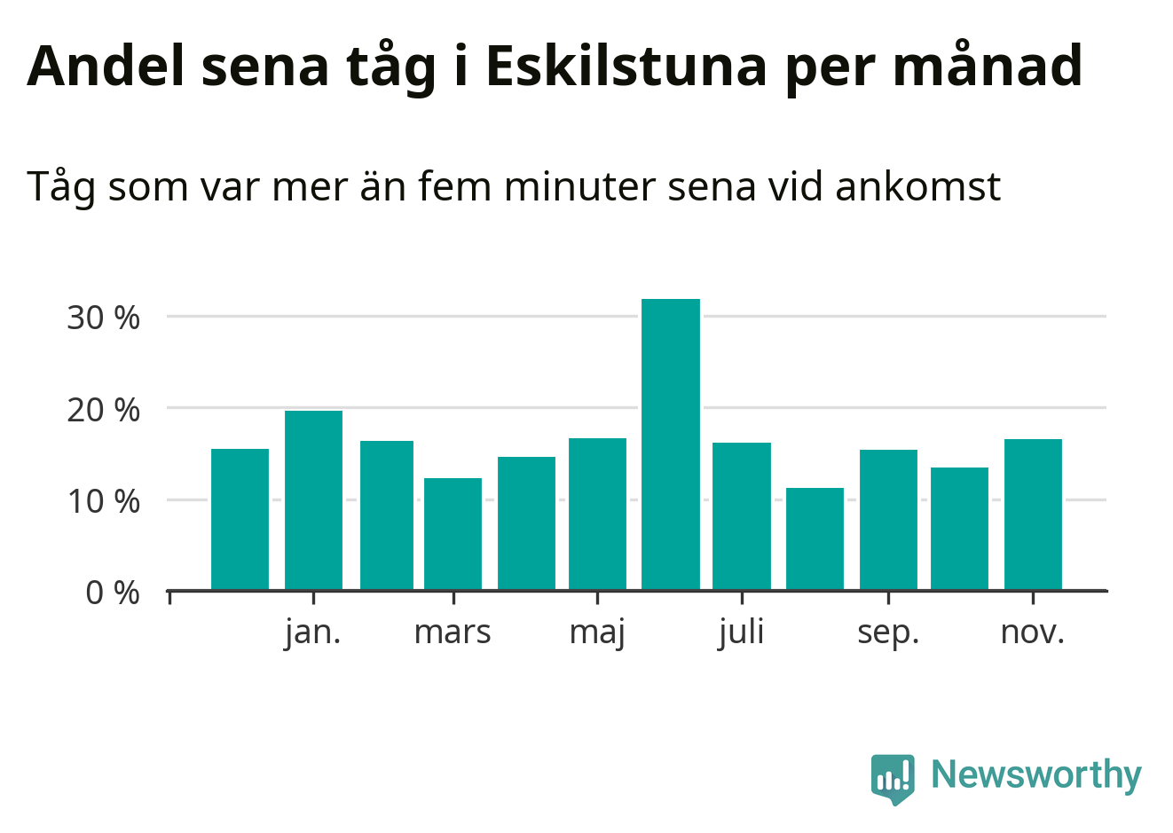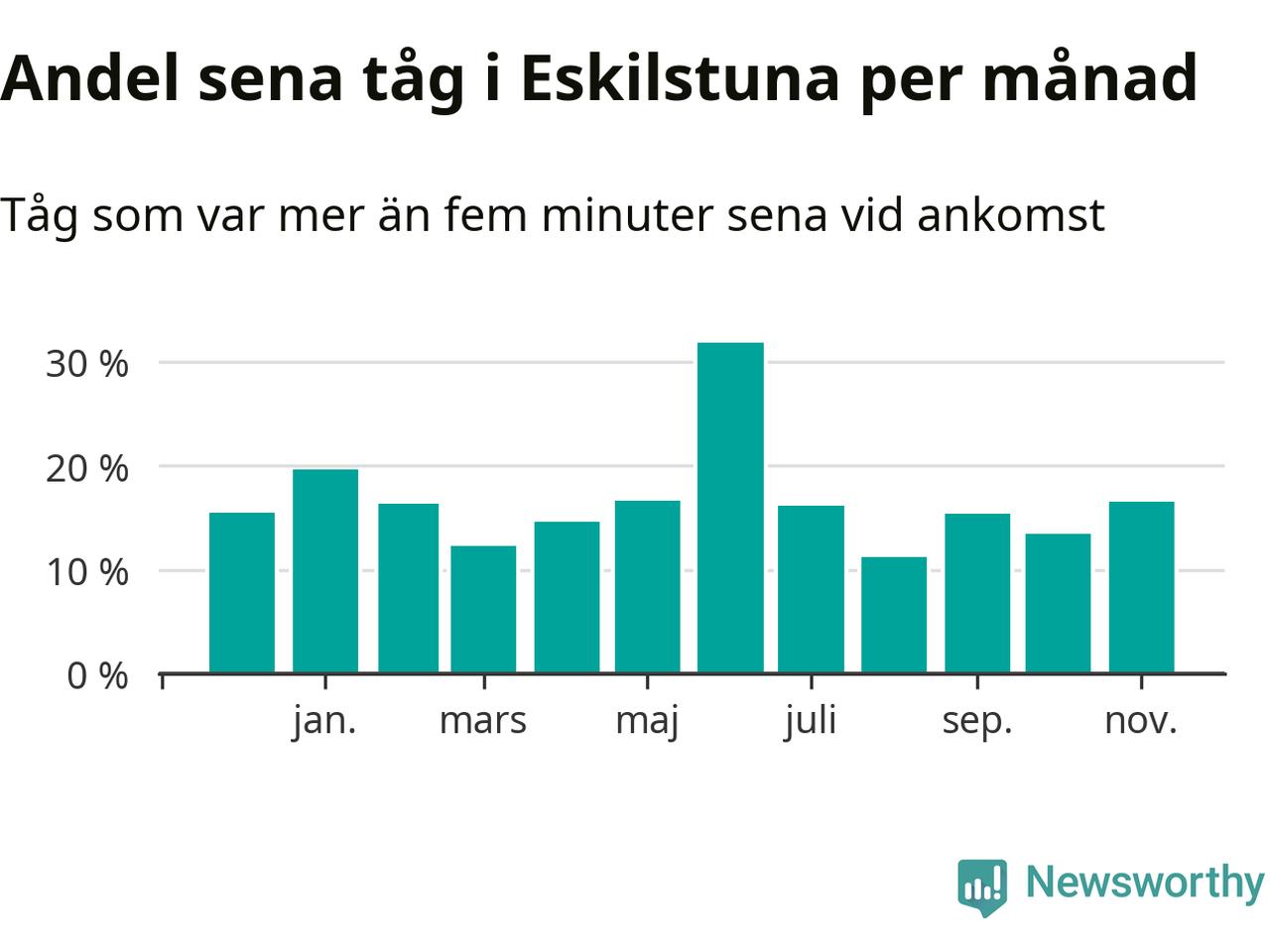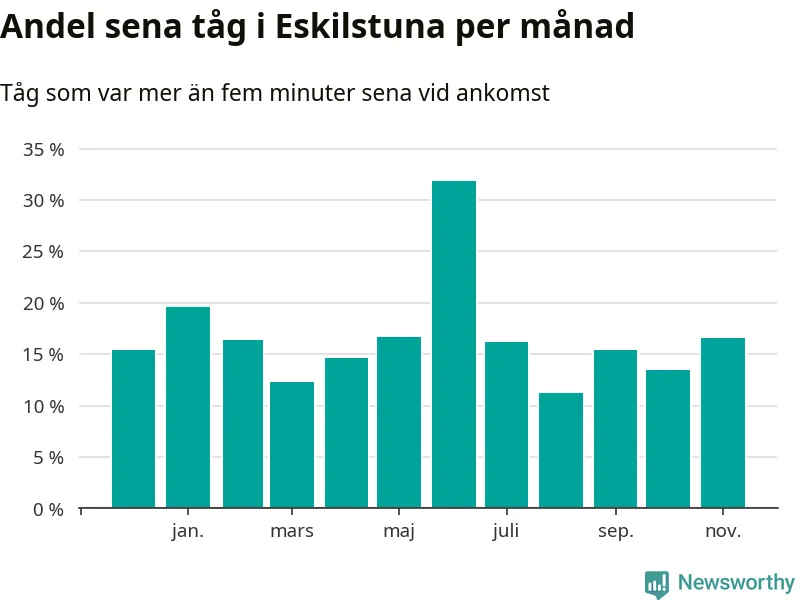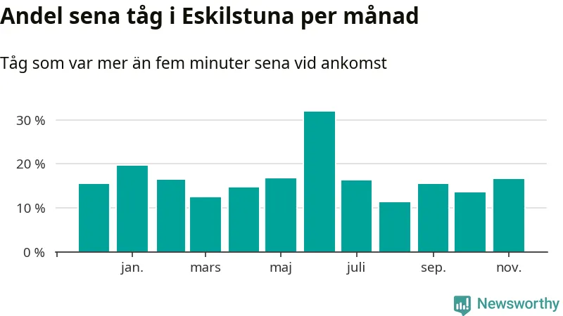 Den mest förseningsdrabbade månaden var juni, med i snitt 32 procent sena tåg enligt det måttet.