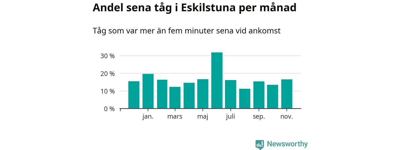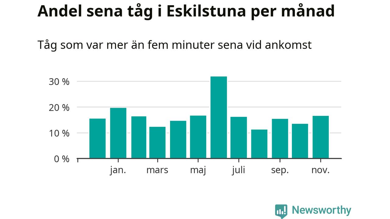Under det senaste året har 16 procent av tågen varit sena när de passerat Eskilstuna C eller Kvicksund i Eskilstuna kommun. Ett tåg räknas här som sent om det varit mer än fem minuter efter tidtabellen.1
