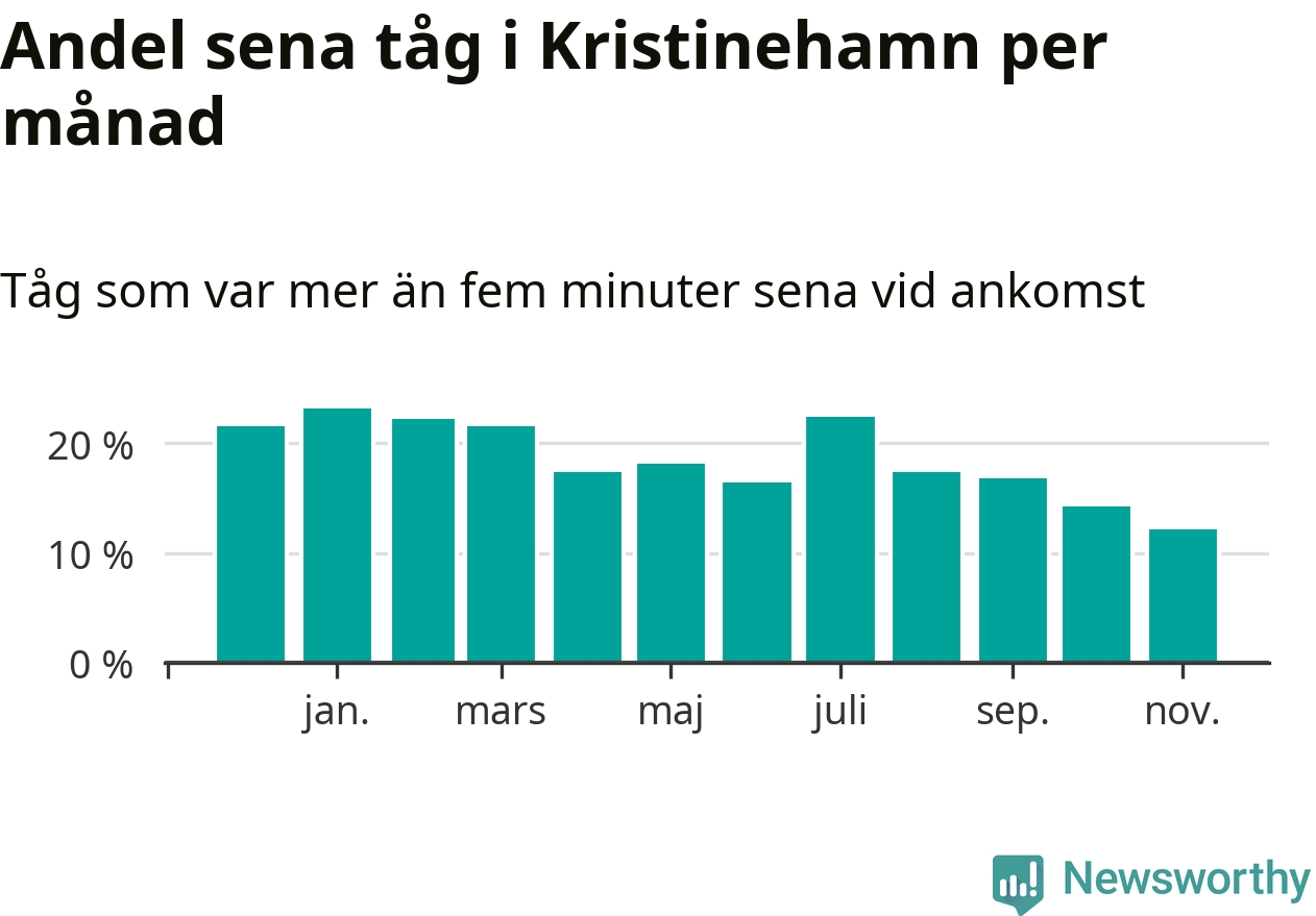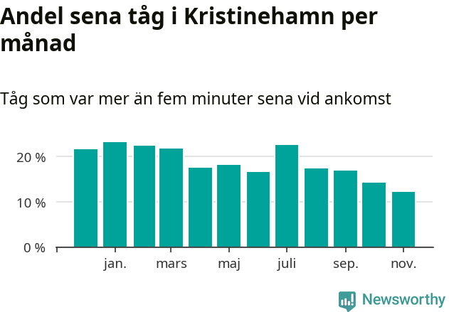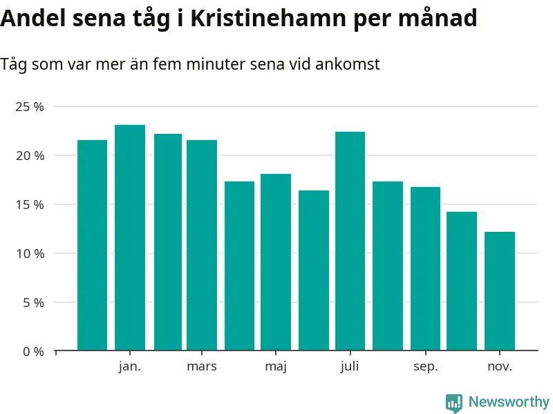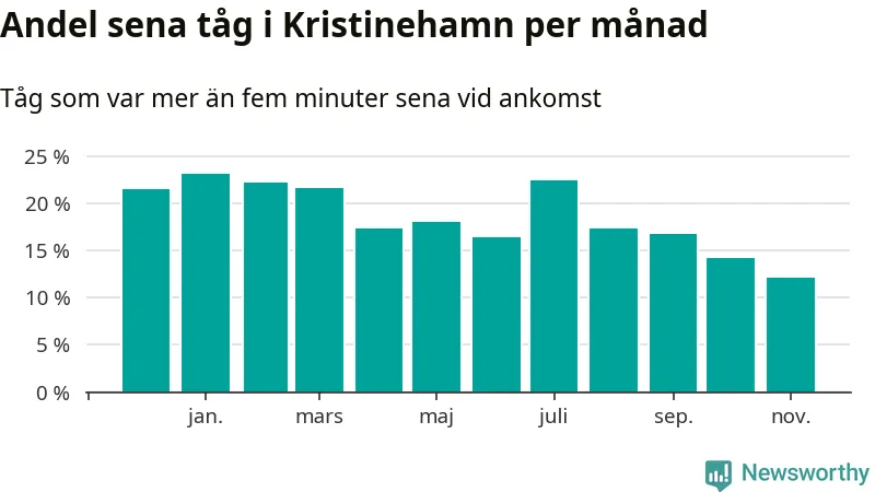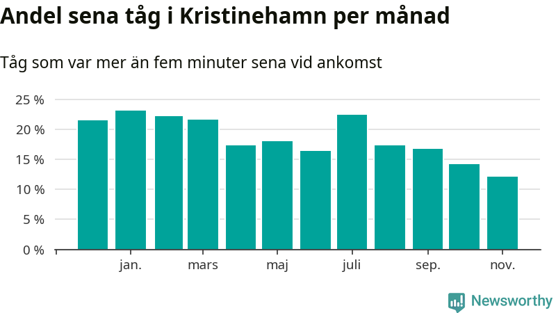 Den mest förseningsdrabbade månaden var januari, med i snitt 23 procent sena tåg enligt det måttet. Men de senaste fyra månaderna har andelen sena tåg varit på nedåtgående. Det senaste halvåret har andelen sena tåg varit lägre än halvåret innan dess.