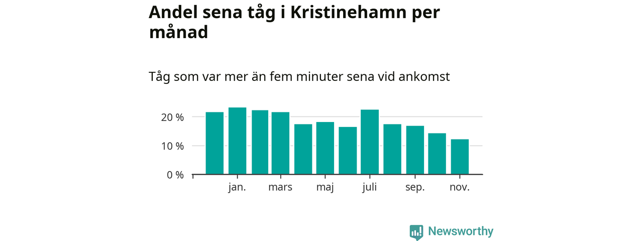 Under det senaste året har 19 procent av tågen varit sena när de passerat Kristinehamn. Ett tåg räknas här som sent om det varit mer än fem minuter efter tidtabellen.1