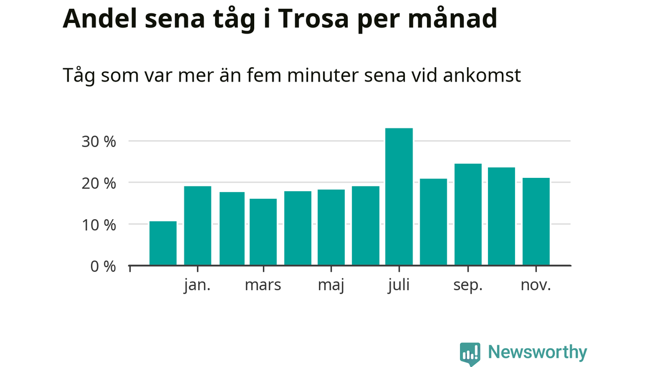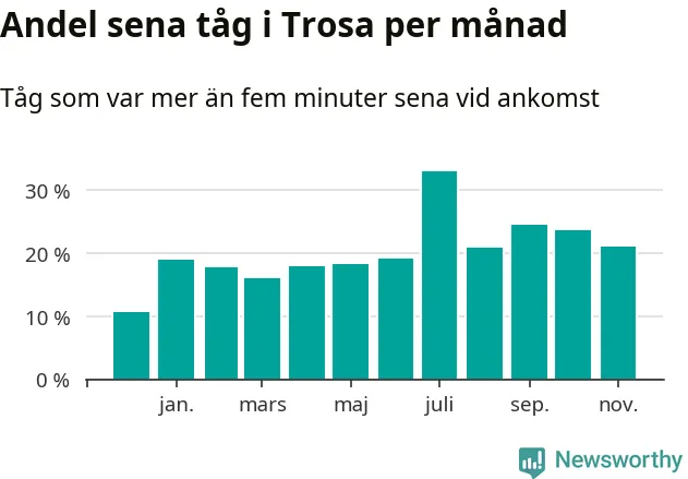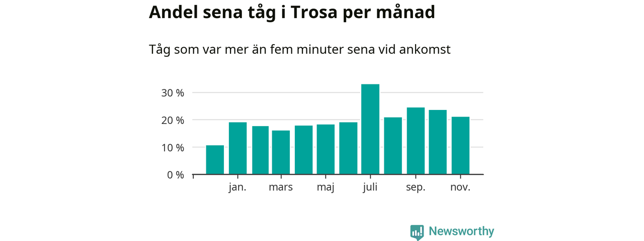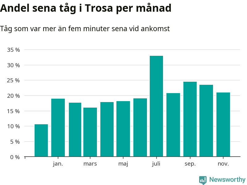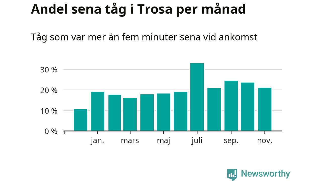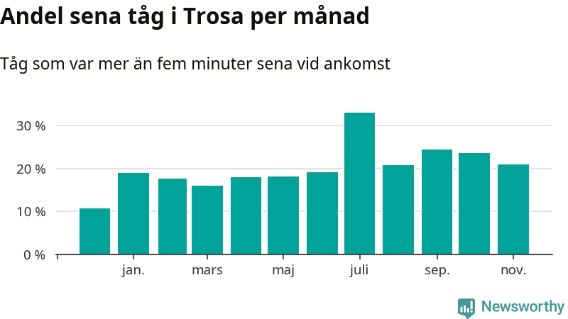 Den mest förseningsdrabbade månaden var juli, med i snitt 33 procent sena tåg enligt det måttet. Det senaste halvåret har andelen sena tåg varit högre än genomsnittet för halvåret innan dess.