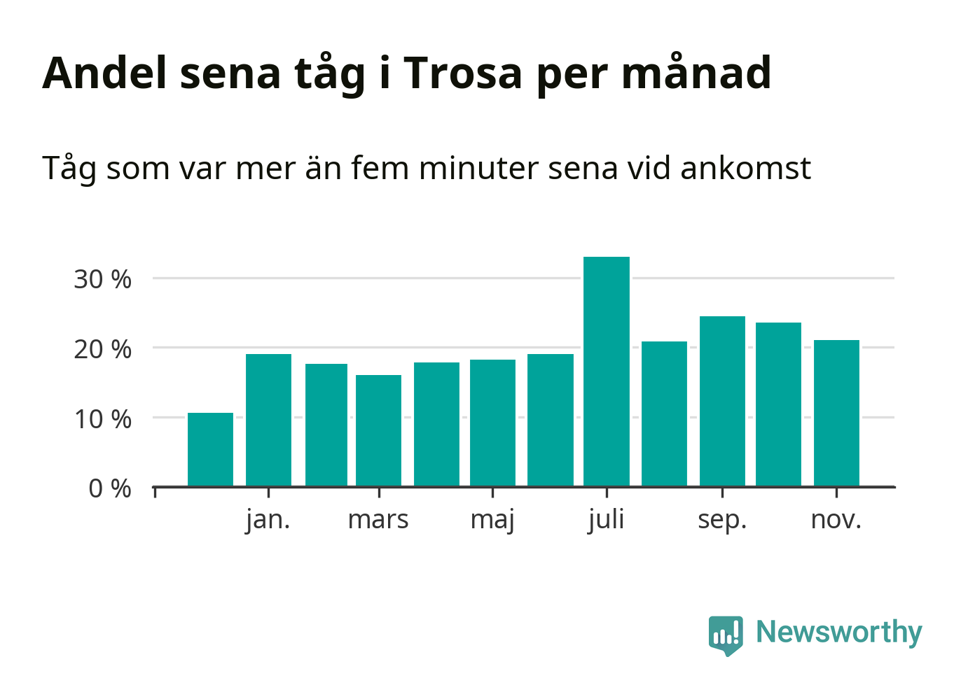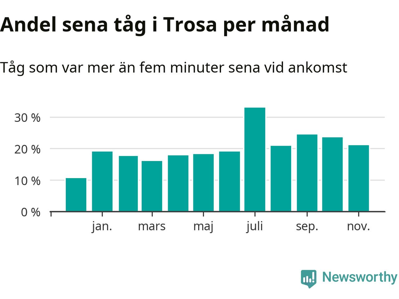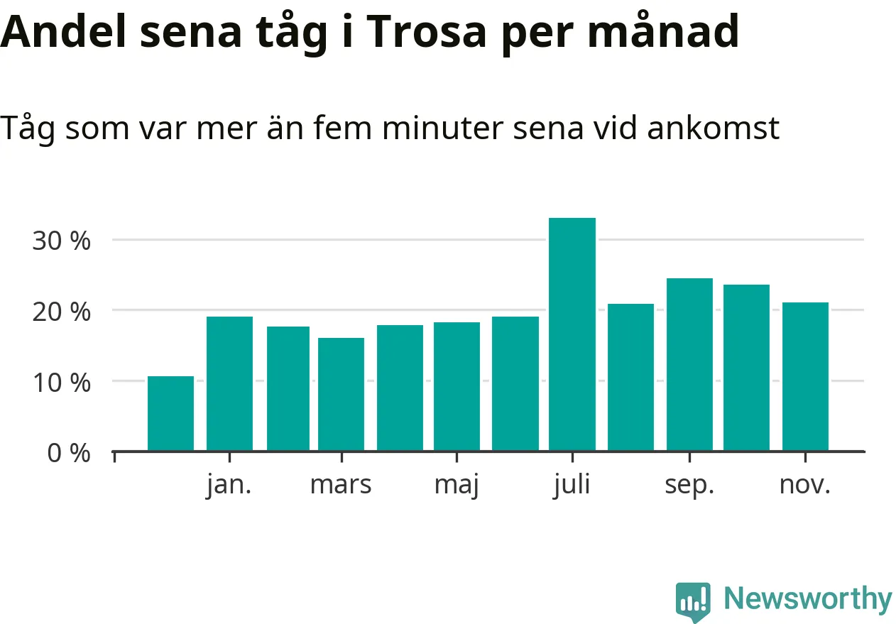 Den mest förseningsdrabbade månaden var juli, med i snitt 33 procent sena tåg enligt det måttet. Det senaste halvåret har andelen sena tåg varit högre än genomsnittet för halvåret innan dess.