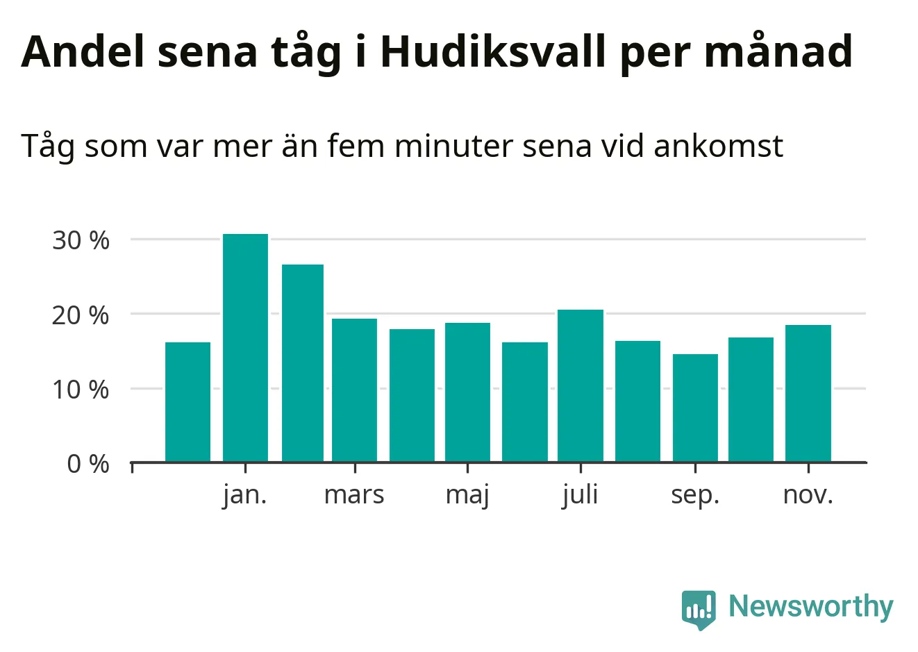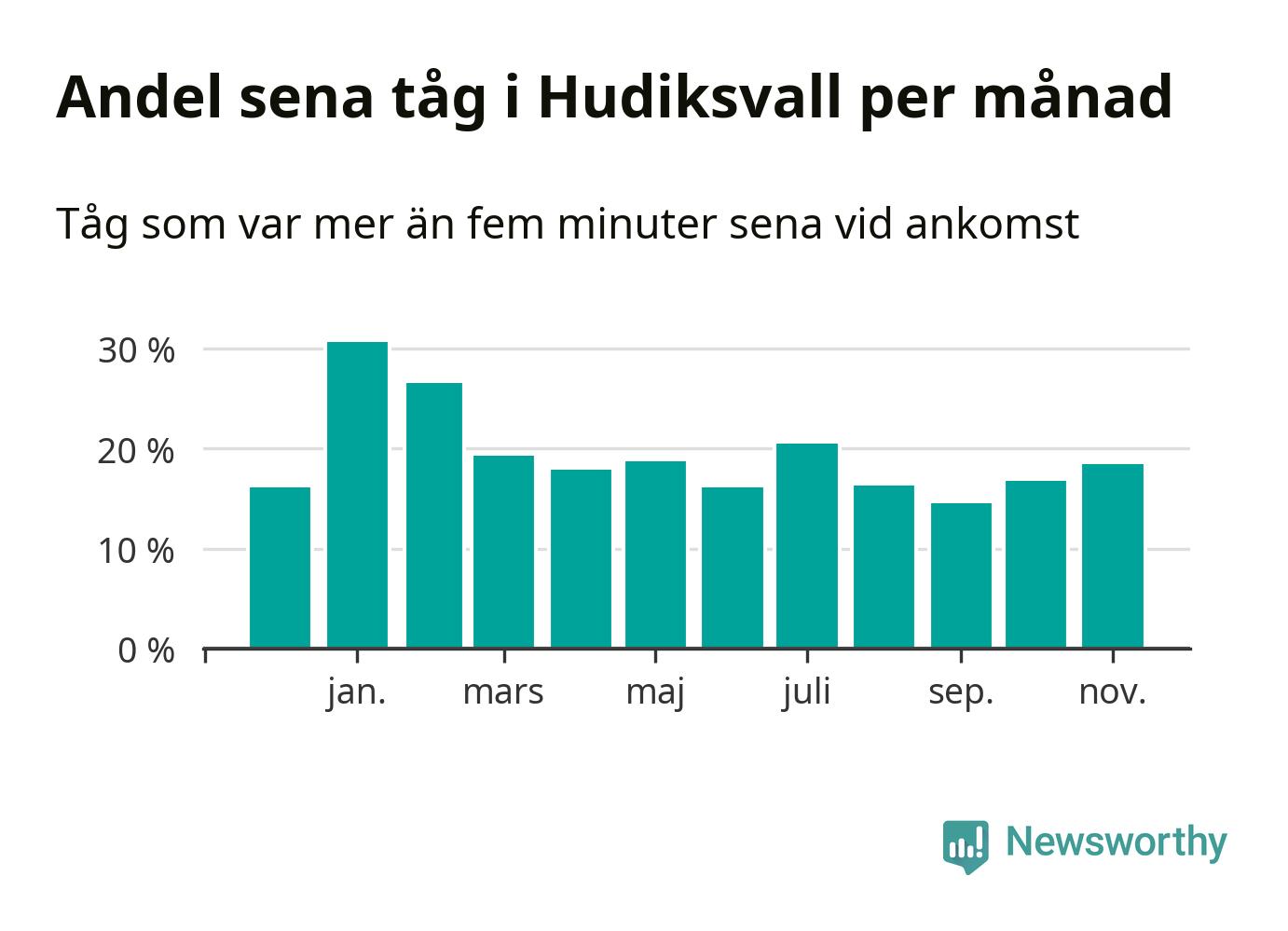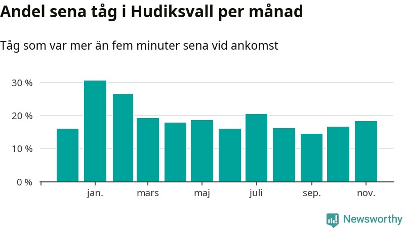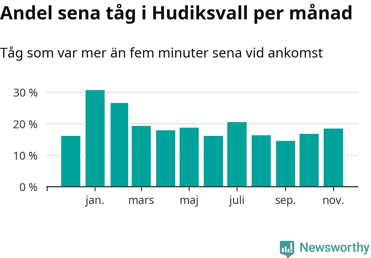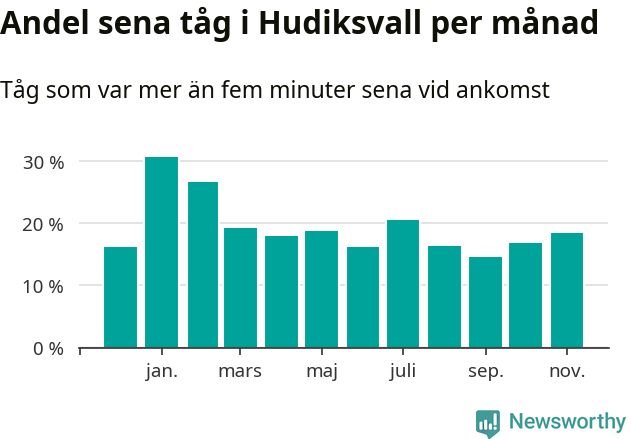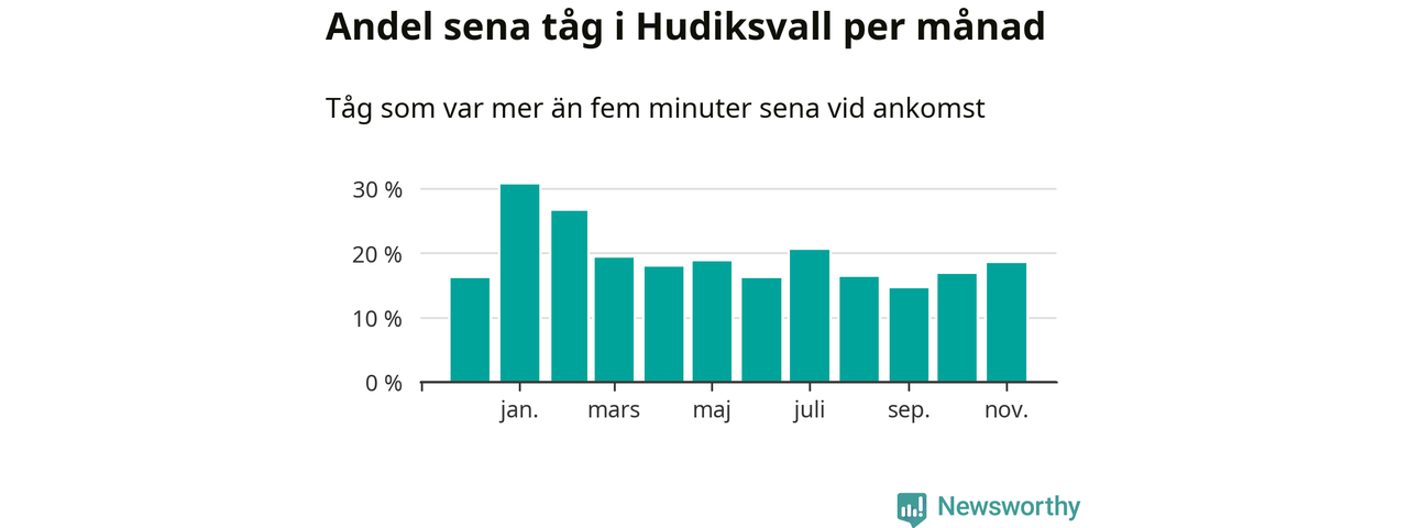 Den svenska järnvägsbranschen och Trafikverket har ett gemensamt mål om att 95 procent av tågen ska komma fram med högst fem minuters försening till sin slutstation. Dit är det långt i de flesta delar av landet. I Hudiksvall var förseningarna färre än 5 procent under endast en vecka av 52 det senaste året. Det ska noteras att siffrorna i den här artikeln skiljer sig från det officiella punktlighetsmåttet, som bara beaktar ankomster till slutstationer, och där insamlingen sker på ett annat sätt än i den här artikeln.