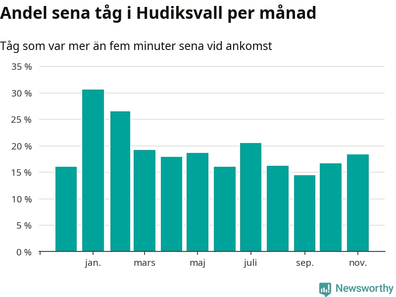 Den mest förseningsdrabbade månaden var januari, med i snitt 31 procent sena tåg enligt det måttet. Det senaste halvåret har andelen sena tåg varit lägre än halvåret innan dess.