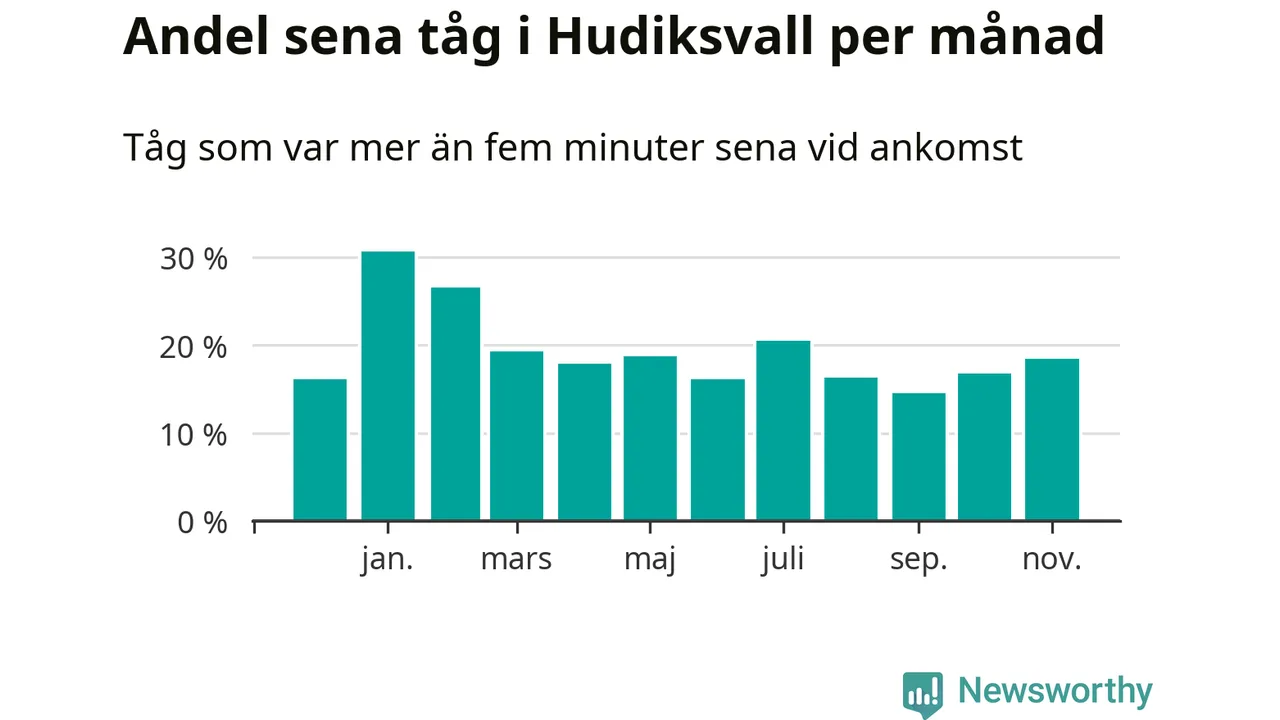 Under det senaste året har 19 procent av tågen varit sena när de passerat Hudiksvall eller Iggesund i Hudiksvalls kommun. Ett tåg räknas här som sent om det varit mer än fem minuter efter tidtabellen.1