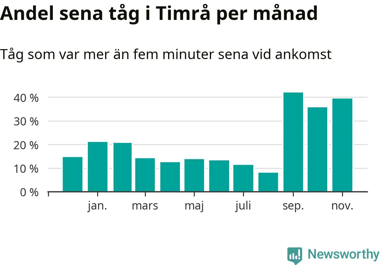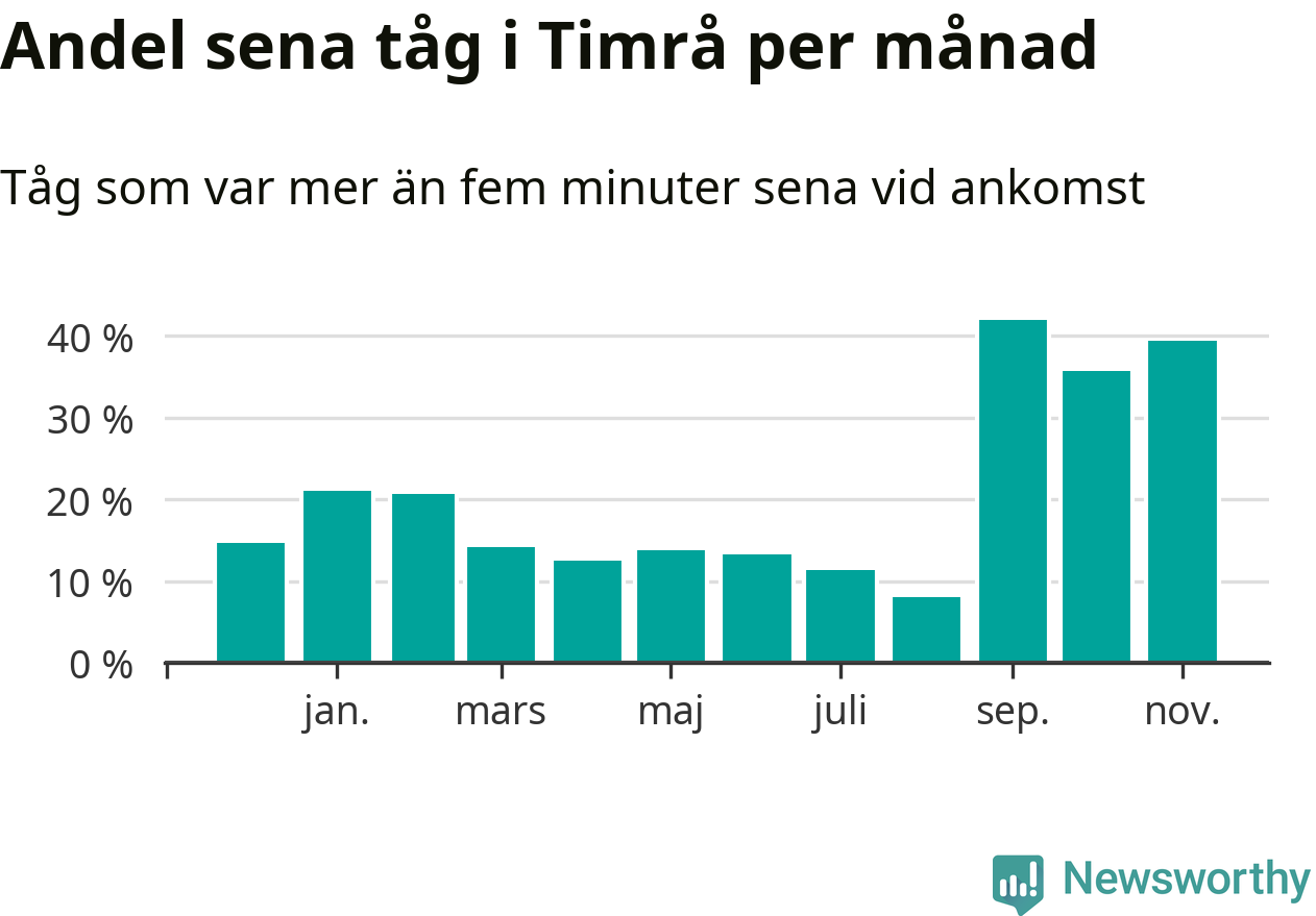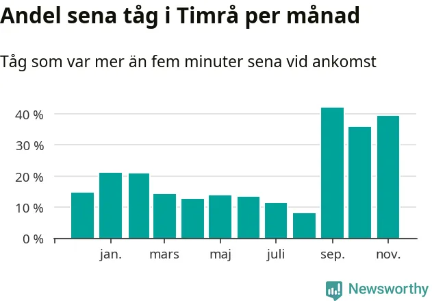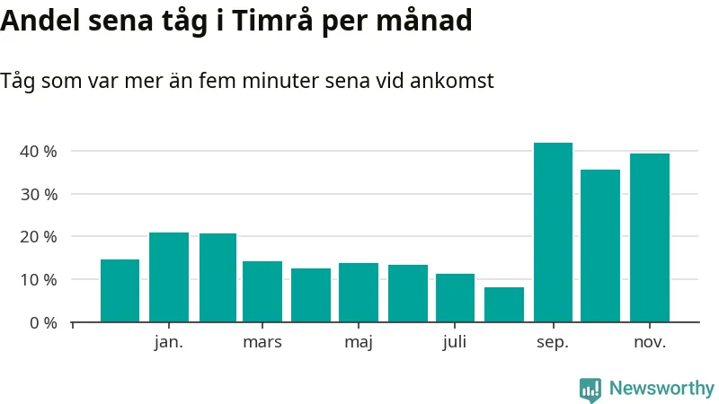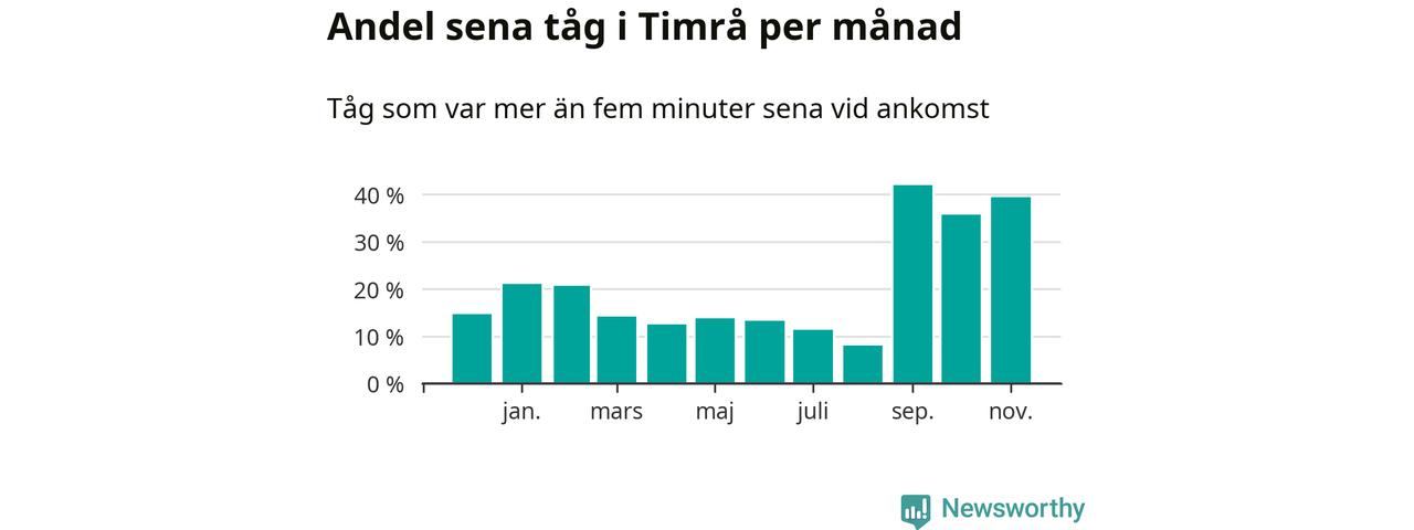 Den mest förseningsdrabbade månaden var september, med i snitt 42 procent sena tåg enligt det måttet.