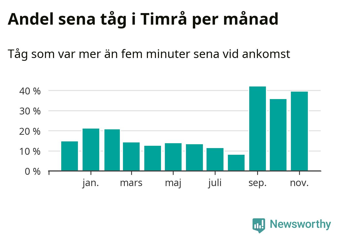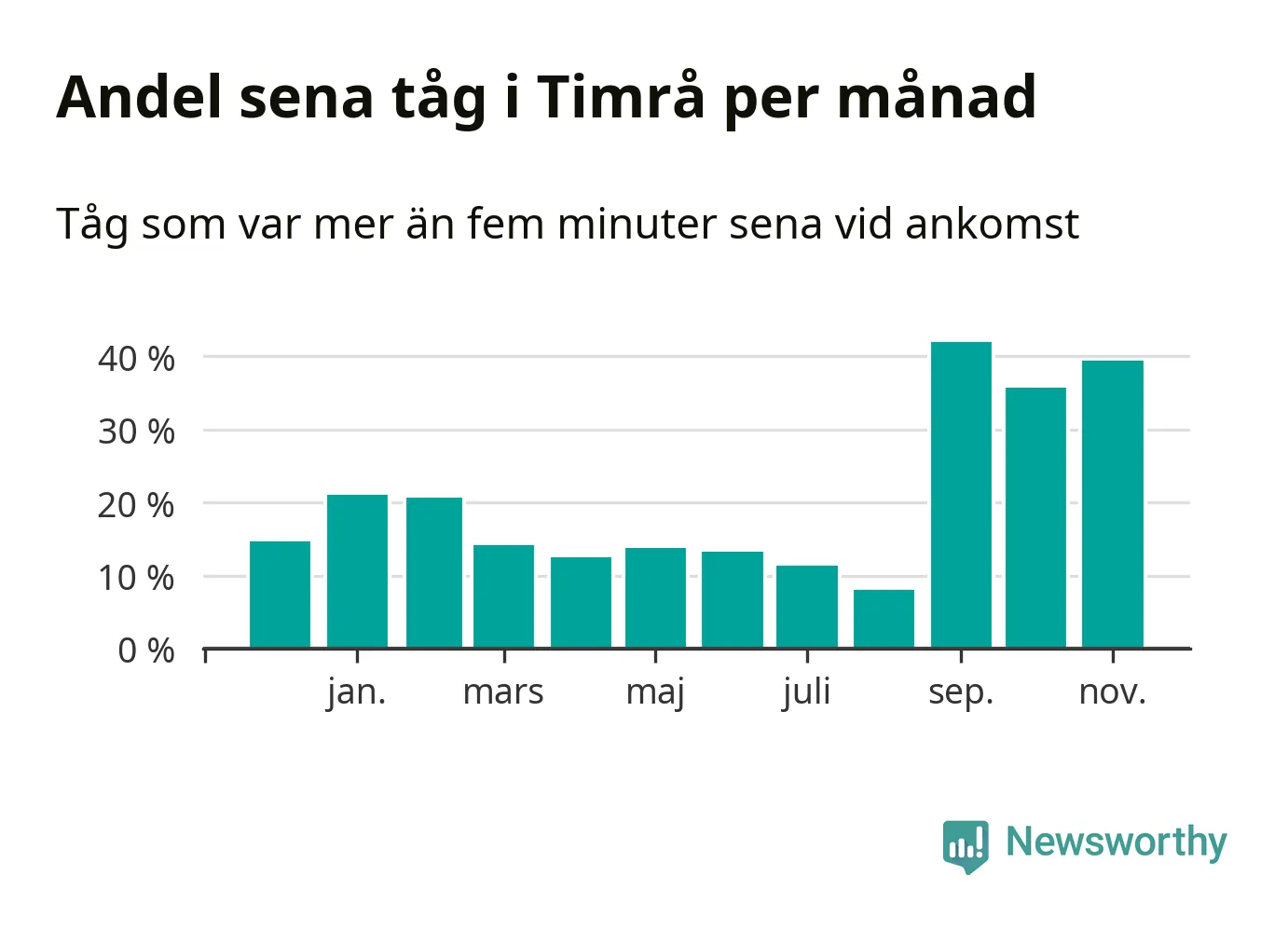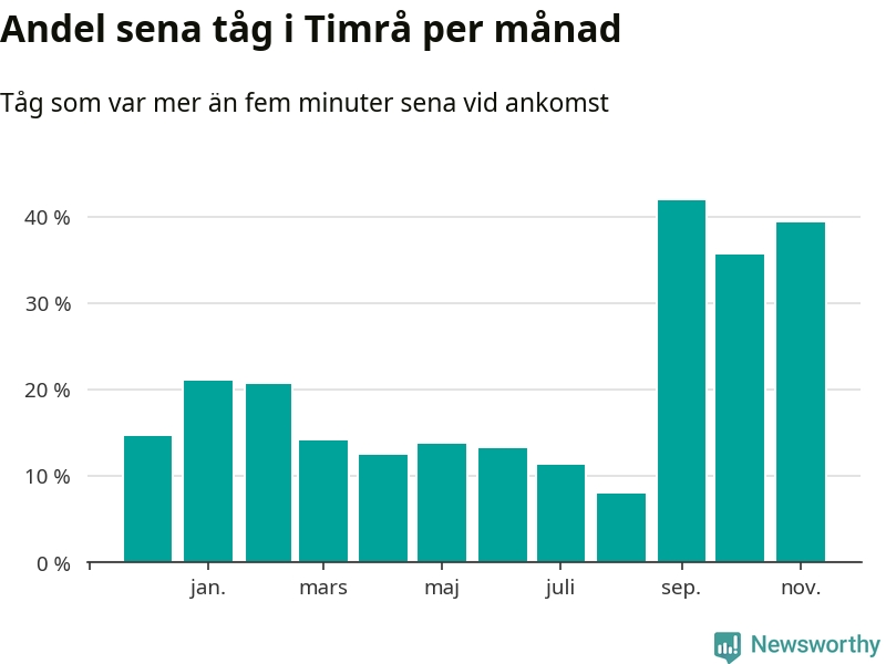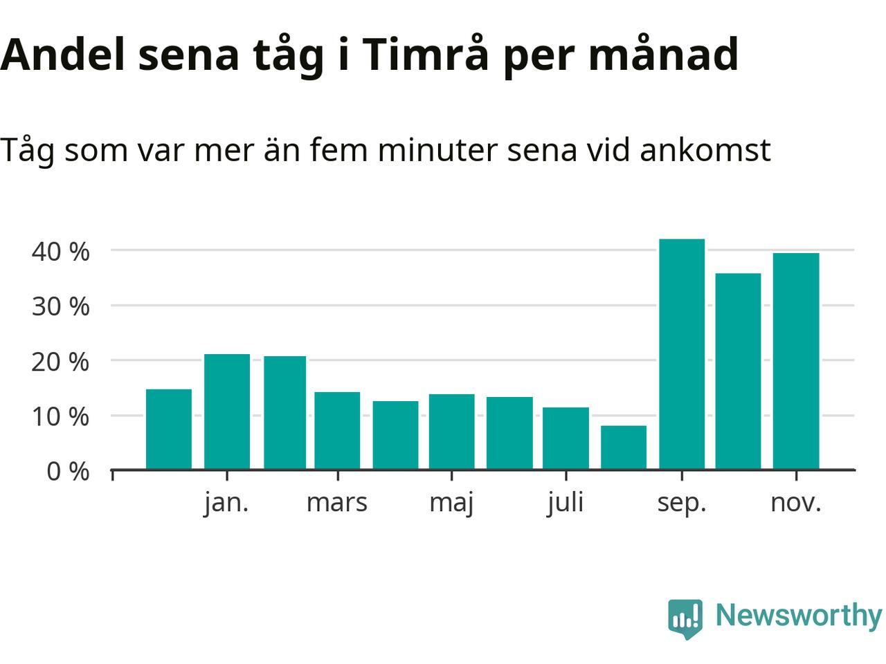 Den mest förseningsdrabbade månaden var september, med i snitt 42 procent sena tåg enligt det måttet.