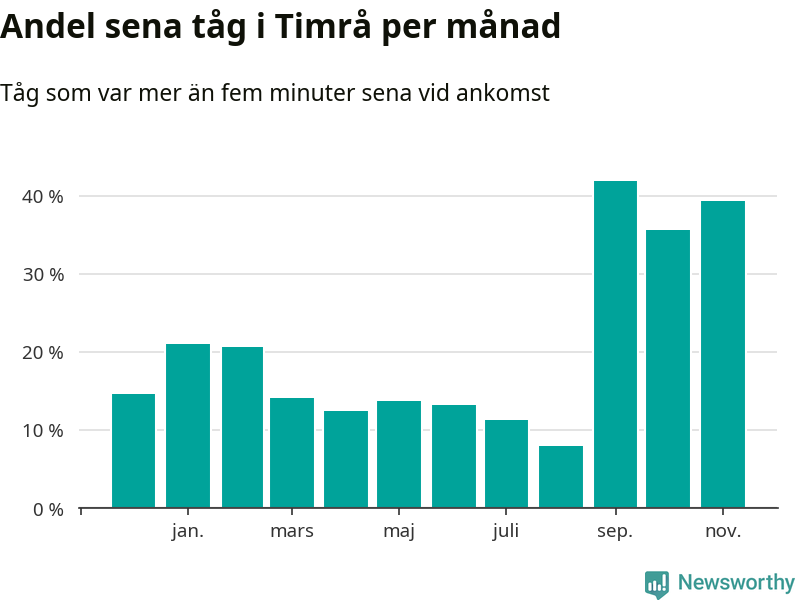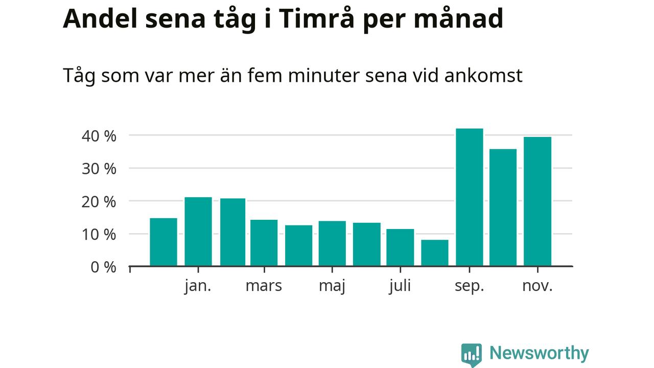Under det senaste året har 20 procent av tågen varit sena när de passerat Timrå station. Ett tåg räknas här som sent om det varit mer än fem minuter efter tidtabellen.1