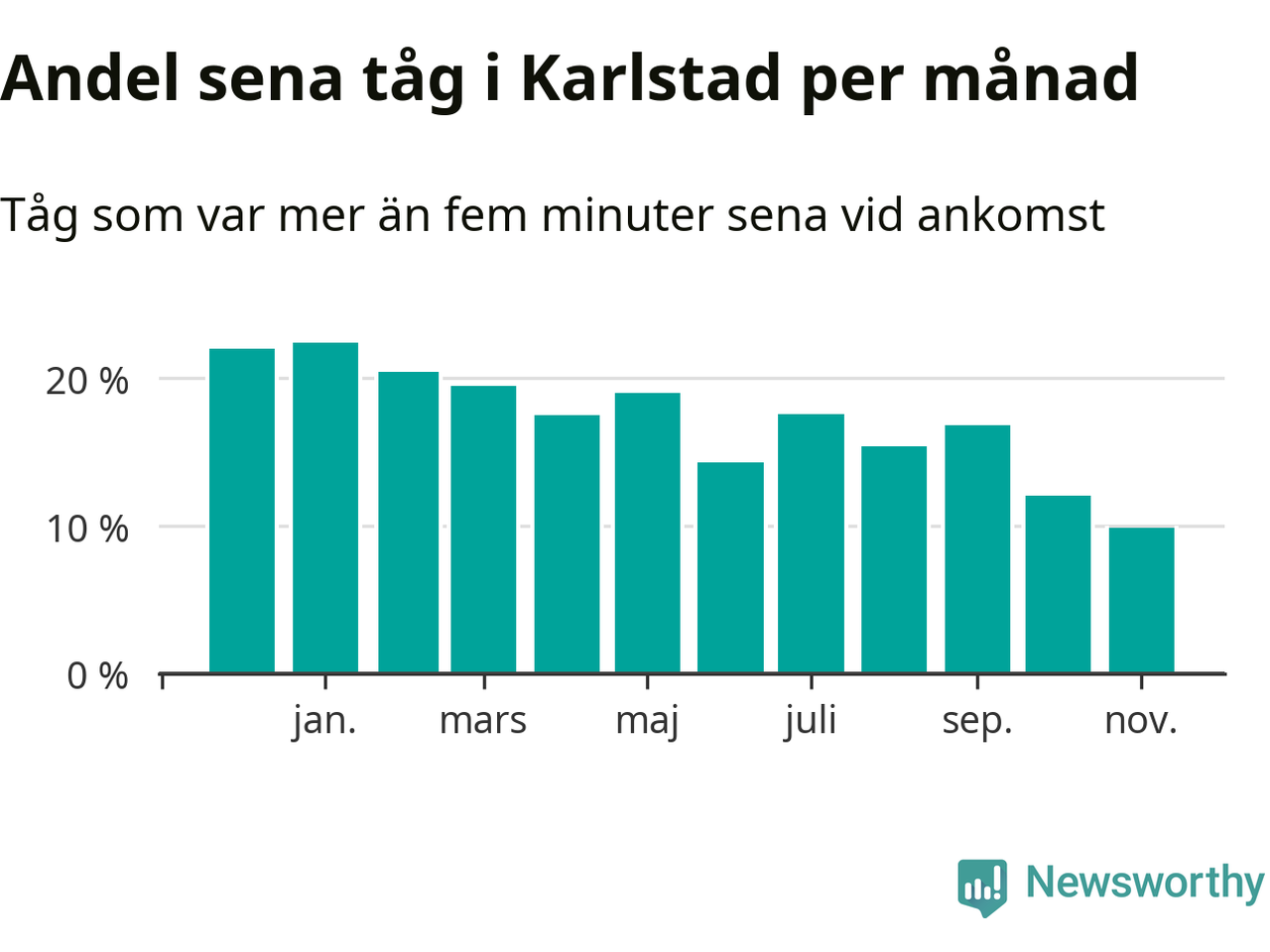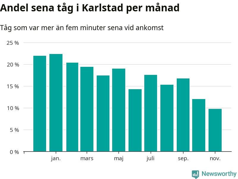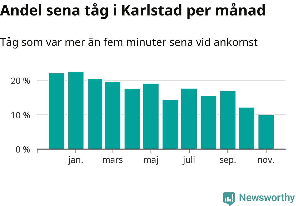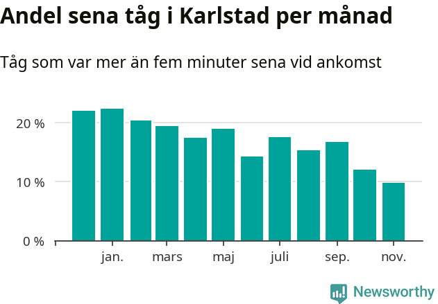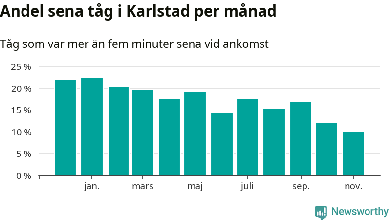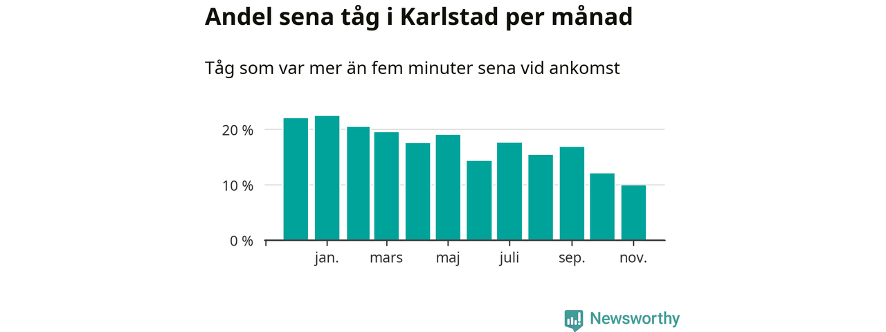 Det senaste halvåret har andelen sena tåg vid stationerna i Karlstads kommun varit lägre än halvåret innan dess. Newsworthy och Sveriges Natur har studerat tågens punktlighet det senaste året, på jakt efter järnvägens flaskhalsar.