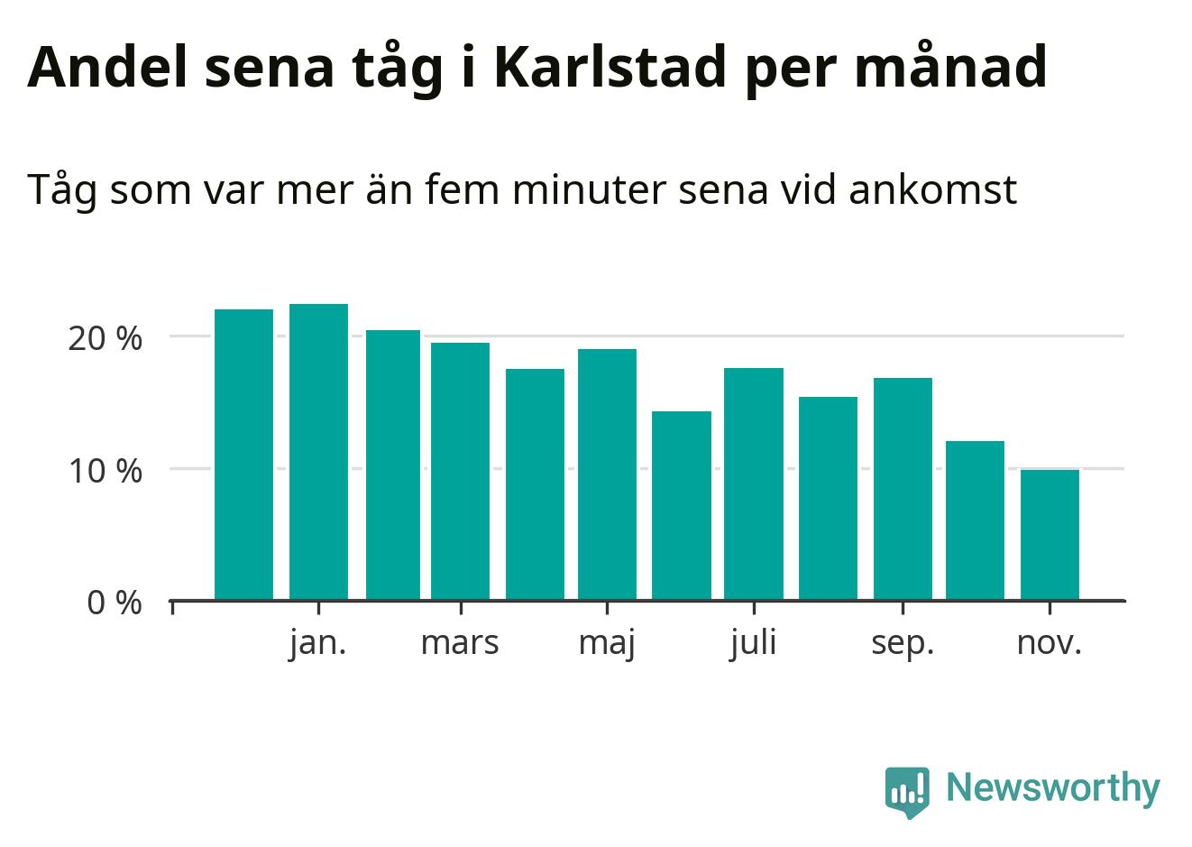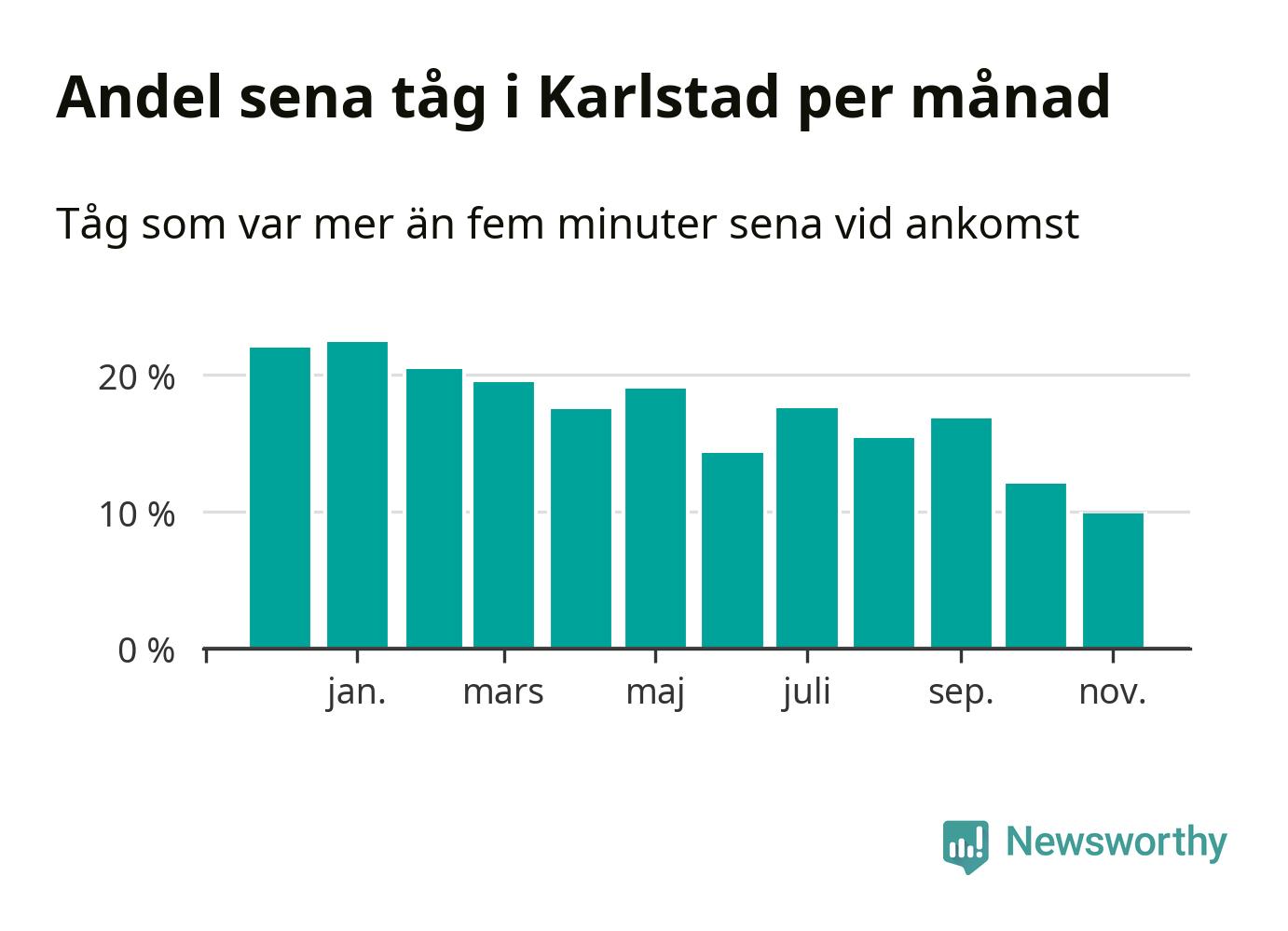 Den mest förseningsdrabbade månaden var januari, med i snitt 22 procent sena tåg enligt det måttet. Det senaste halvåret har andelen sena tåg varit lägre än halvåret innan dess.