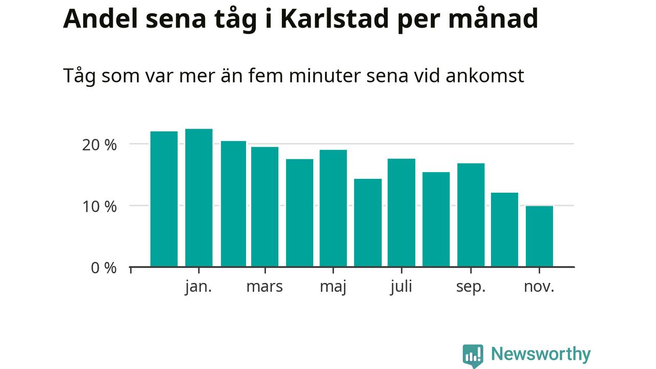 Under det senaste året har 17 procent av tågen varit sena när de passerat Karlstad C, Välsviken eller Väse i Karlstads kommun. Ett tåg räknas här som sent om det varit mer än fem minuter efter tidtabellen.1