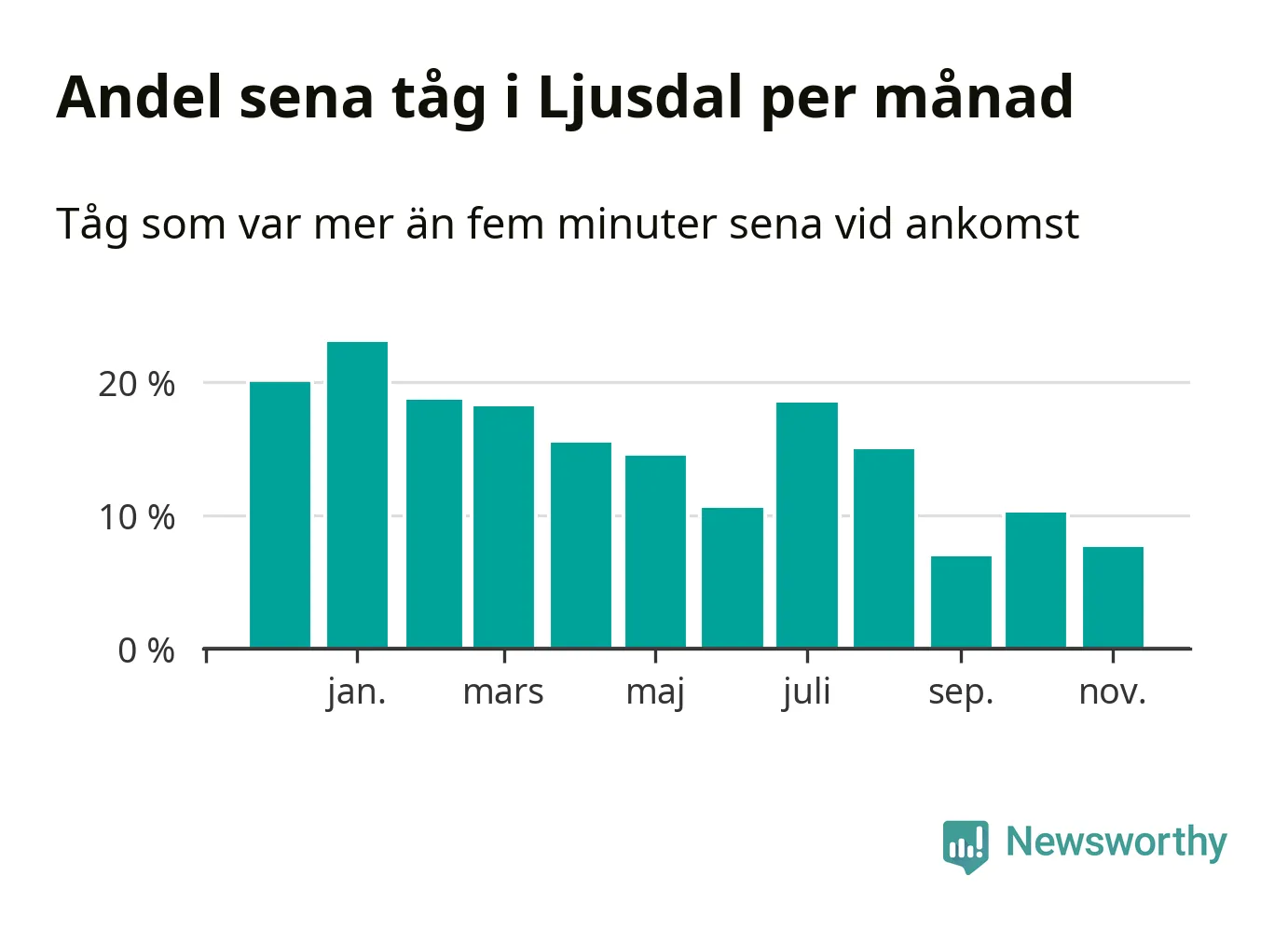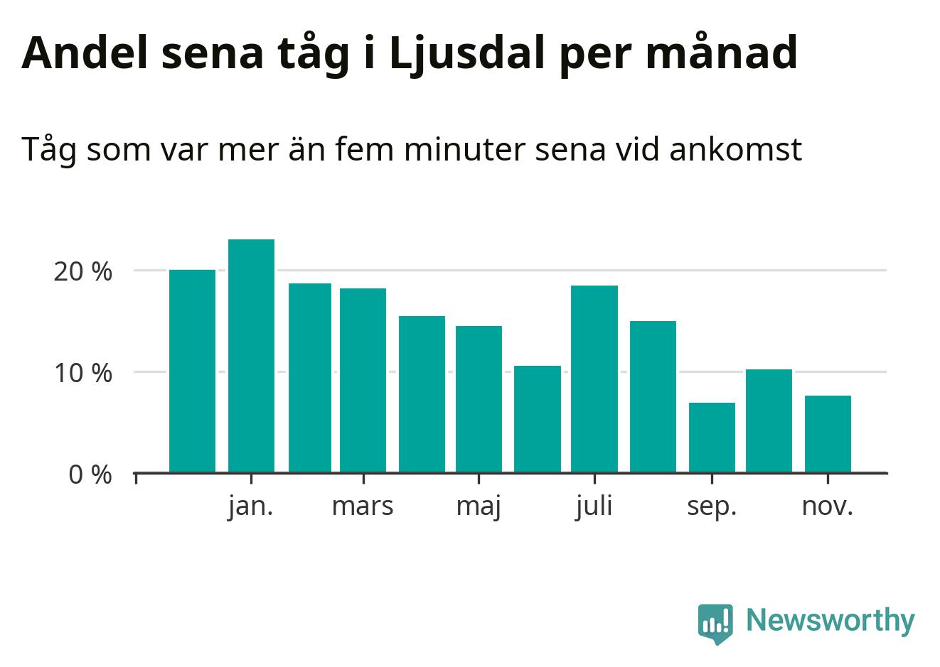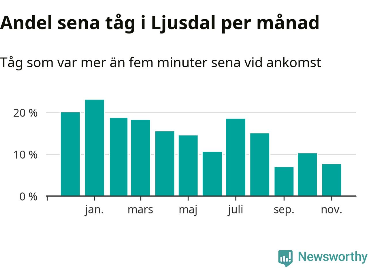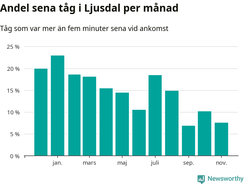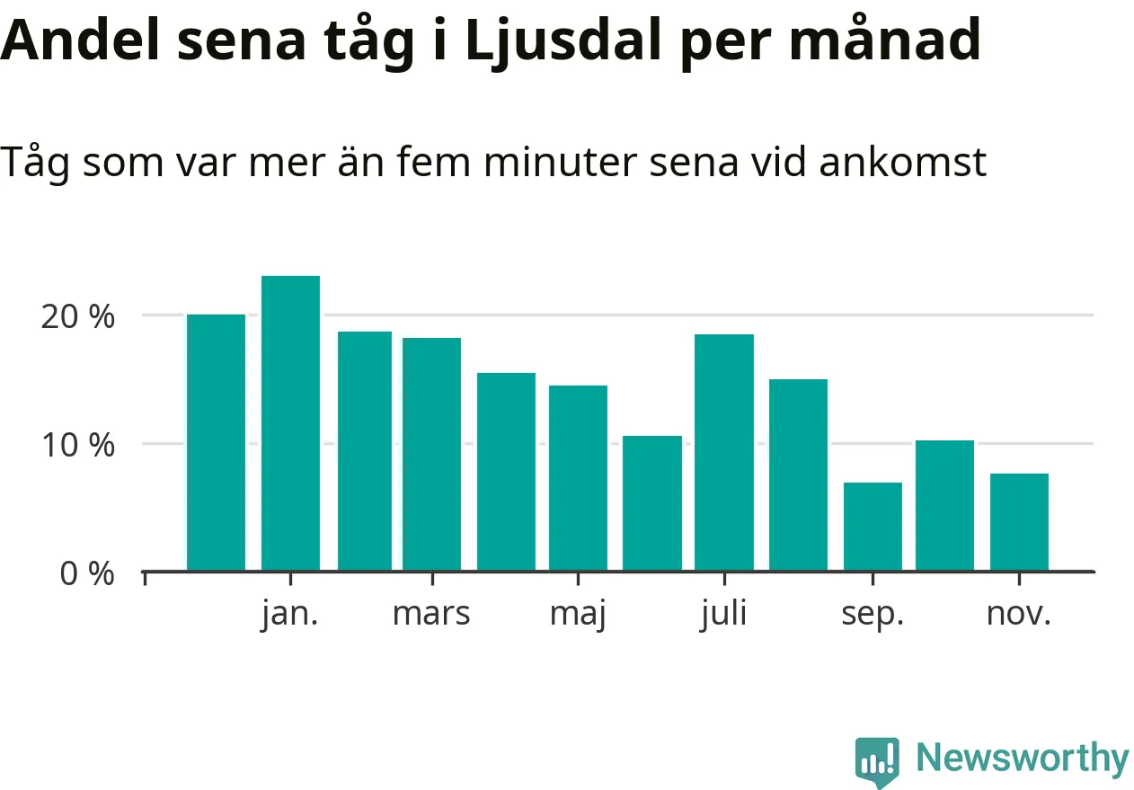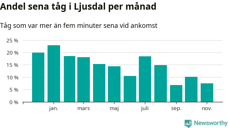Den mest förseningsdrabbade månaden var januari, med i snitt 23 procent sena tåg enligt det måttet. Det senaste halvåret har andelen sena tåg varit lägre än halvåret innan dess.