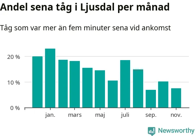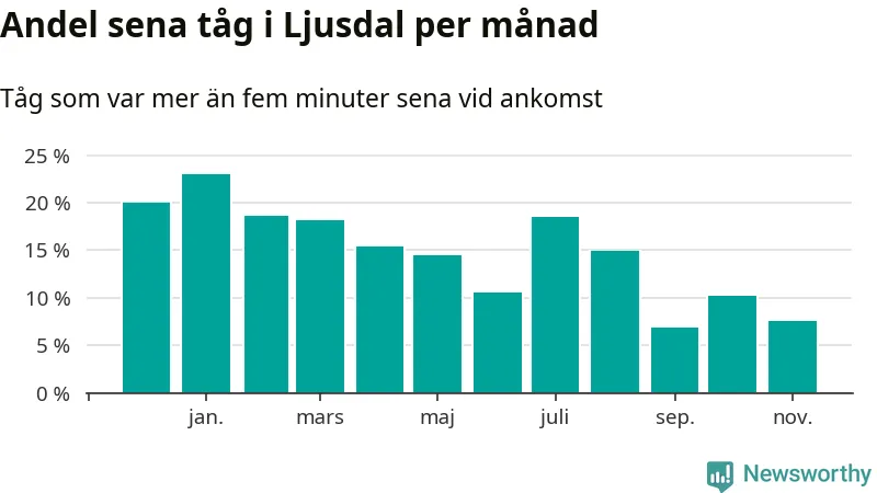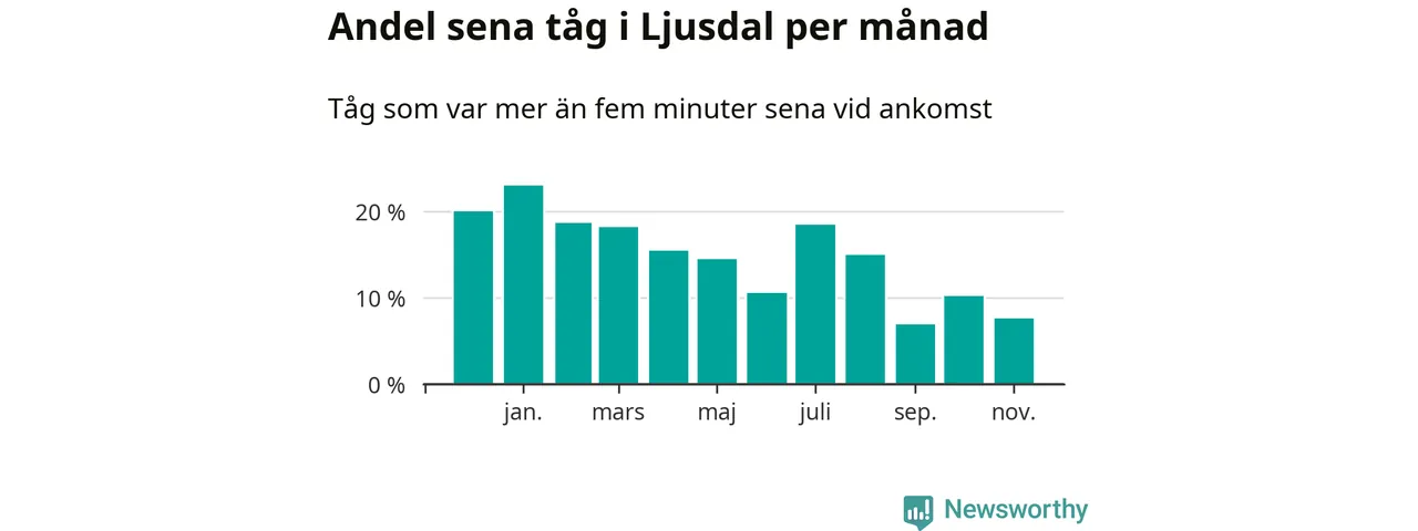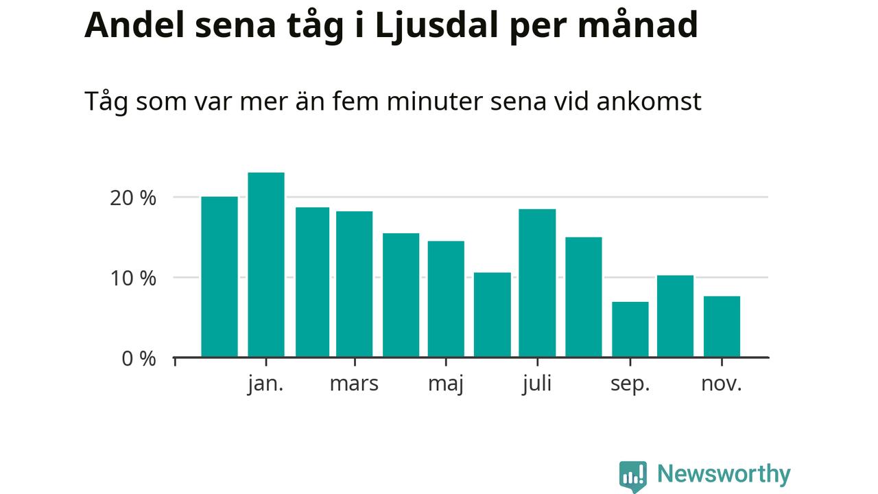 Den svenska järnvägsbranschen och Trafikverket har ett gemensamt mål om att 95 procent av tågen ska komma fram med högst fem minuters försening till sin slutstation. Dit är det långt i de flesta delar av landet. I Ljusdal var förseningarna färre än 5 procent under endast en vecka av 52 det senaste året. Det ska noteras att siffrorna i den här artikeln skiljer sig från det officiella punktlighetsmåttet, som bara beaktar ankomster till slutstationer, och där insamlingen sker på ett annat sätt än i den här artikeln.