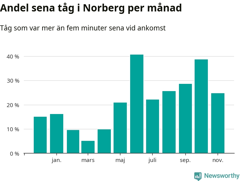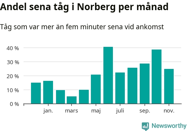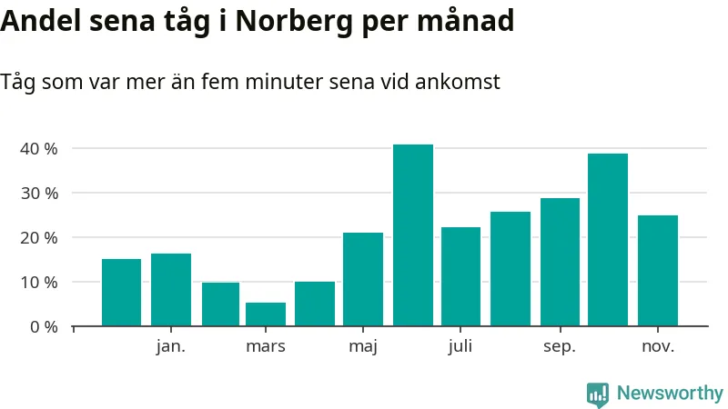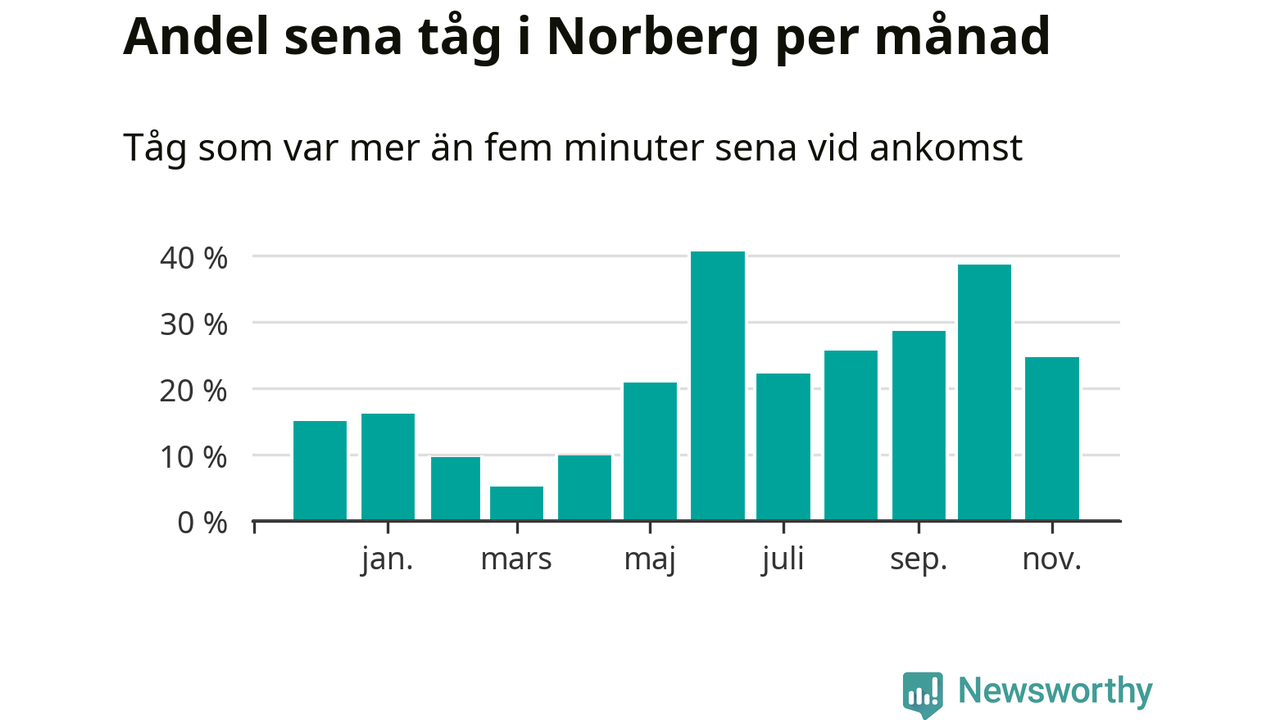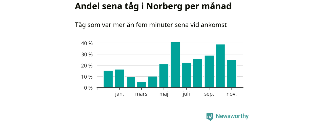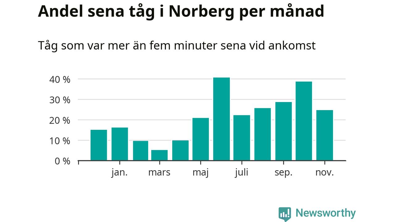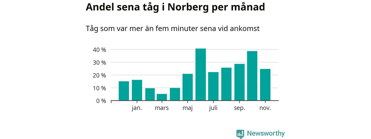 Den mest förseningsdrabbade månaden var juni, med i snitt 41 procent sena tåg enligt det måttet. Det senaste halvåret har andelen sena tåg varit högre än genomsnittet för halvåret innan dess.
