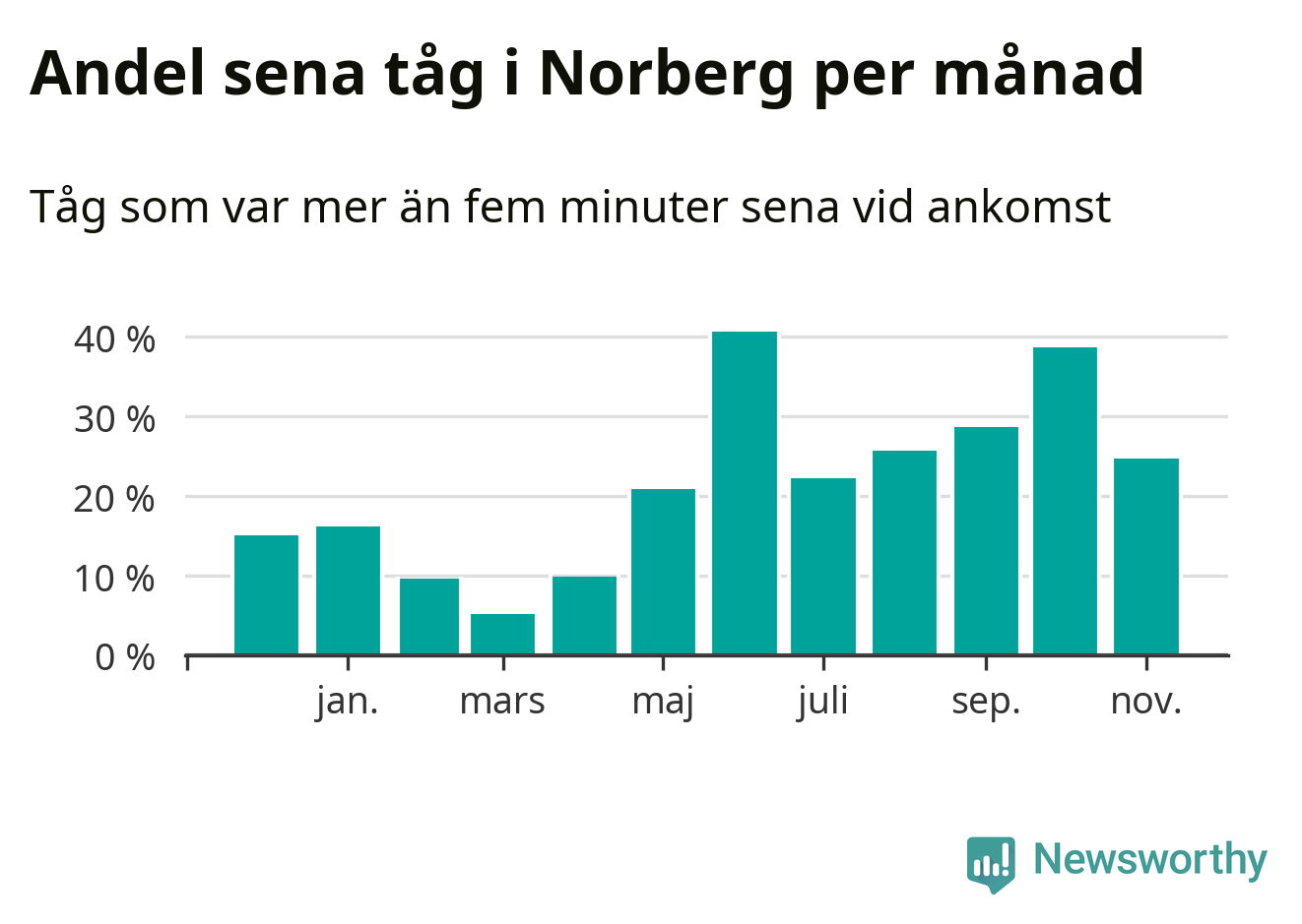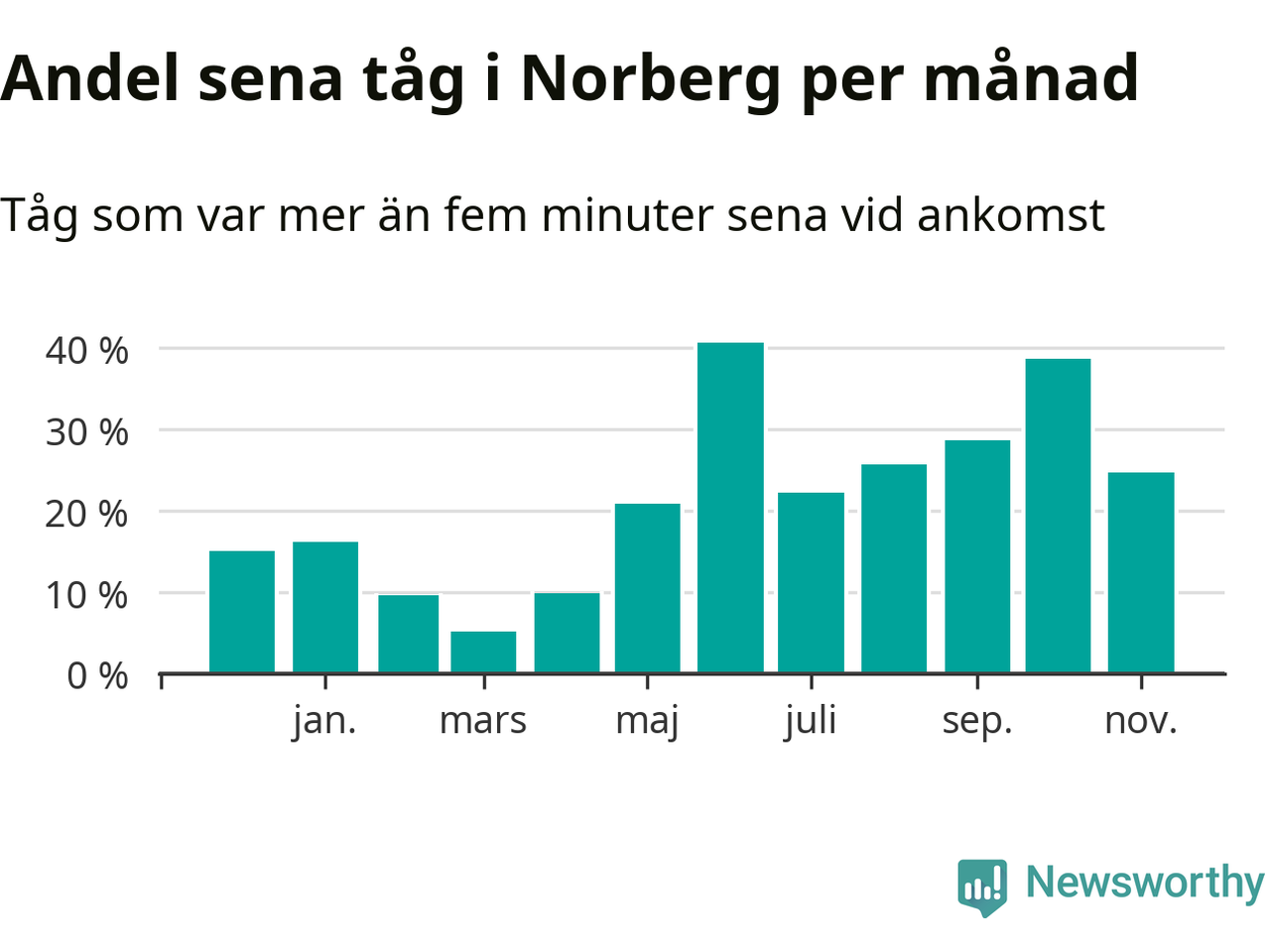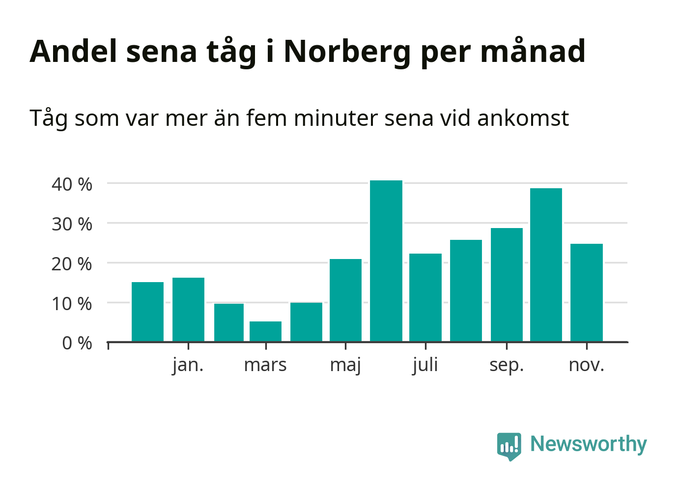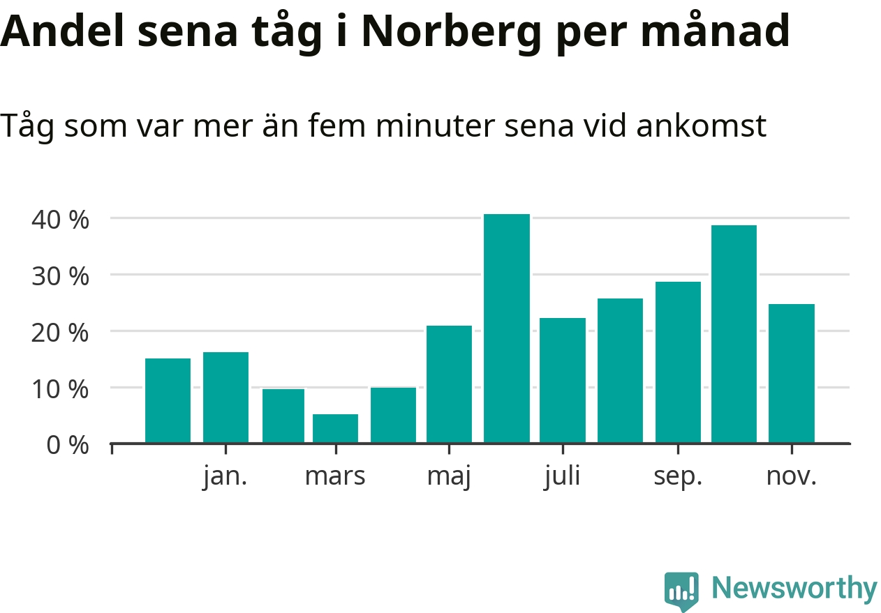 Den mest förseningsdrabbade månaden var juni, med i snitt 41 procent sena tåg enligt det måttet. Det senaste halvåret har andelen sena tåg varit högre än genomsnittet för halvåret innan dess.
