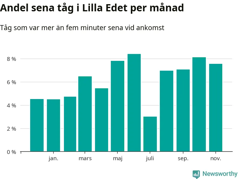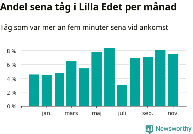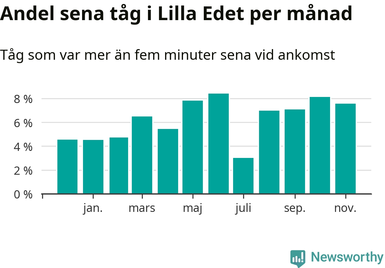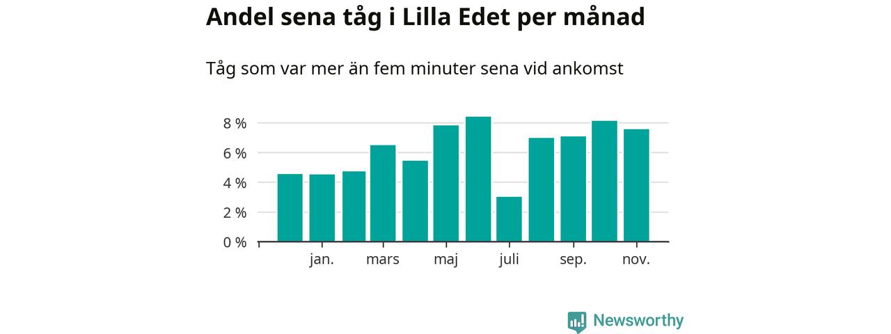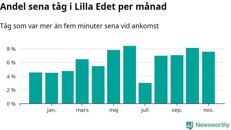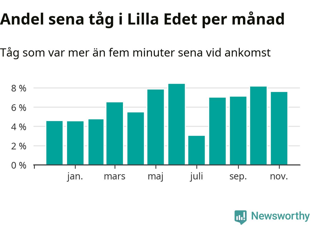 Den mest förseningsdrabbade månaden var juni, med i snitt åtta procent sena tåg enligt det måttet. Det senaste halvåret har andelen sena tåg varit högre än genomsnittet för halvåret innan dess.