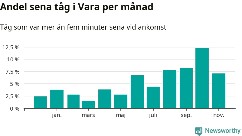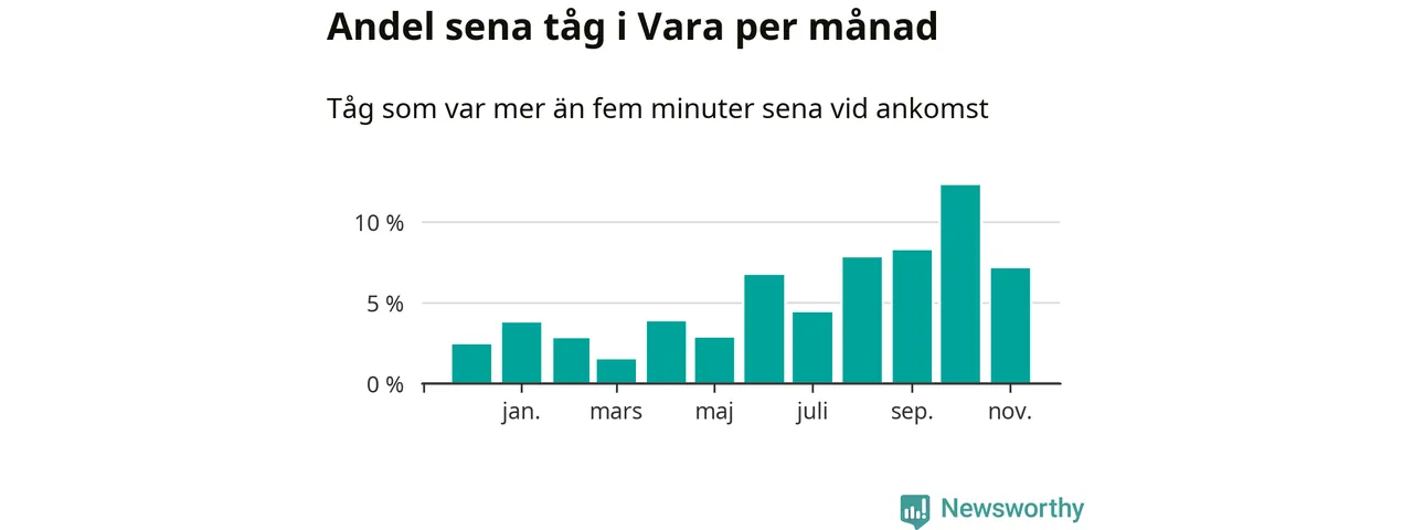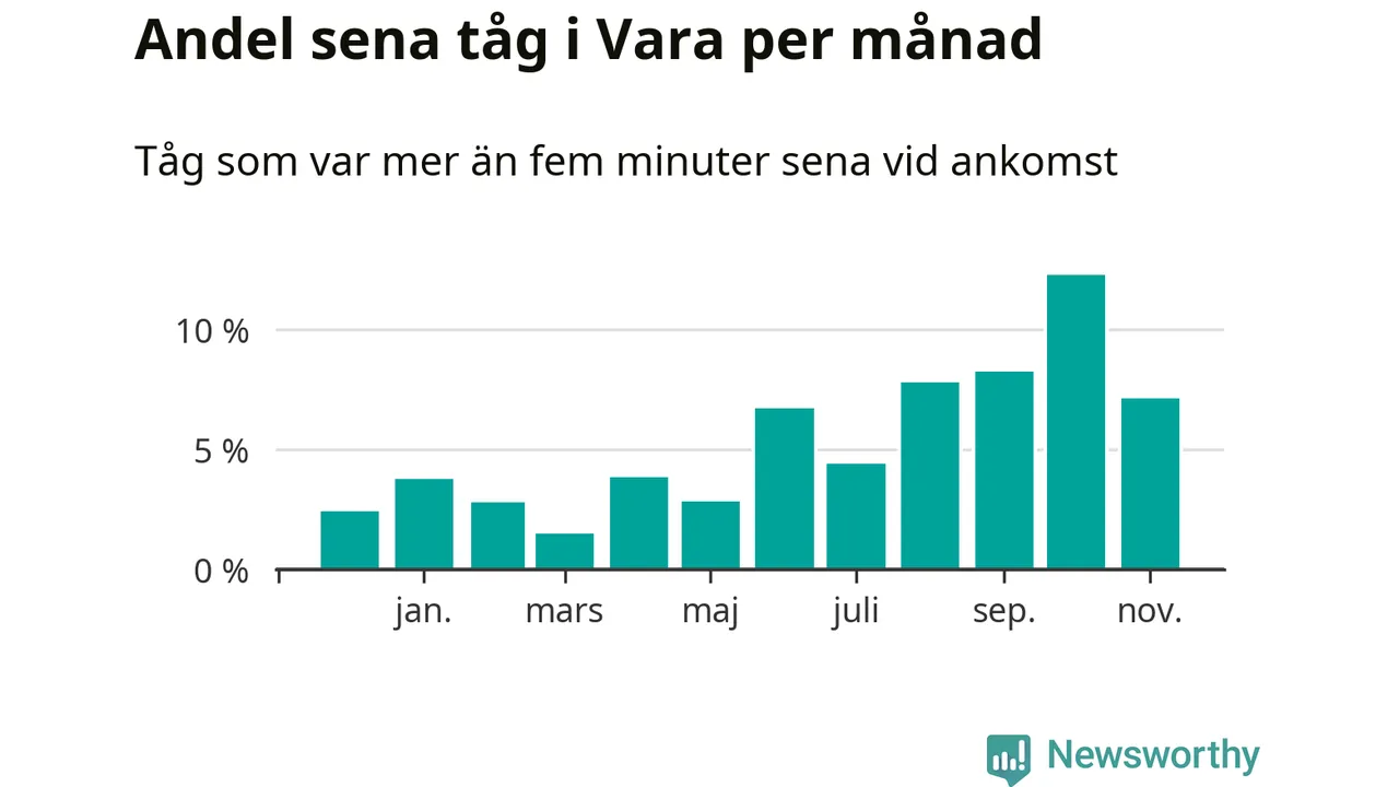 Det senaste halvåret har andelen sena tåg vid stationerna i Vara kommun varit högre än halvåret innan dess. Newsworthy och Sveriges Natur har studerat tågens punktlighet det senaste året, på jakt efter järnvägens flaskhalsar.
