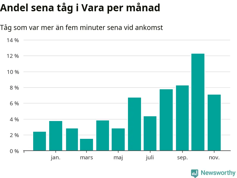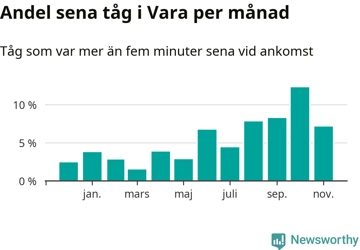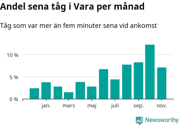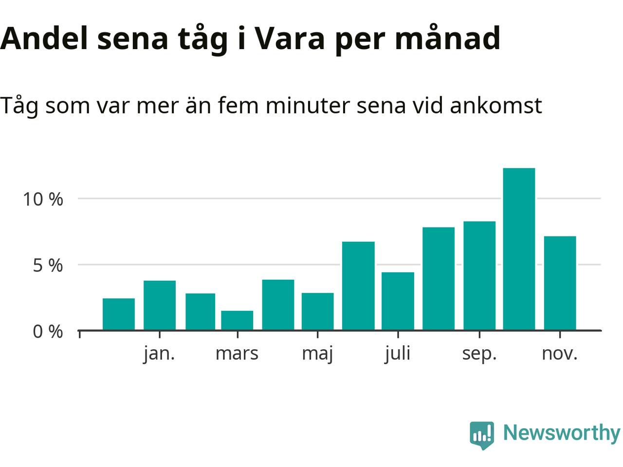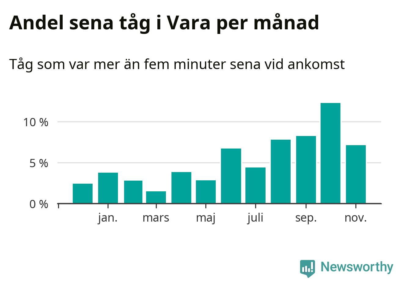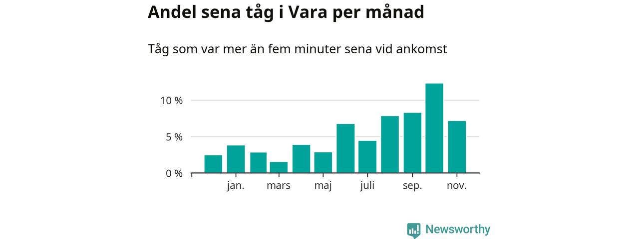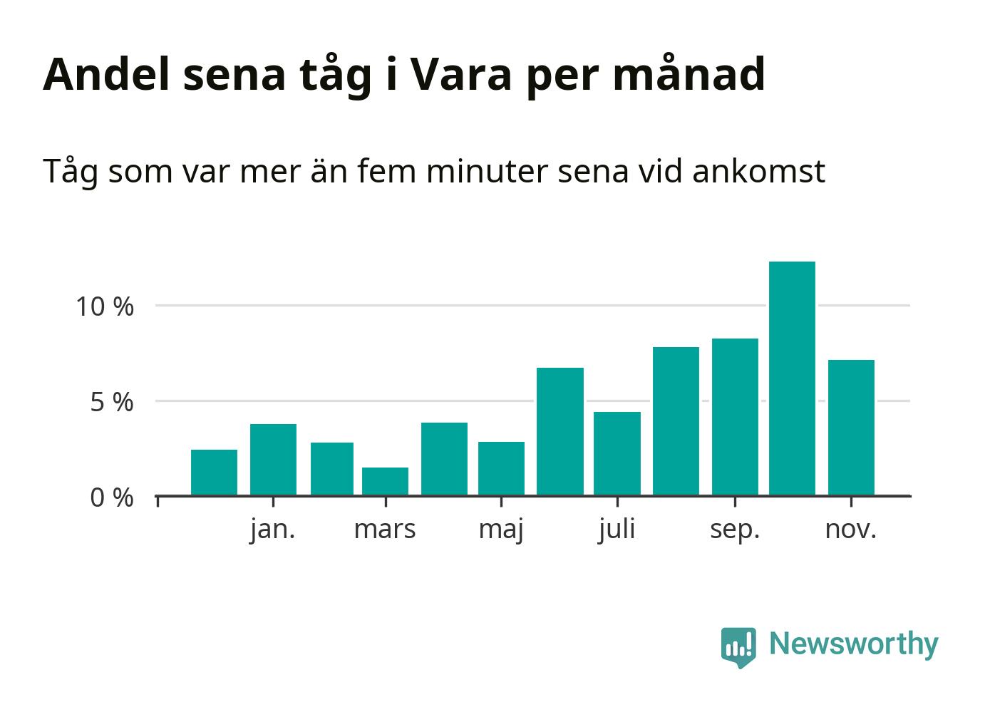 Den svenska järnvägsbranschen och Trafikverket har ett gemensamt mål om att 95 procent av tågen ska komma fram med högst fem minuters försening till sin slutstation. Tågtrafiken i Vara låg på rätt sida om den gränsen stora delar av det senaste året, 31 av 52 veckor, även om det officiella punktlighetsmåttet (ankomst till slutstation) inte är rakt av jämförbart med det som används i den här artikeln (där vi tittar på alla tåg som passerar en station).