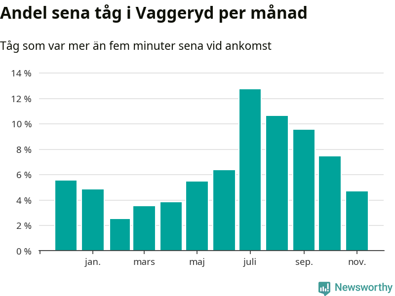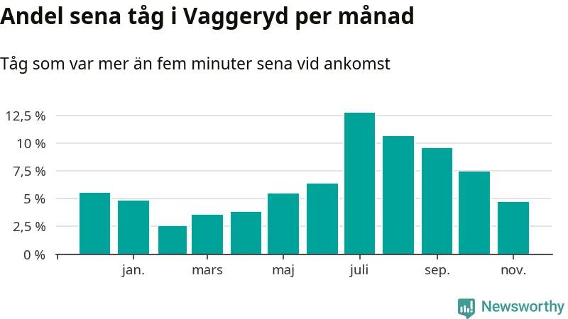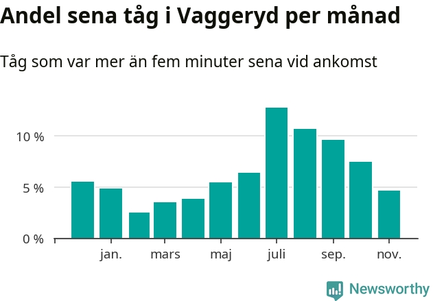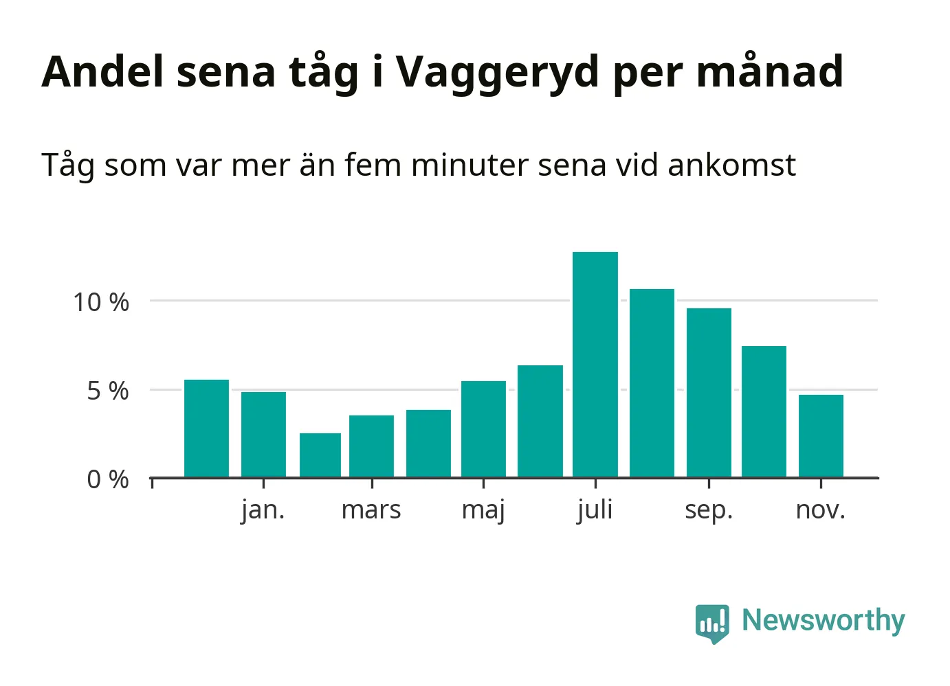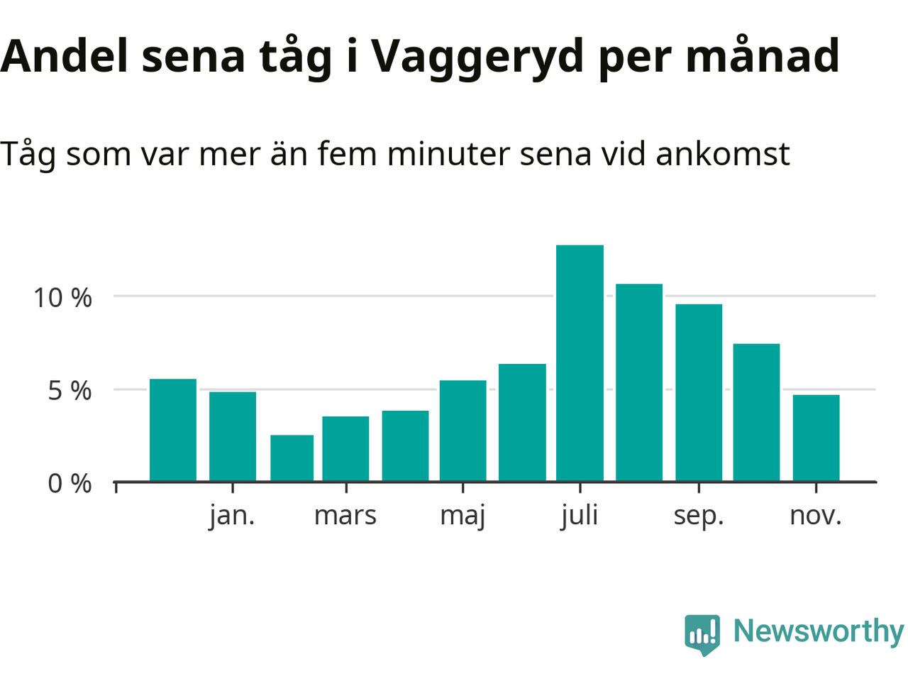 Den svenska järnvägsbranschen och Trafikverket har ett gemensamt mål om att 95 procent av tågen ska komma fram med högst fem minuters försening till sin slutstation. Tågtrafiken i Vaggeryd låg på rätt sida om den gränsen 24 av 52 veckor det senaste året, även om det officiella punktlighetsmåttet (ankomst till slutstation) inte är rakt av jämförbart med det som används i den här artikeln (där vi tittar på alla tåg som passerar en station).