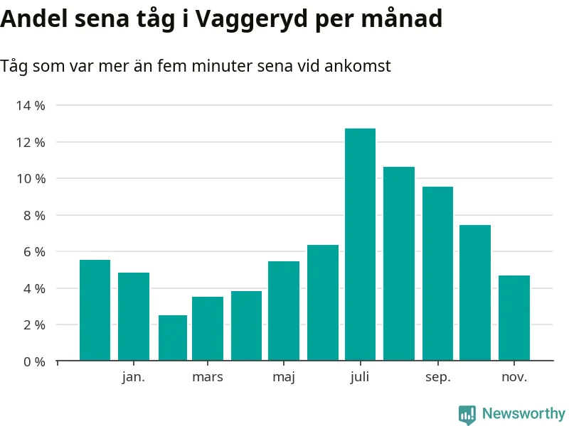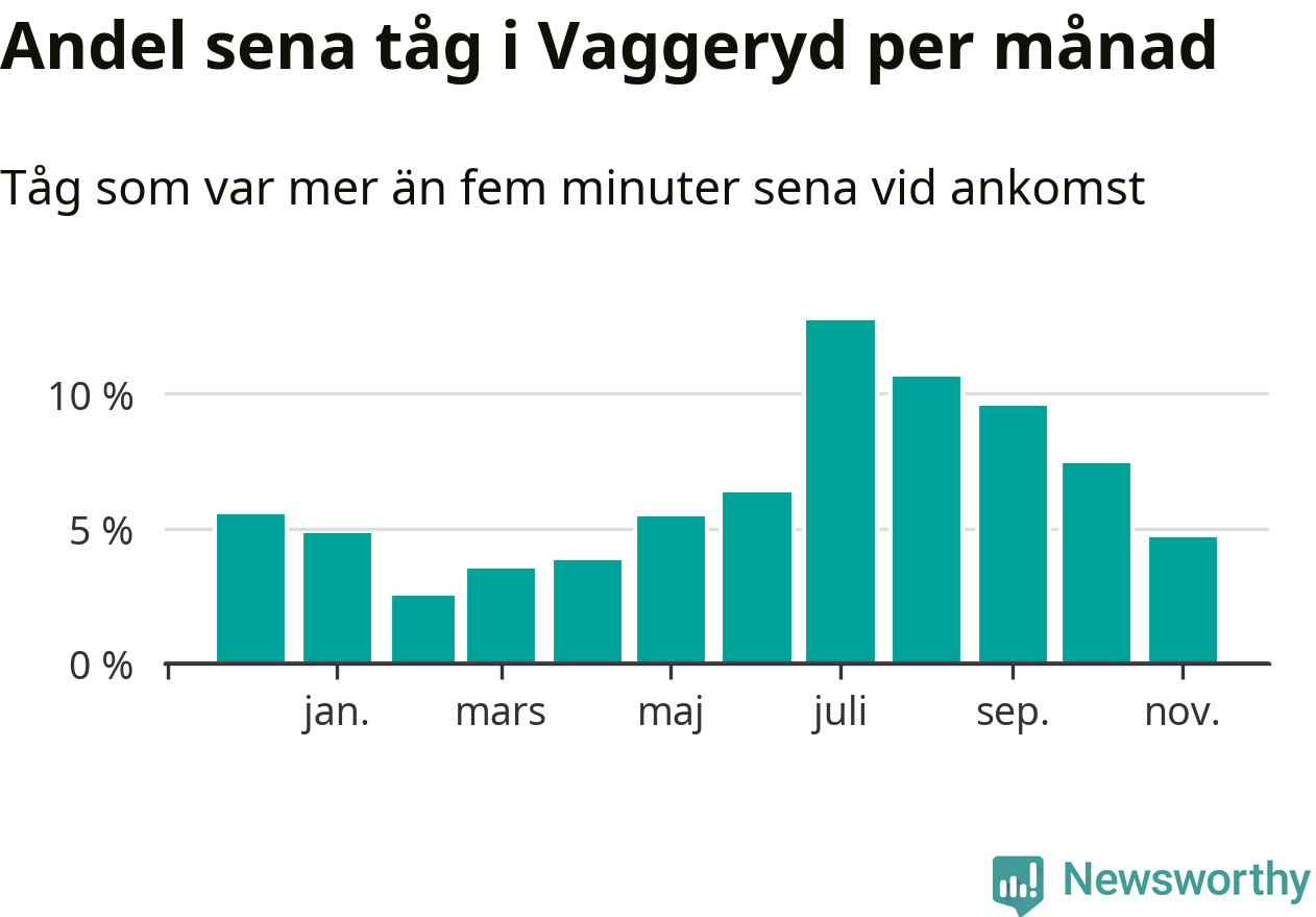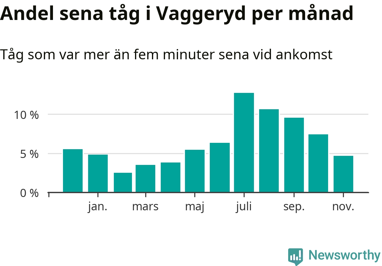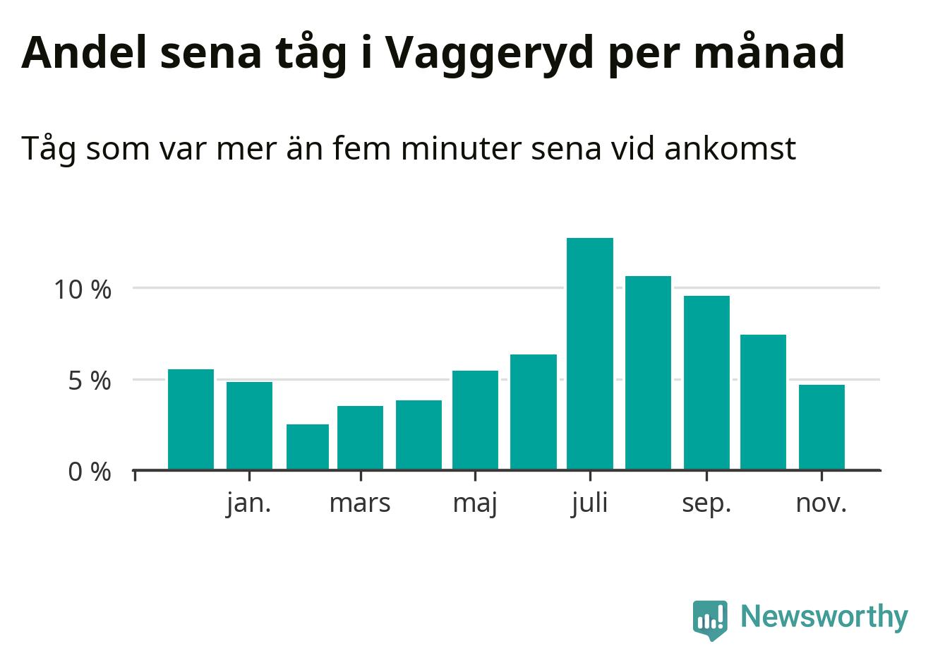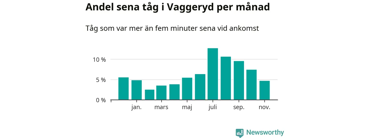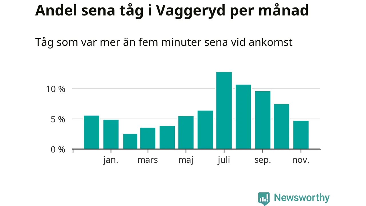 Under det senaste året har sex procent av tågen varit sena när de passerat Vaggeryds kommun. Ett tåg räknas här som sent om det varit mer än fem minuter efter tidtabellen.1
