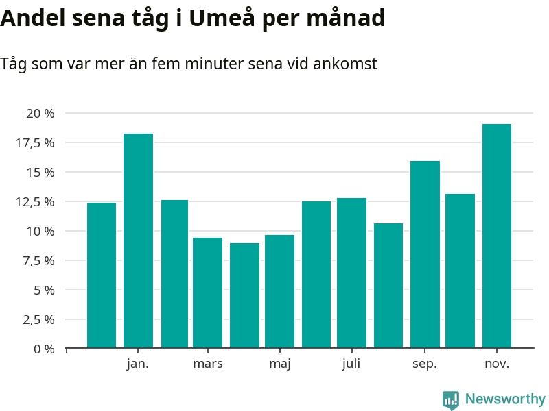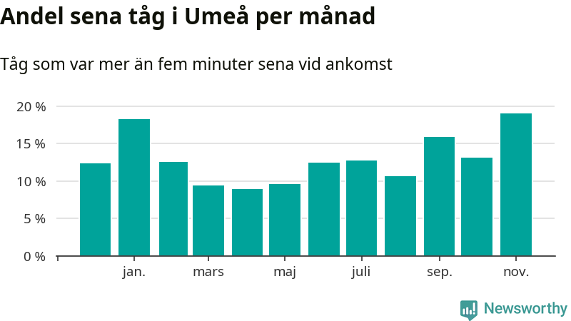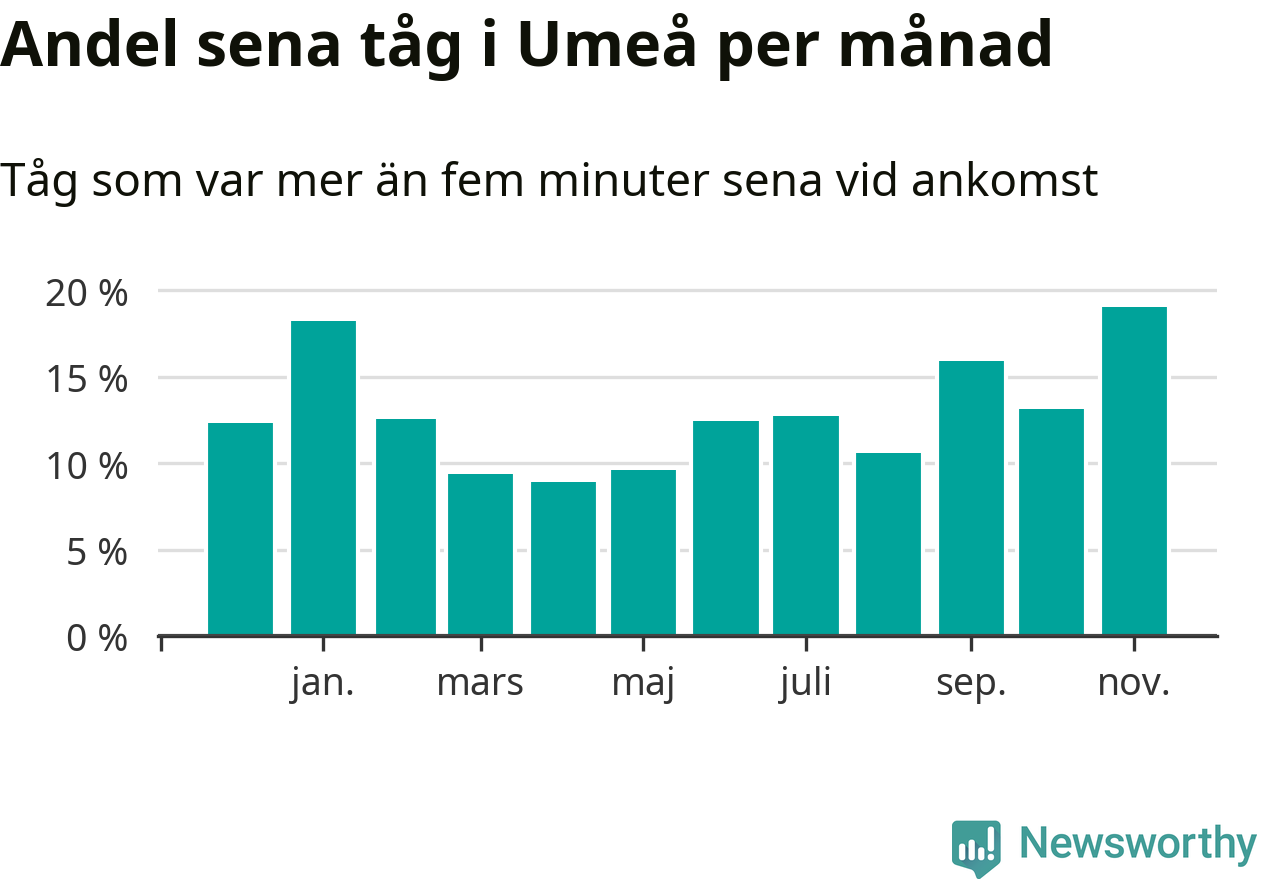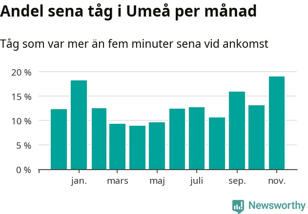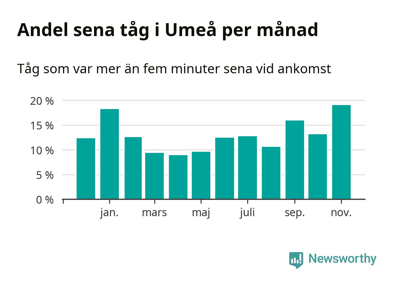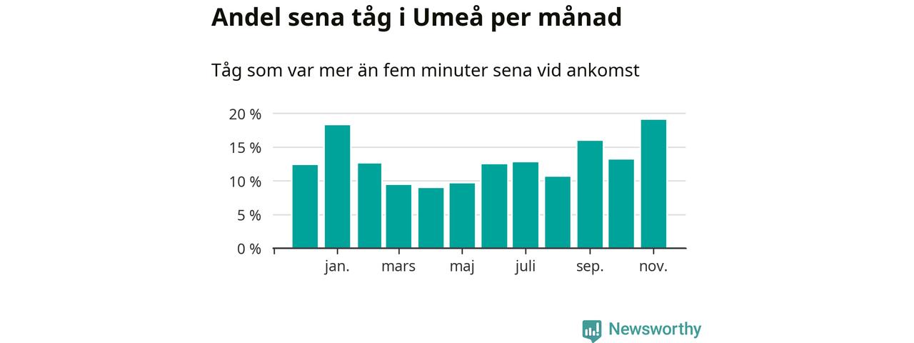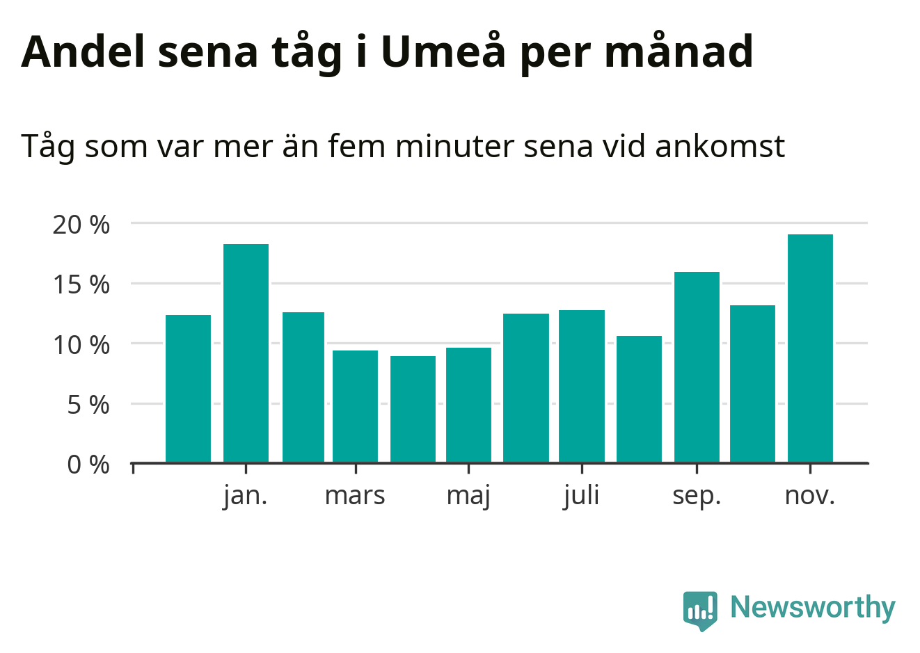Den mest förseningsdrabbade månaden var november, med i snitt 19 procent sena tåg enligt det måttet. Det senaste halvåret har andelen sena tåg varit högre än genomsnittet för halvåret innan dess.