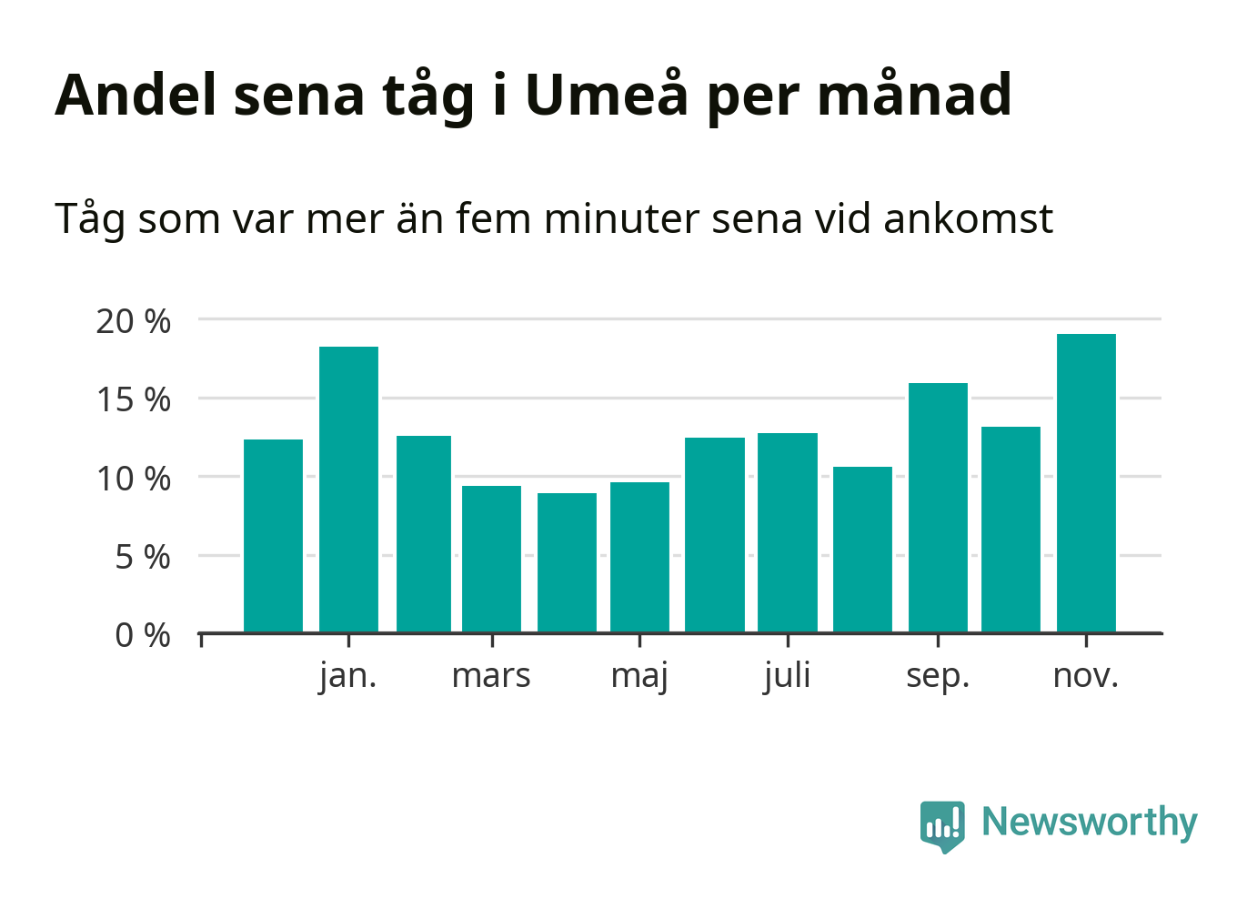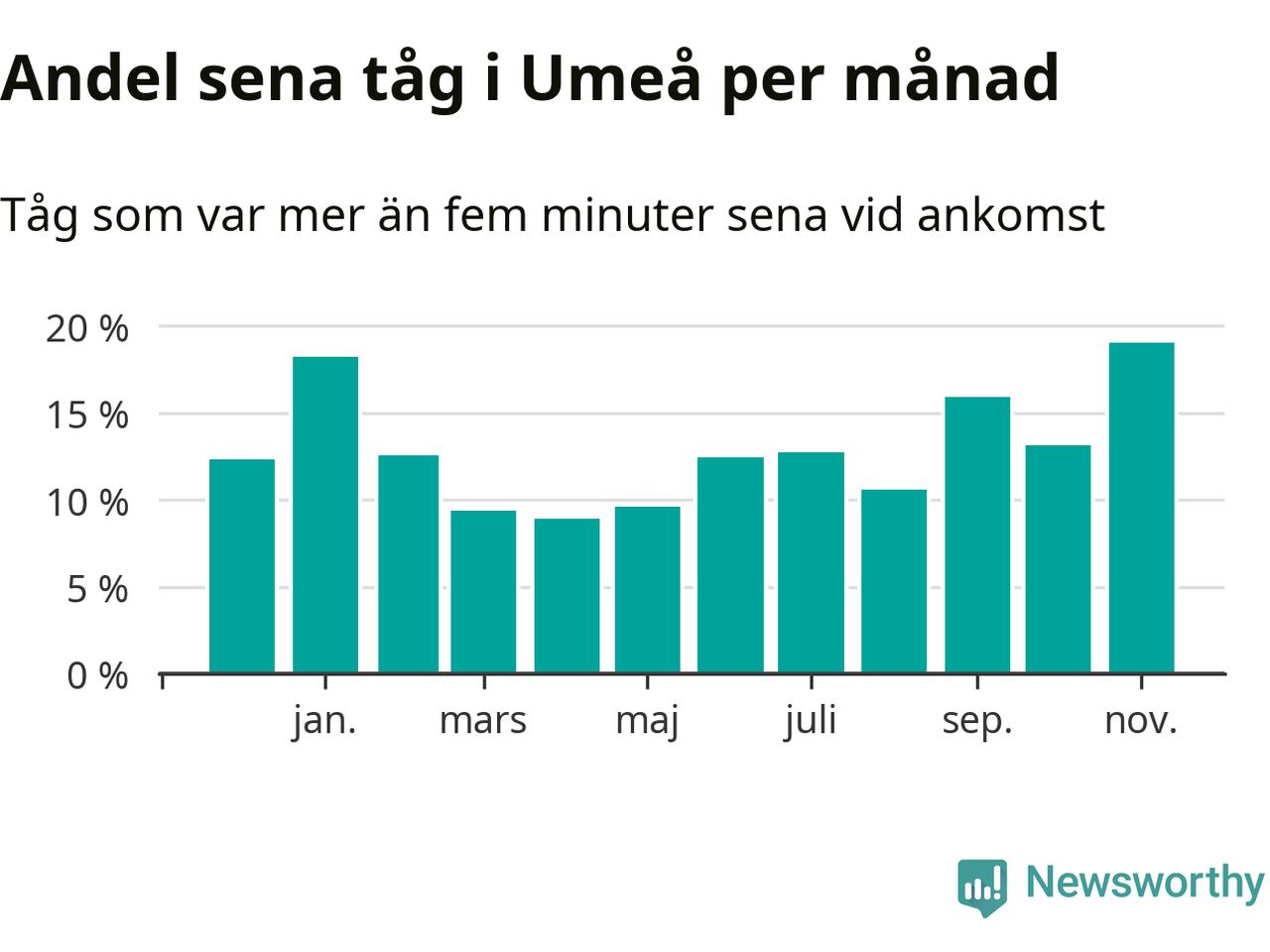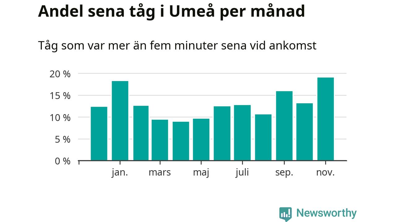Under det senaste året har 13 procent av tågen varit sena när de passerat Hörnefors station, Umeå C eller Umeå Ö i Umeå kommun. Ett tåg räknas här som sent om det varit mer än fem minuter efter tidtabellen.1