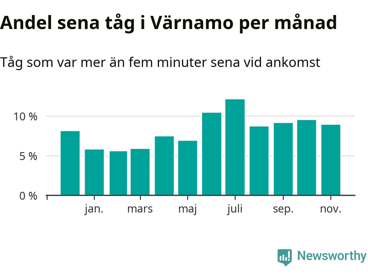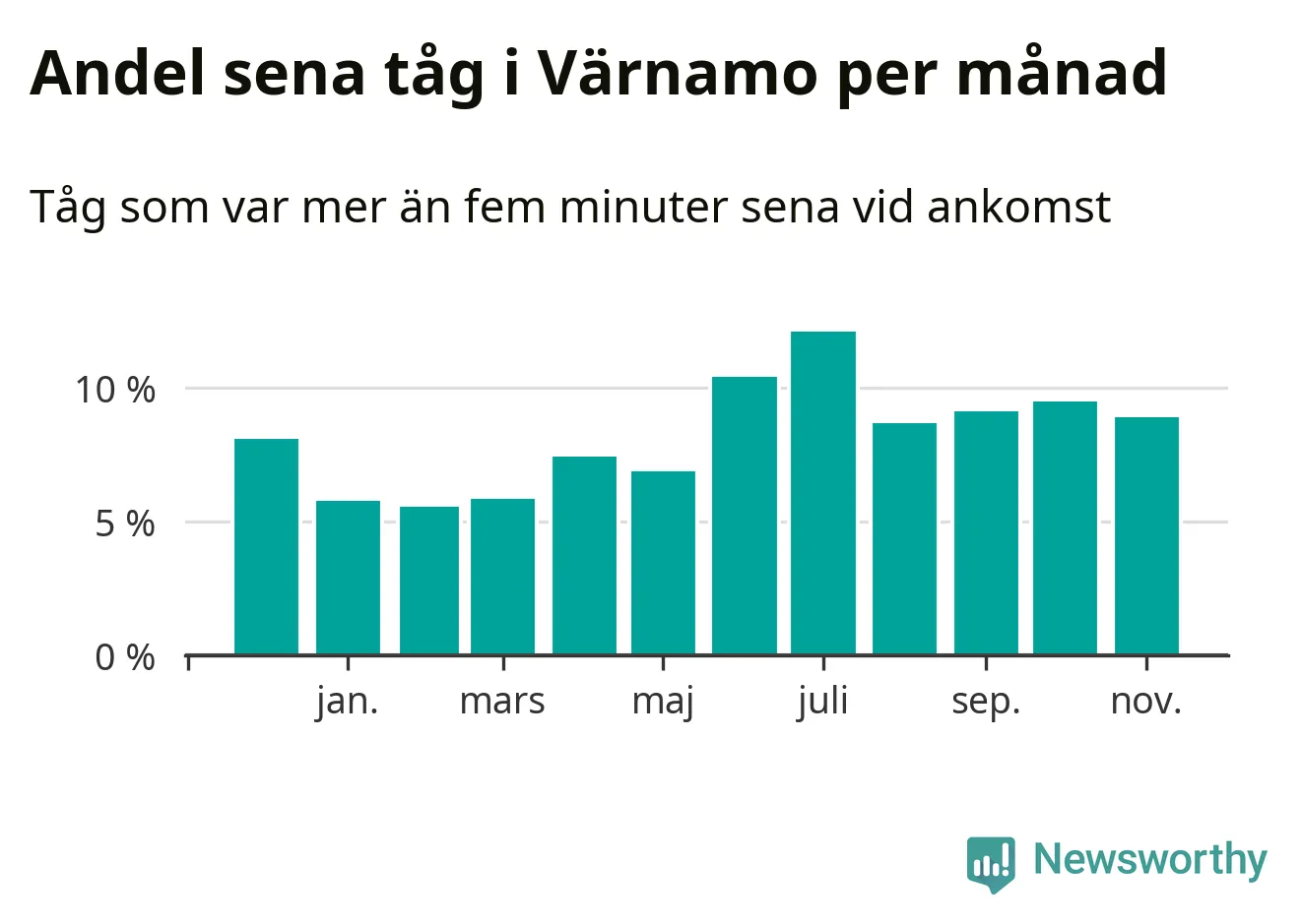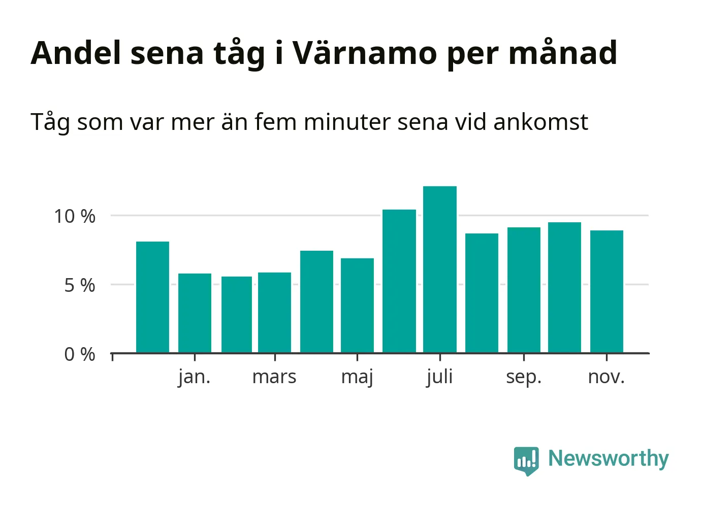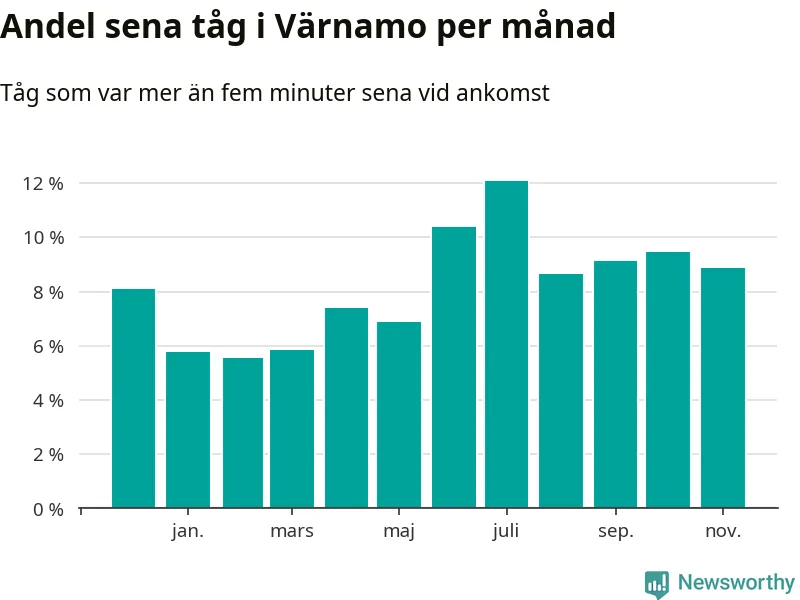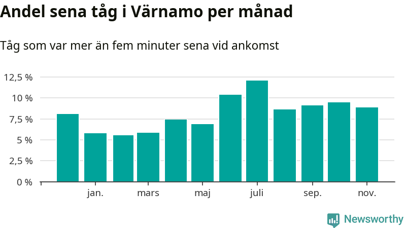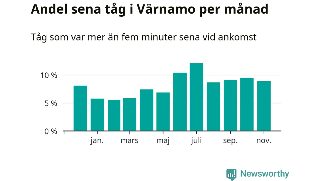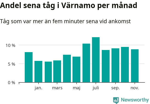 Den mest förseningsdrabbade månaden var juli, med i snitt tolv procent sena tåg enligt det måttet. Det senaste halvåret har andelen sena tåg varit högre än genomsnittet för halvåret innan dess.