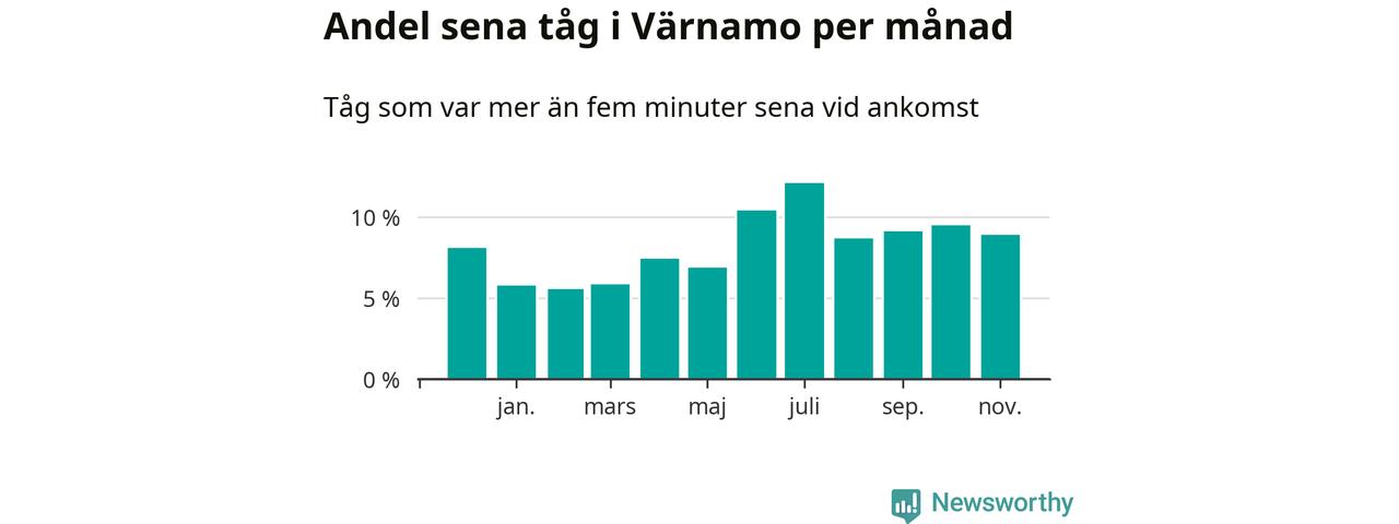 Den svenska järnvägsbranschen och Trafikverket har ett gemensamt mål om att 95 procent av tågen ska komma fram med högst fem minuters försening till sin slutstation. Tågtrafiken i Värnamo låg på rätt sida om den gränsen fem av 52 veckor det senaste året, även om det officiella punktlighetsmåttet (ankomst till slutstation) inte är rakt av jämförbart med det som används i den här artikeln (där vi tittar på alla tåg som passerar en station).