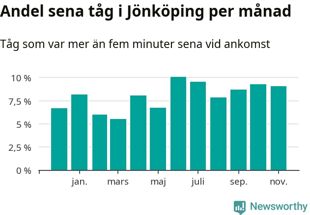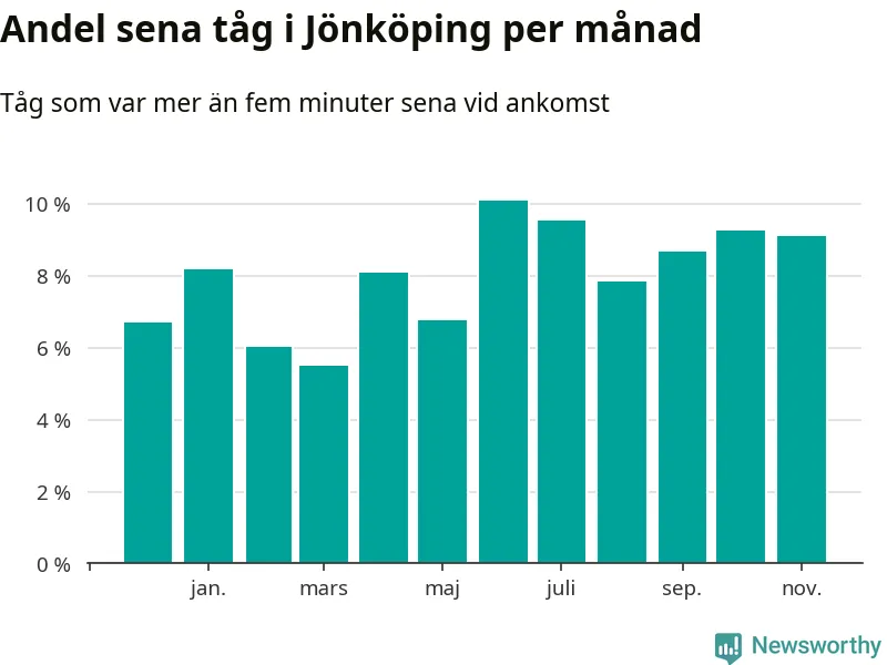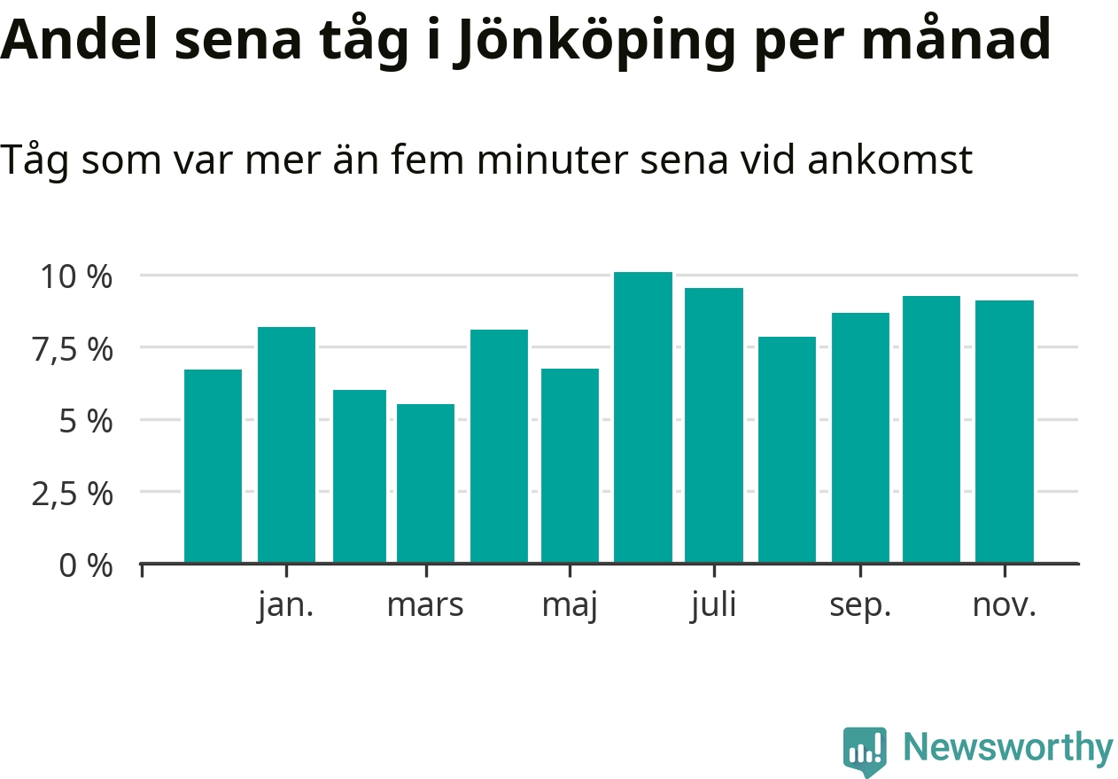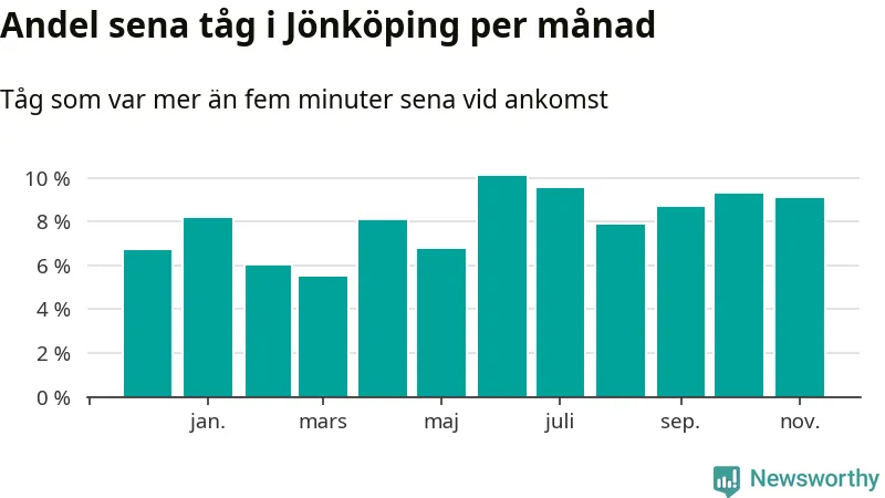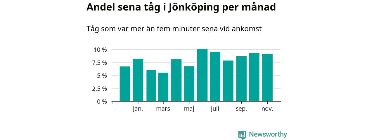 Den mest förseningsdrabbade månaden var juni, med i snitt tio procent sena tåg enligt det måttet. Det senaste halvåret har andelen sena tåg varit högre än genomsnittet för halvåret innan dess.