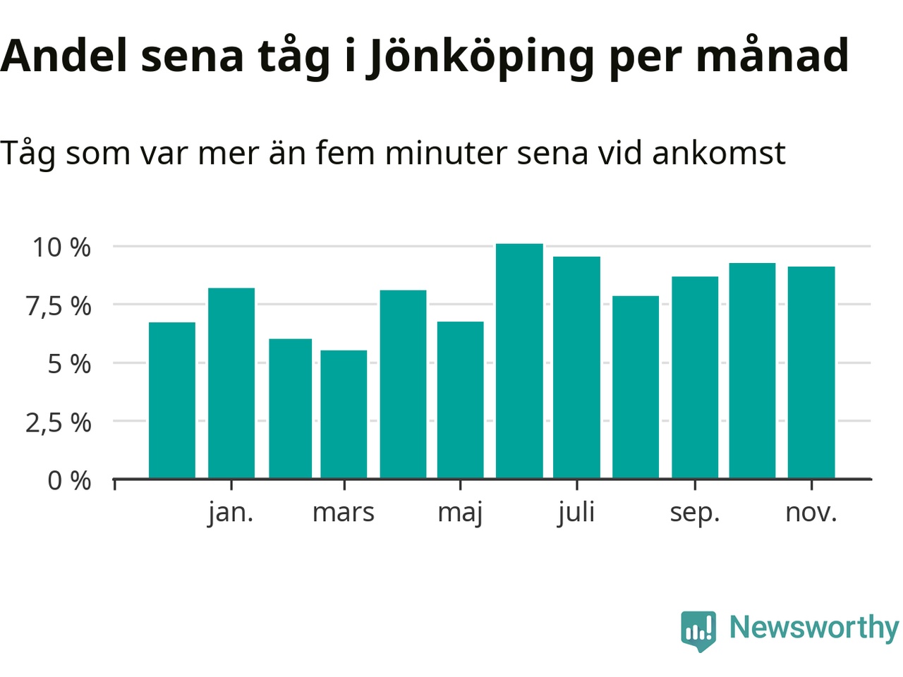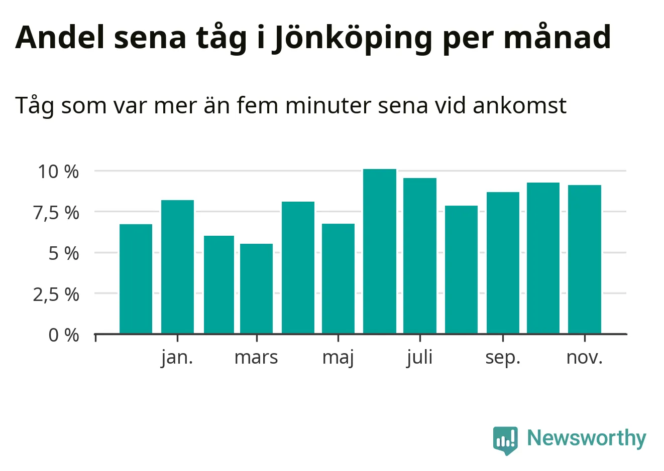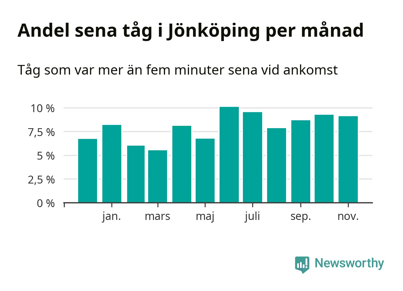 Den mest förseningsdrabbade månaden var juni, med i snitt tio procent sena tåg enligt det måttet. Det senaste halvåret har andelen sena tåg varit högre än genomsnittet för halvåret innan dess.