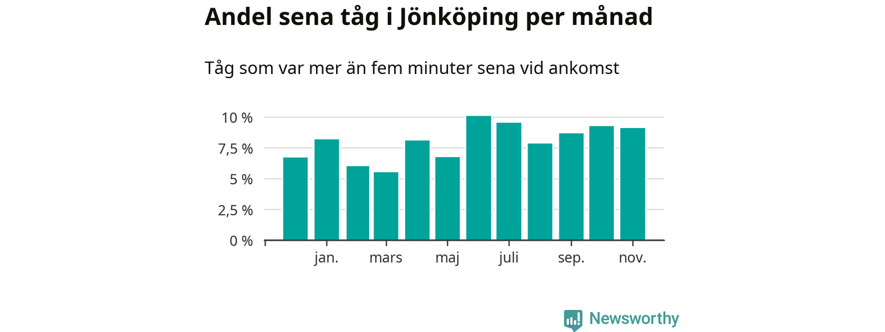 Den svenska järnvägsbranschen och Trafikverket har ett gemensamt mål om att 95 procent av tågen ska komma fram med högst fem minuters försening till sin slutstation. Tågtrafiken i Jönköpings län låg på rätt sida om den gränsen fem av 52 veckor det senaste året, även om det officiella punktlighetsmåttet (ankomst till slutstation) inte är rakt av jämförbart med det som används i den här artikeln (där vi tittar på alla tåg som passerar en station).