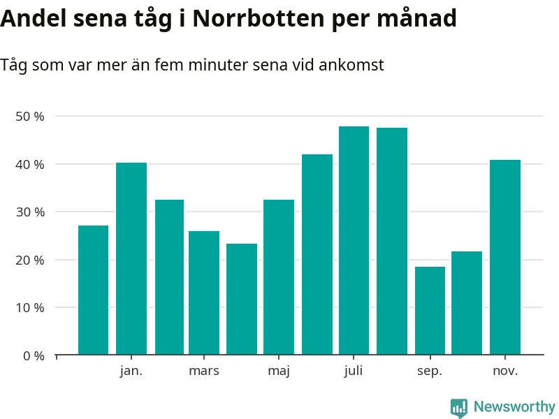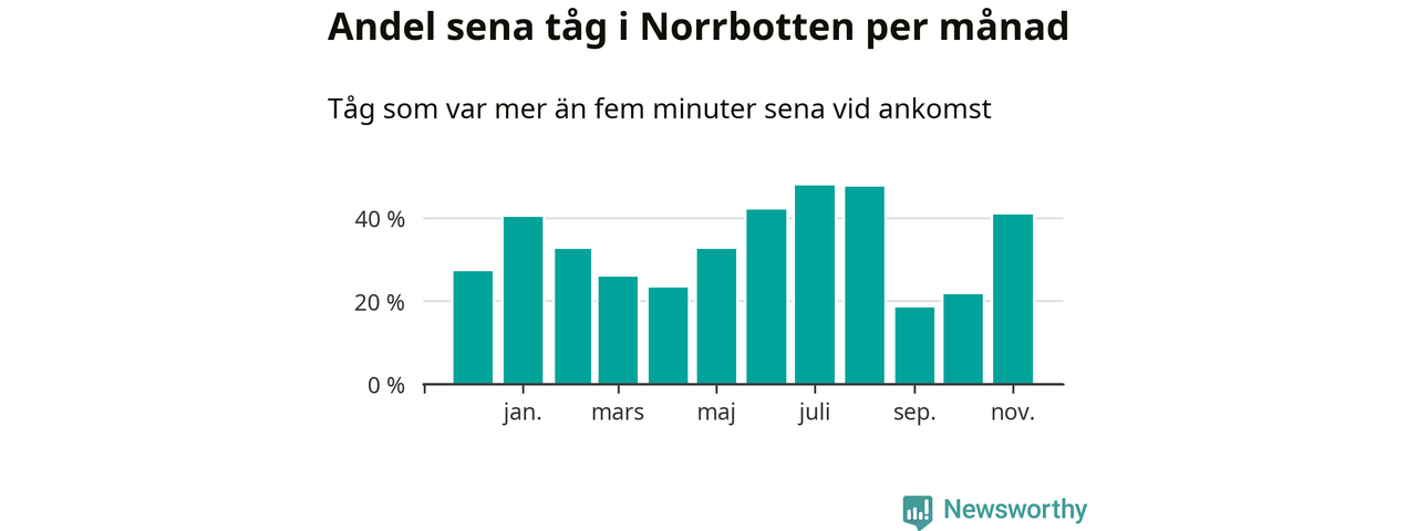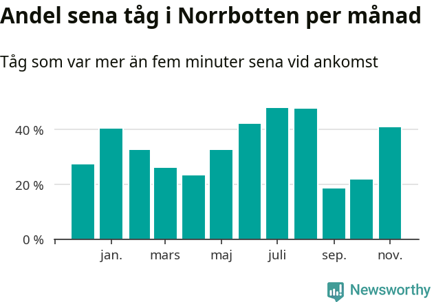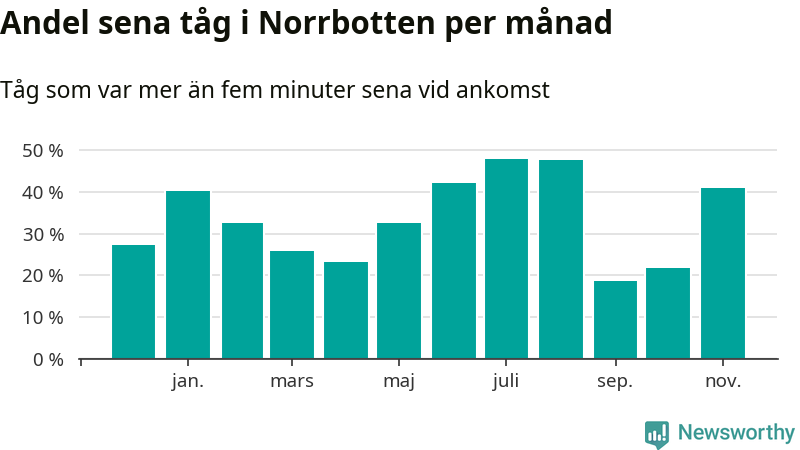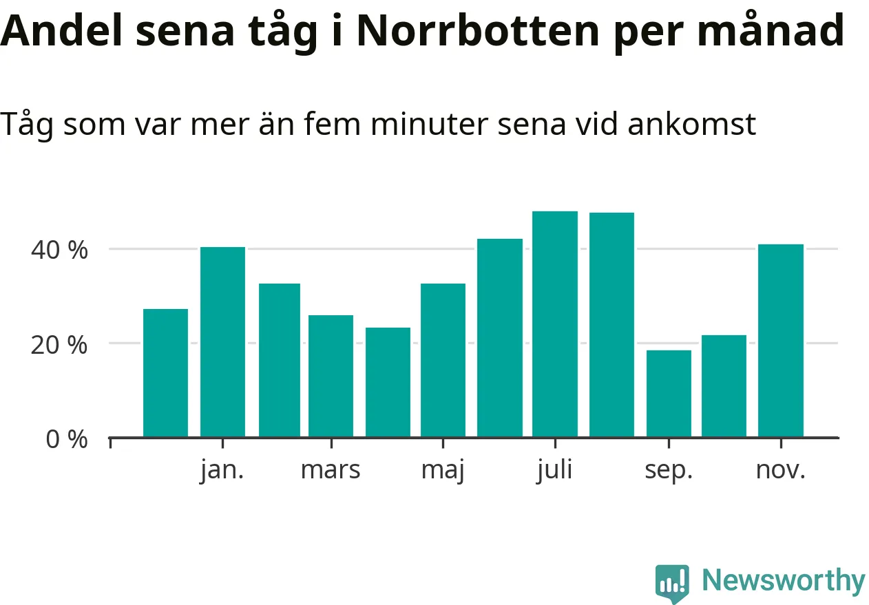 Den mest förseningsdrabbade månaden var juli, med i snitt 48 procent sena tåg enligt det måttet.