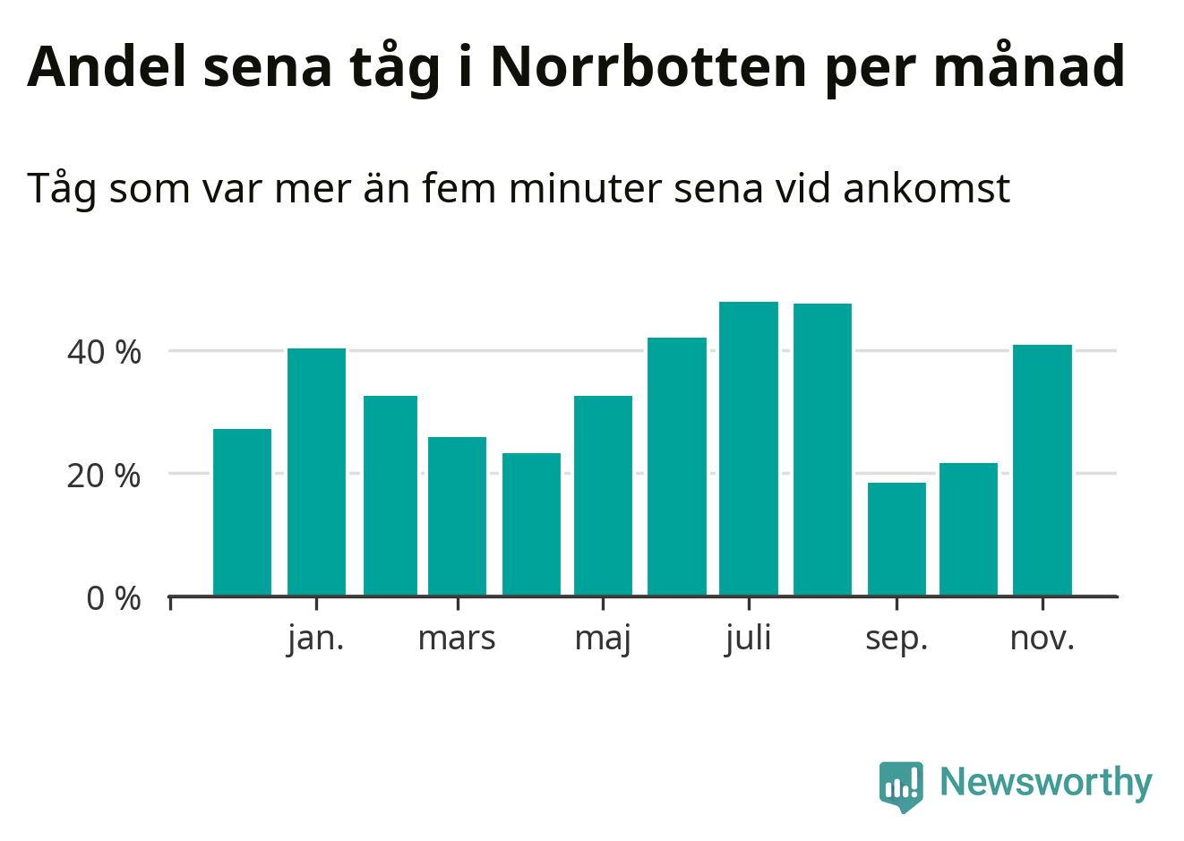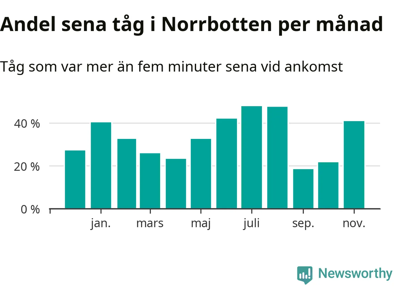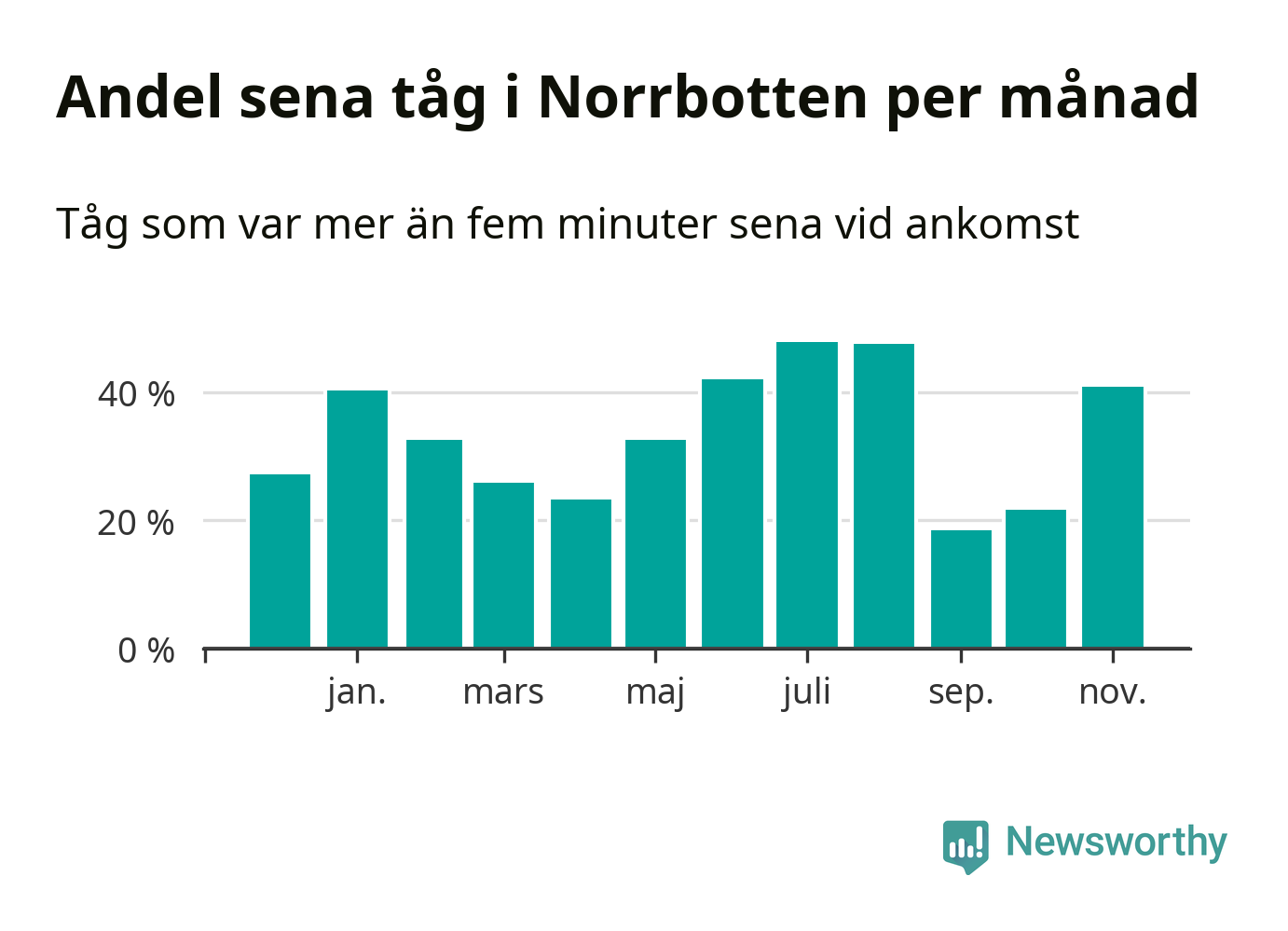 Den mest förseningsdrabbade månaden var juli, med i snitt 48 procent sena tåg enligt det måttet.