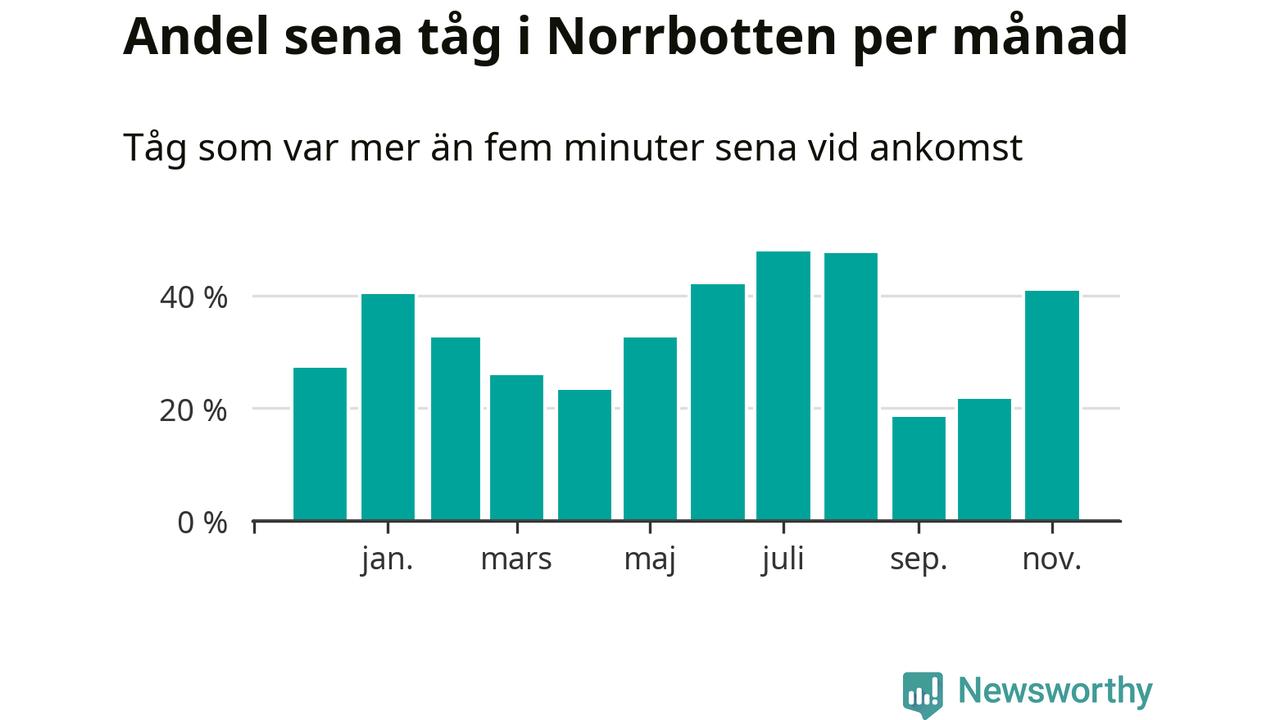 Under det senaste året har 33 procent av tågen varit sena när de passerat Norrbottens län. Ett tåg räknas här som sent om det varit mer än fem minuter efter tidtabellen.1