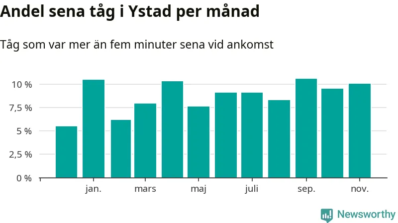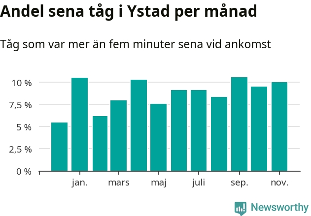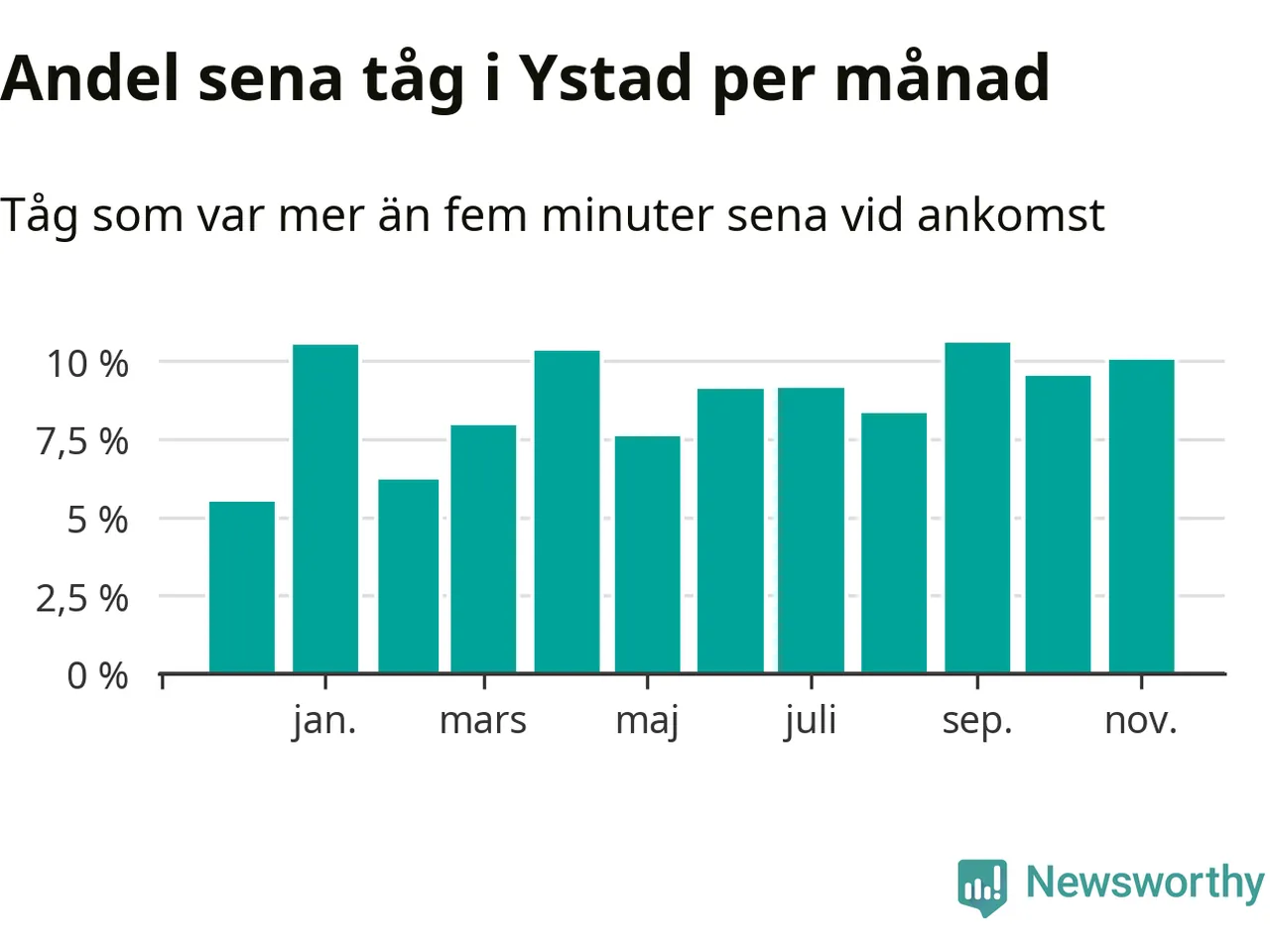 Det senaste halvåret har andelen sena tåg vid stationerna i Ystads kommun varit högre än halvåret innan dess. Newsworthy och Sveriges Natur har studerat tågens punktlighet det senaste året, på jakt efter järnvägens flaskhalsar.